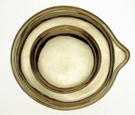 Av förgyllt silver, rundad botten och övergång till brättet, rundat brätte med profilerad kant, utvidgning för att täcka kastrullens snås. På undersidan graverat AF under kunglig krona, tre fastlödda förgyllda kulfötter.