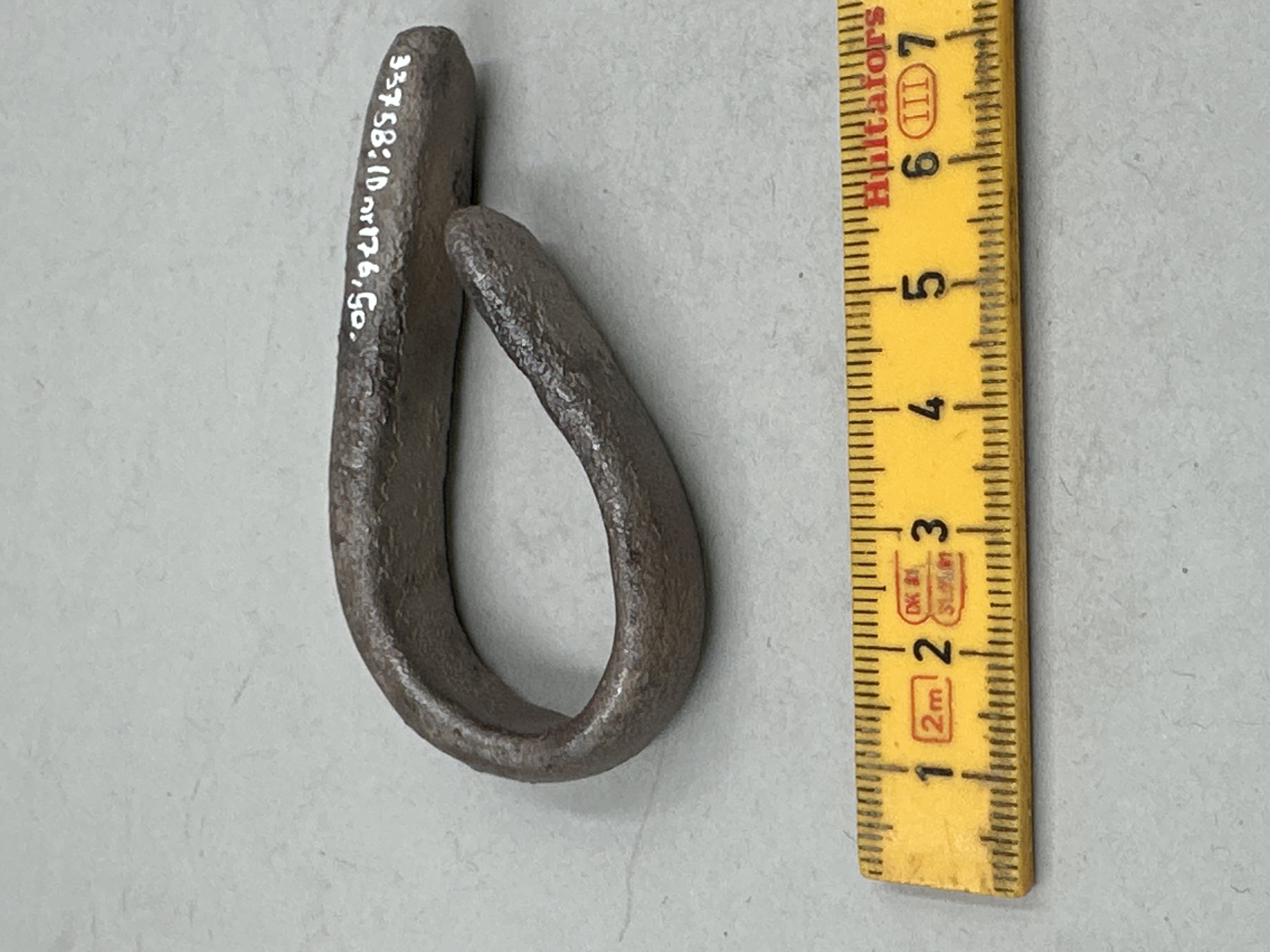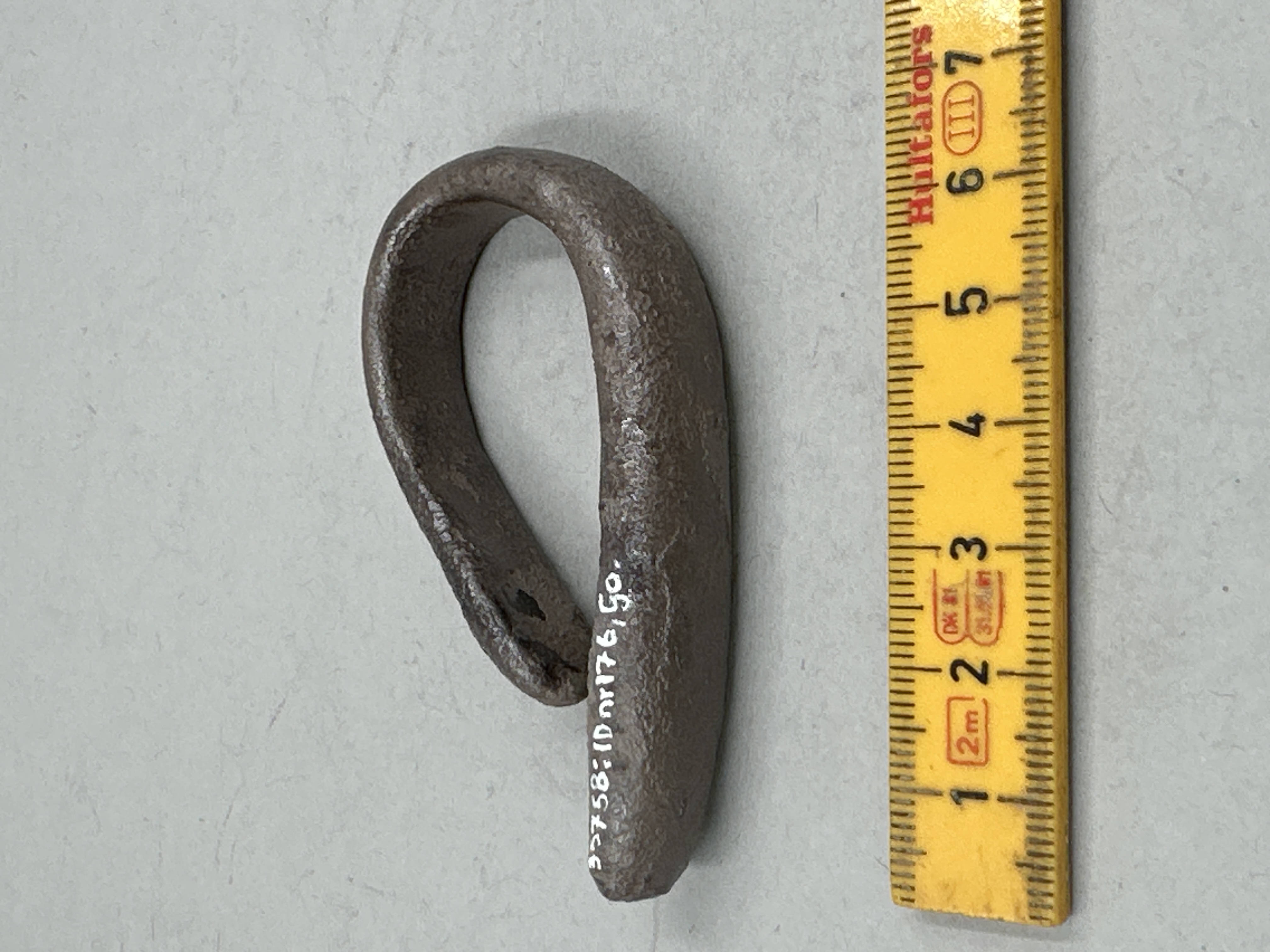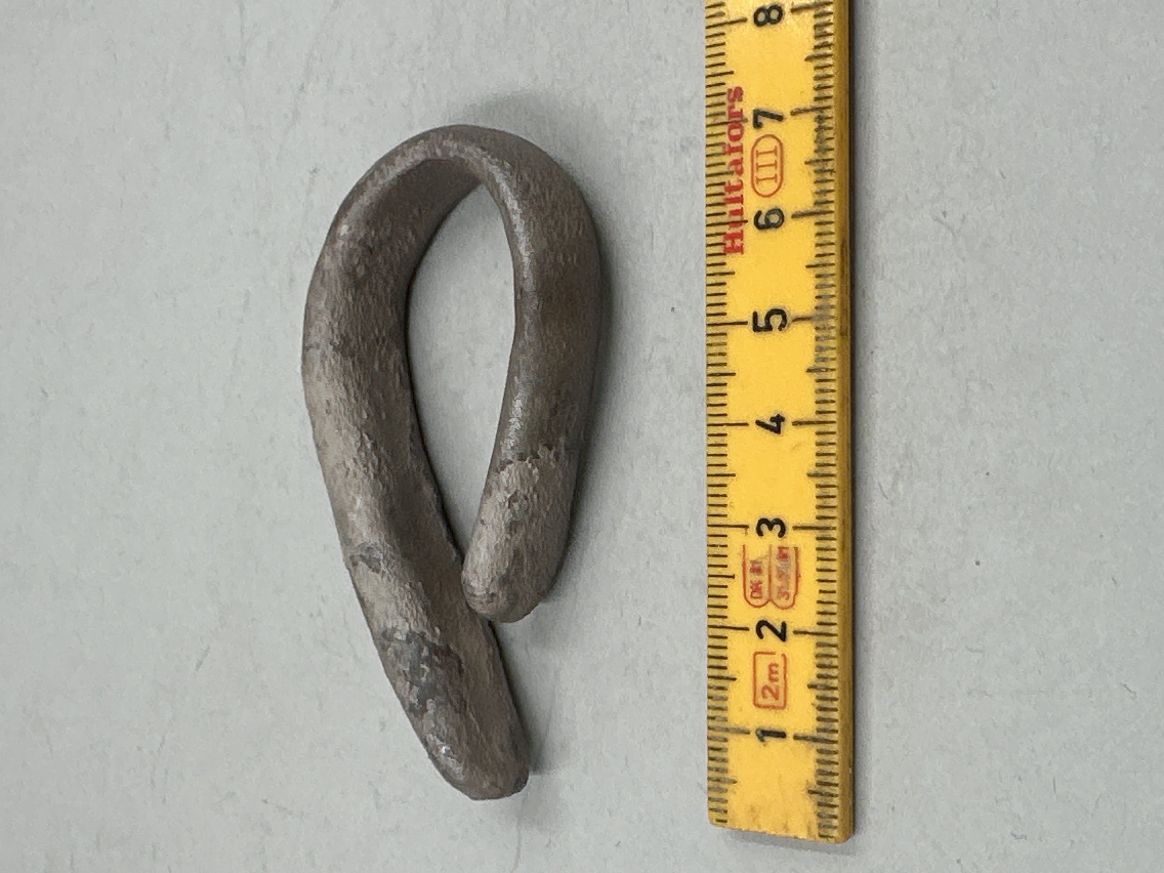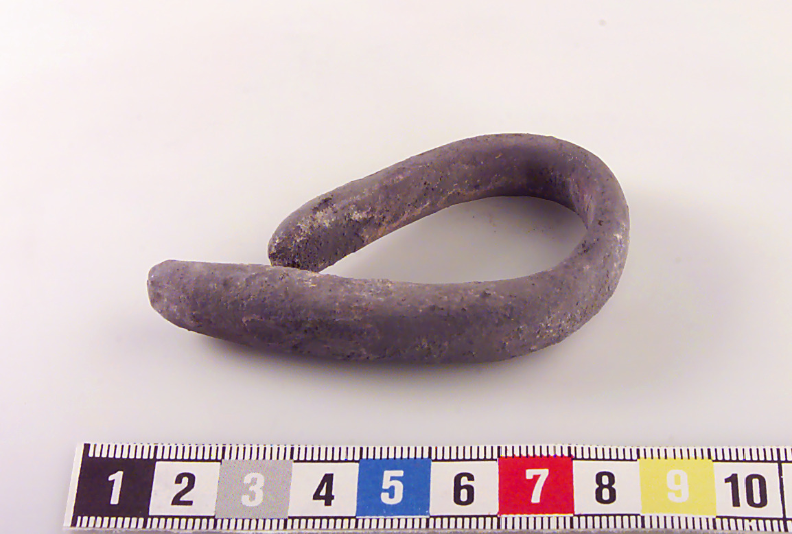 Oregelbundet rektangulär form, något tjockare i ena änden. Böjd till ögleform. Skadat ytskikt.