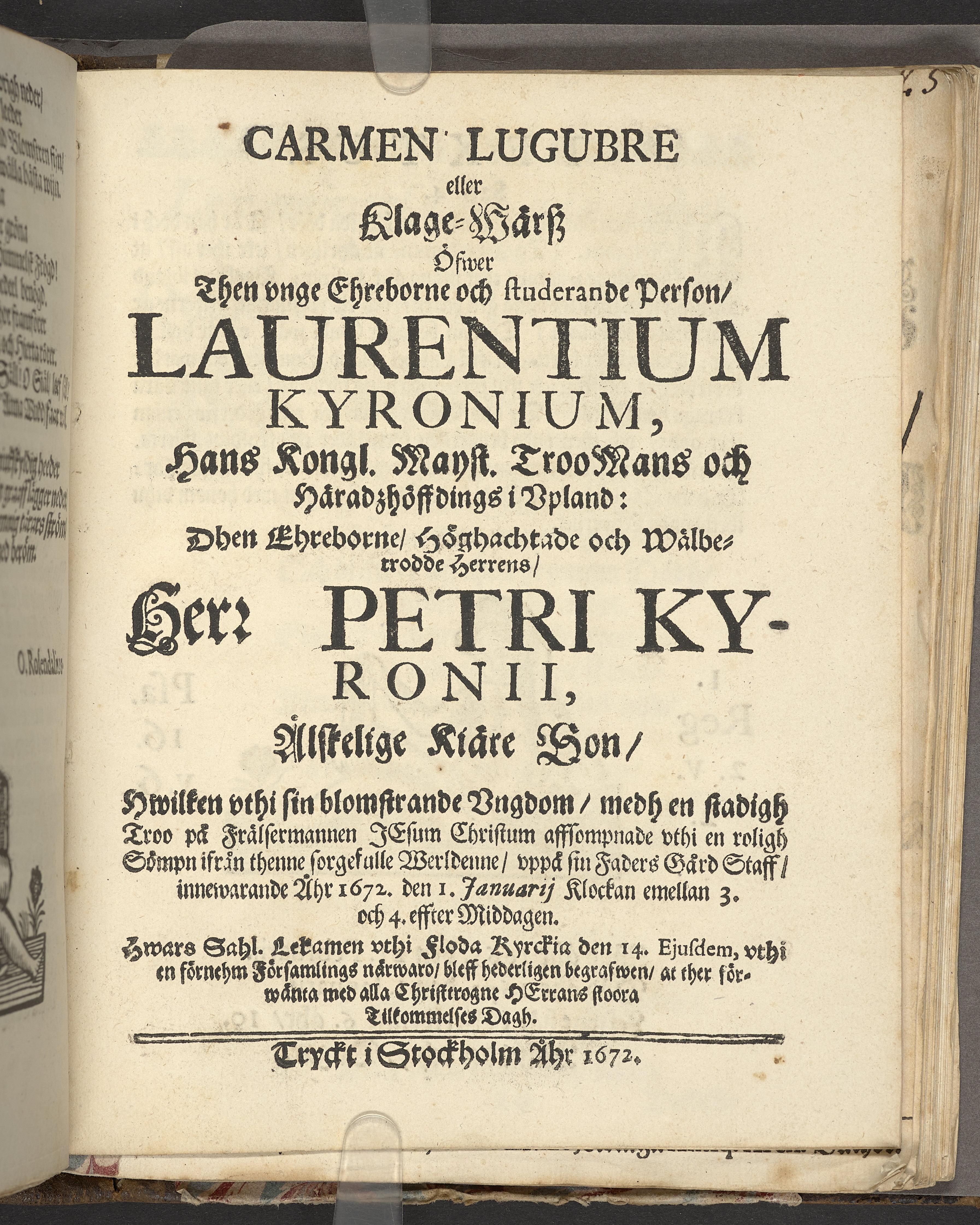 Carmen lugubre eller klage-wärsz öfwer ... Laurentium Kyronium ... häradzhöffdings i Upland ... Herr Petri Kyronii ... son ... hwars sahl. lekamen vthi Floda kyrckia den 14 ejusdem ... bleff ... begrafwen ... Tryckt i Stockholm åhr 1672.