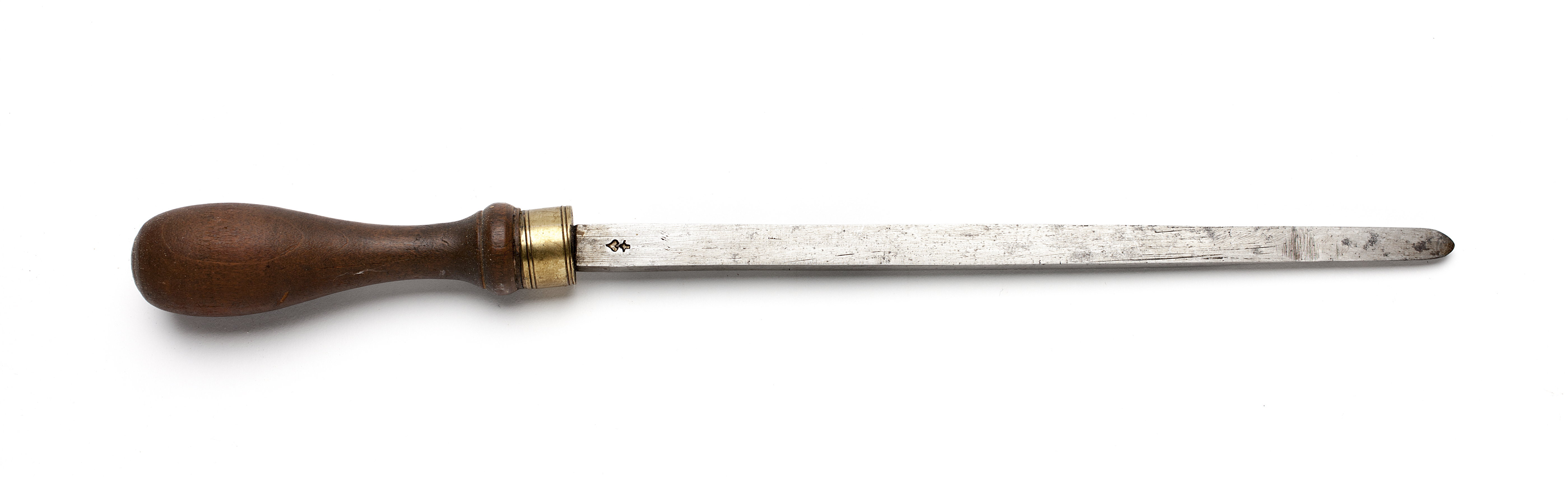 Klinga med rektangulär genomskärning. Undre kanterna avfasade i änden. Stämplat på klingan: hjärta under kors. Svarvat skaft av päronträ, med en vulst nedtill. Mässingsring.