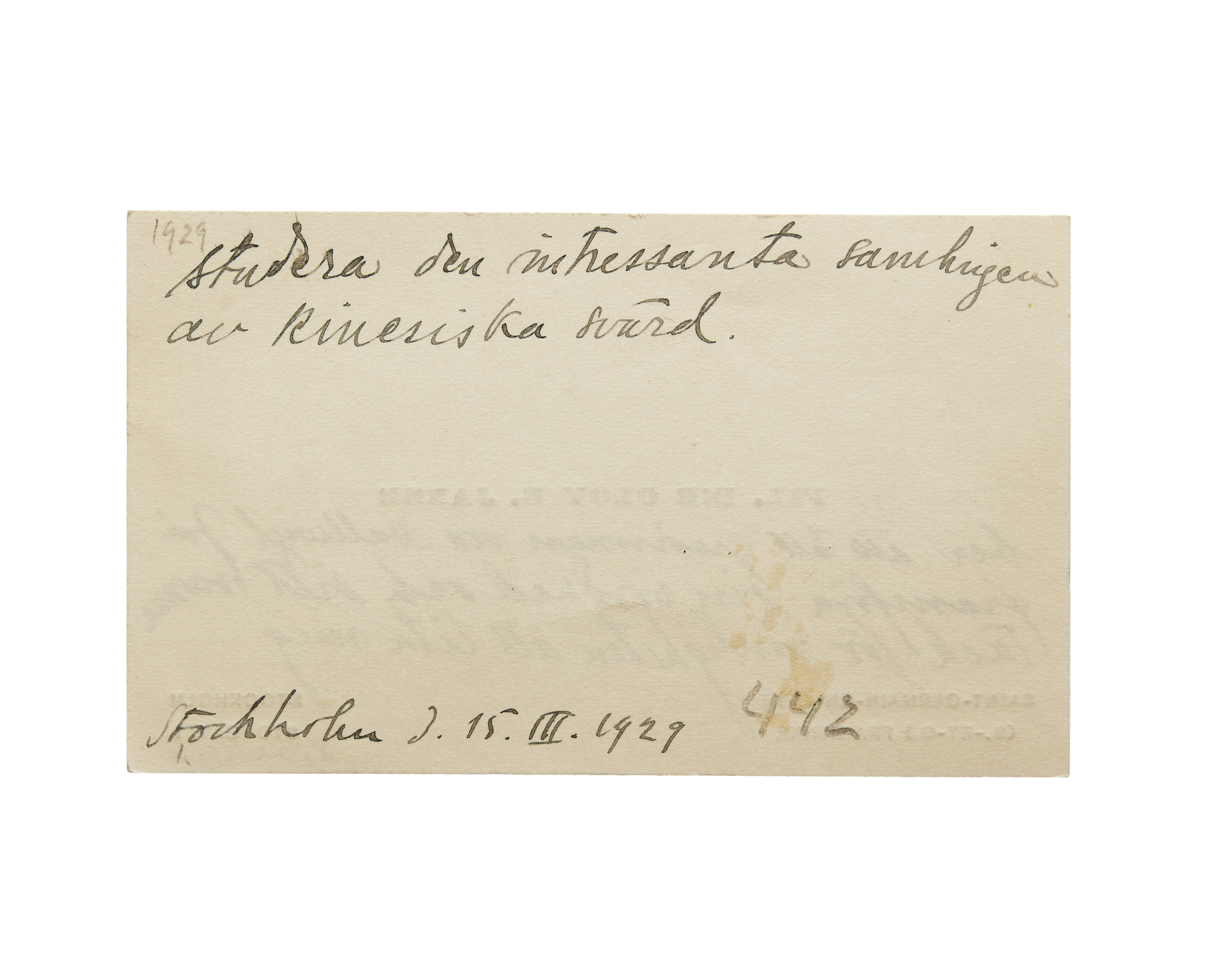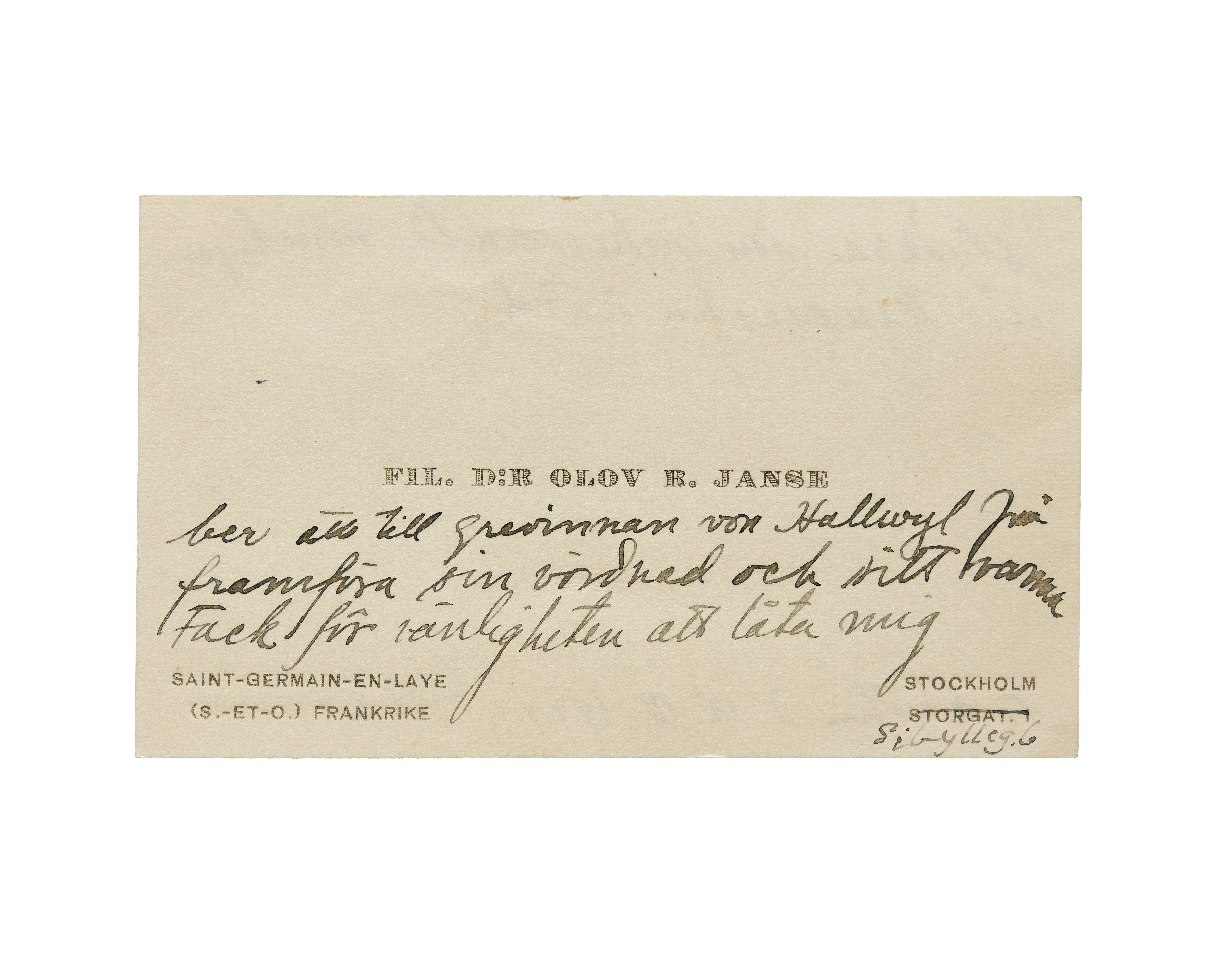 Ett visitkort från Fil. D:r Olov R. Janse, daterat 1929. Adress (nedre vänstra hörnet) Saint-Germain-En-Laye (S,-ET-O.) Frankrike, (nedre högra hörnet) Stockholm, Storgat. 1. Handskrift "...".