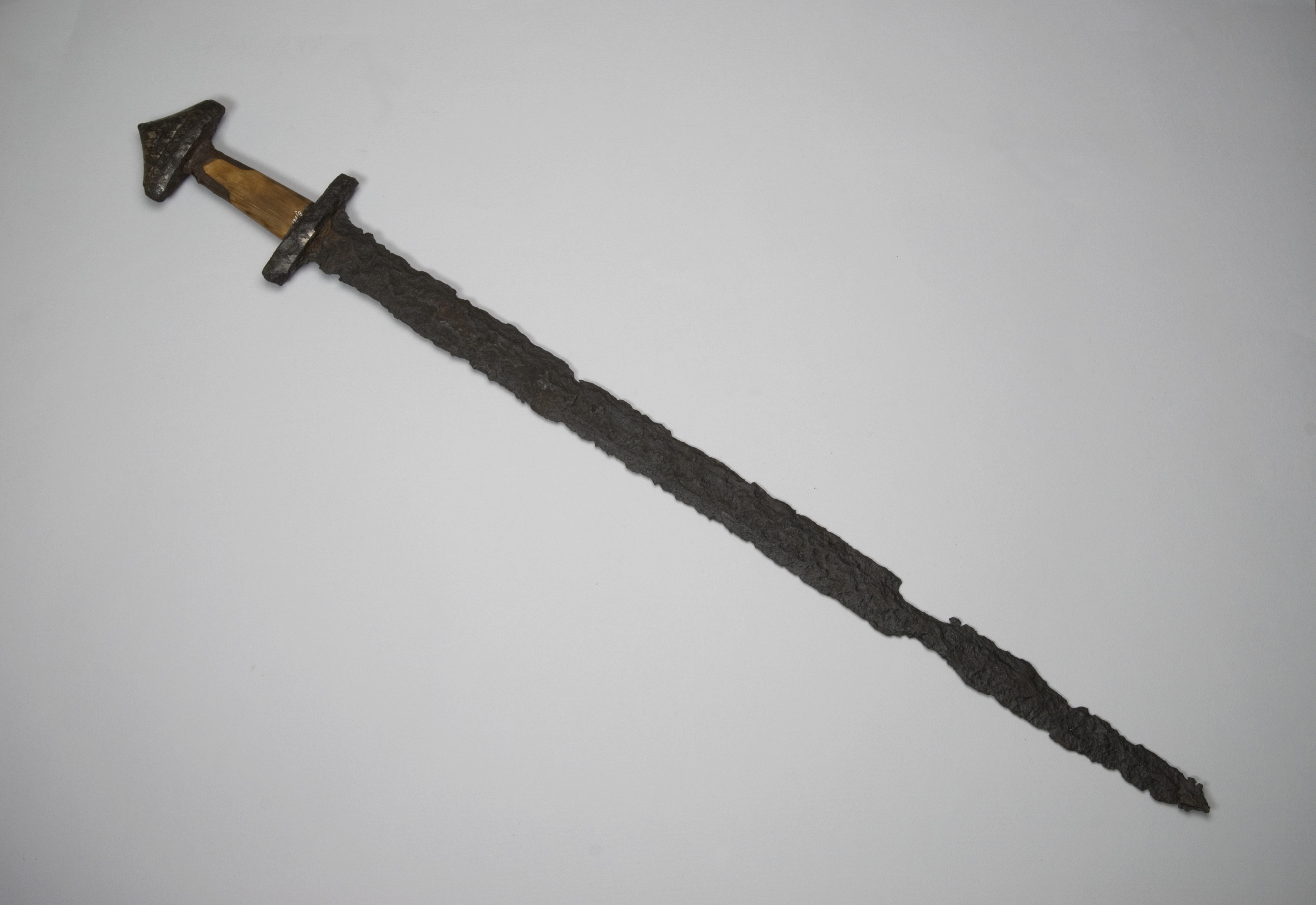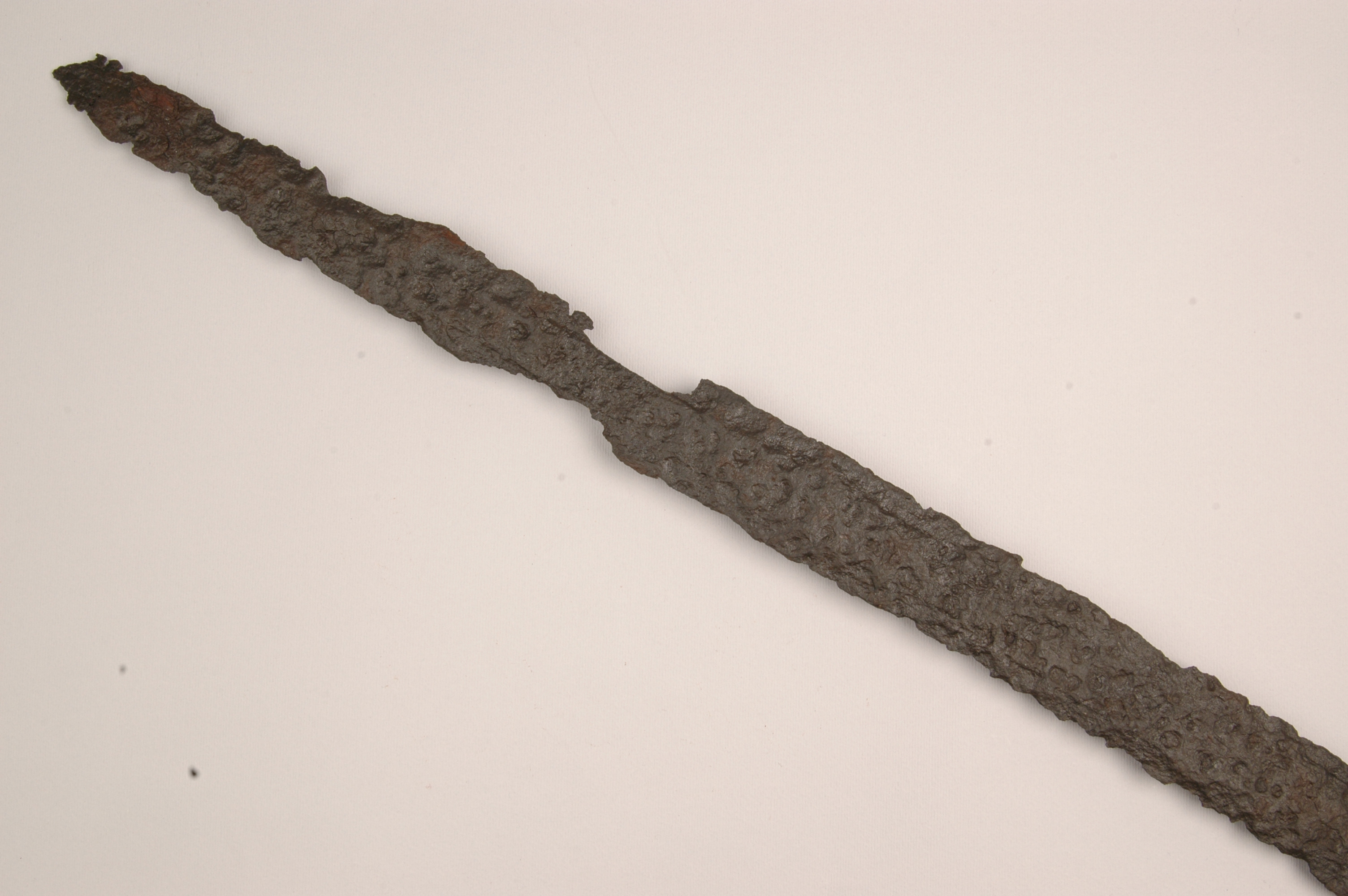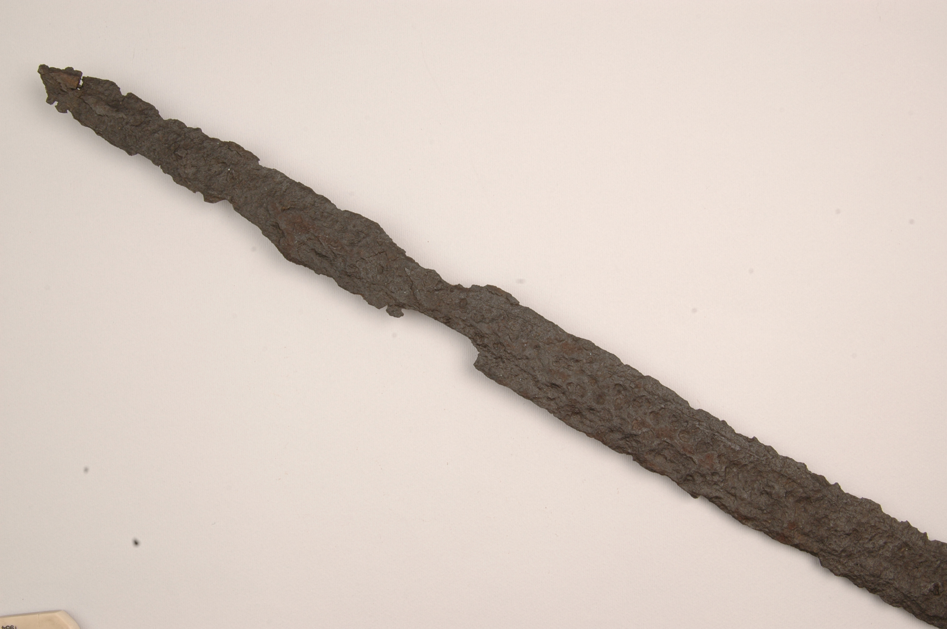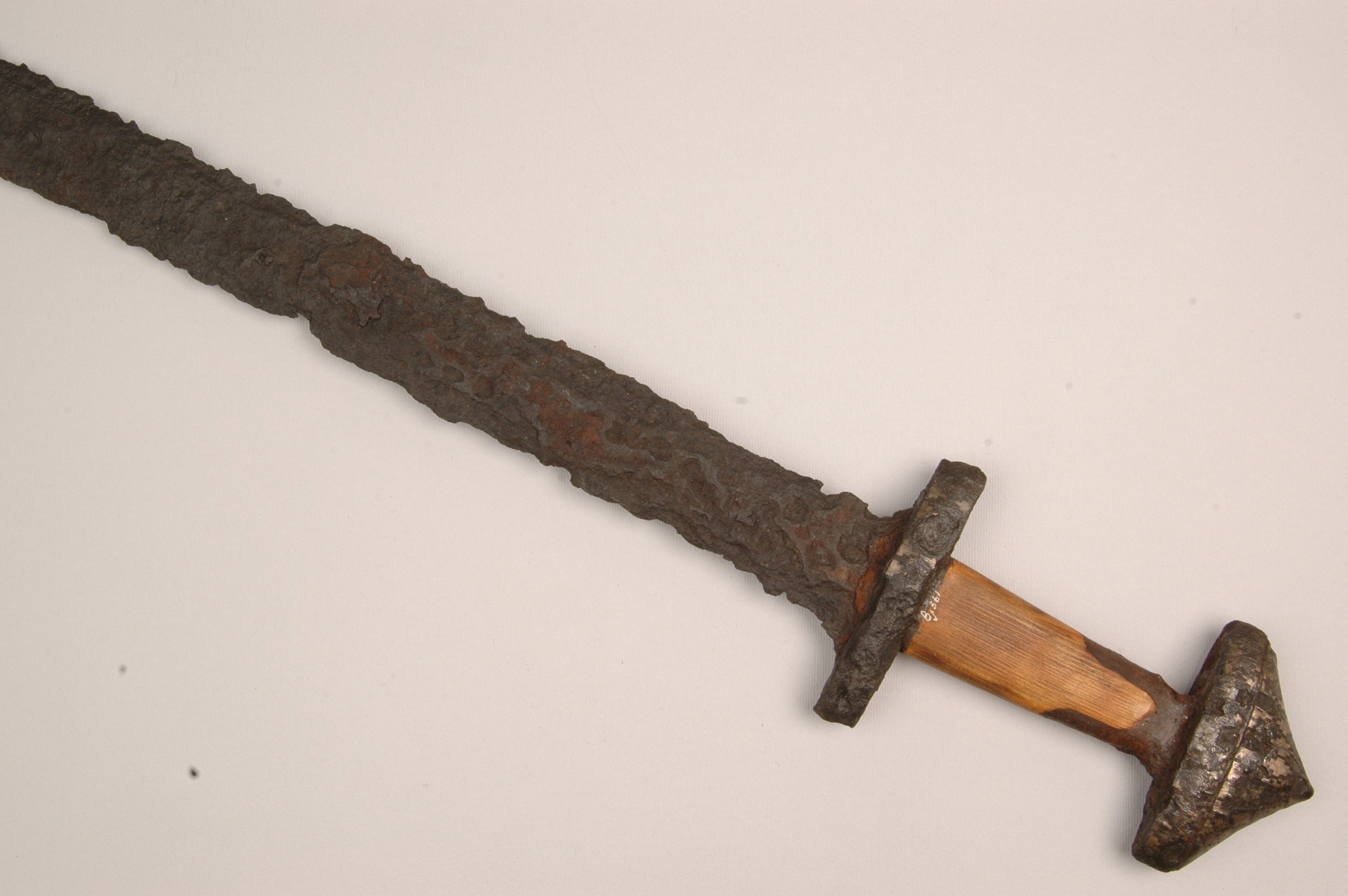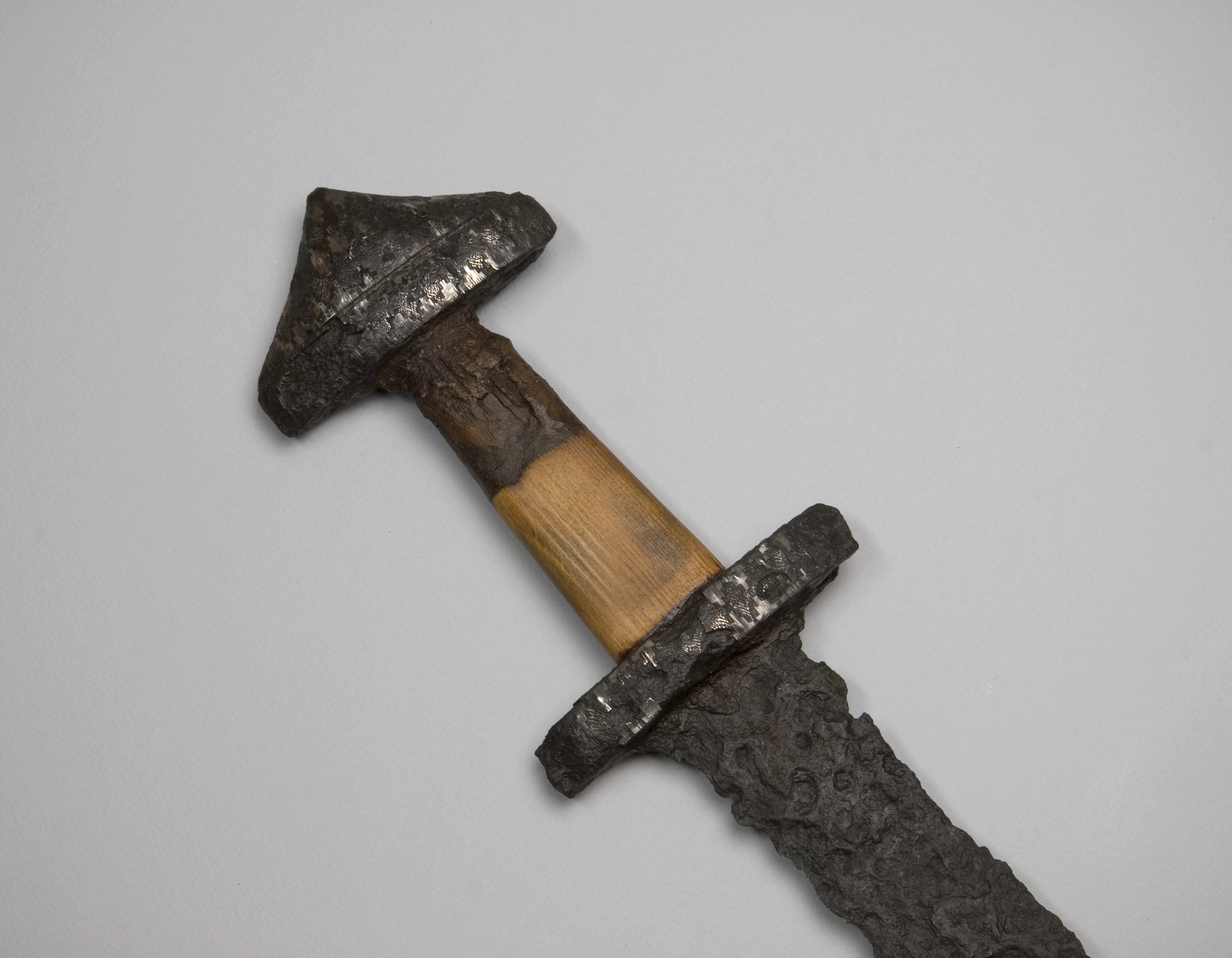 Tveeggat svärd med parerstång och ett rekonstruerat trähandtag, den trekantiga knappen och parerstången är ornerad med mönster i silver och koppar (?). Spetsen och del av klingan är borta. Röntgenundersökt.
