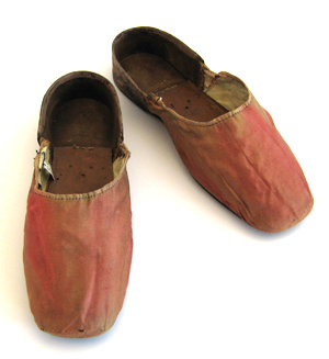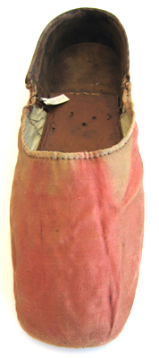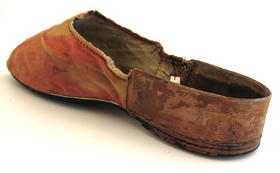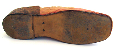 Galosch med ovanläder av röd sidenatlas och med en 40 mm hög bakkappa av rödmålat läder. Bakkappa och framkappa är ihopsydda på sidan. Framstycket kantas av en 4-5 mm bred, omvikt fåll. Galoschen har en rak tå med rundade kanter. Galoschen är rak dvs den är varken anpassad höger- eller vänster fot. Klack och sula är av brunt pressat skinn. Klacken är 73 lång, 66 mm bred och 7 mm hög. Sulan är 3 mm tjock och den bredaste bredden är 85 mm. Framstycket är fodrat med vitt skinn, skarvat på sidan och bakstycket av brunt läder. Innersulan är av brunt läder men hälen saknar innersula. Två pinnhålsstämplar mitt under sulan samt en pinnhålsstämpel framme vid tån.