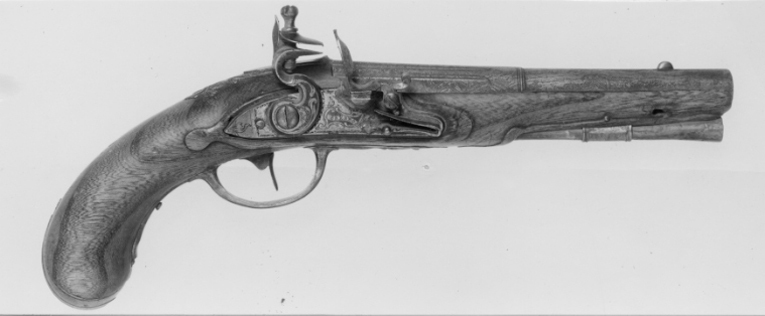 Rund, slätborrad pipa av stål med etsad damaskering. Kantig kammare, på kanterna lister, ytan däremellan svagt välvd. Böjt svansskruvblad av odamaskerat stål med rundat ändblad. Riktmedel: Vid pipbasen klack med skålat sikte. Stolpkorn av mässing. Fästning. Ett häfte. Pipan fäst med krysskruv, bakre låsskruven i hak i svansskruvplattan samt urspr. av ett pipstift. Flintlås av stål med plant låsbleck, fasade kanter och försänkt bakspets. Graverad dekor, på bakspetsen ett blad, på resten av blecket kantlister av sicksacklinjer samt framför hanen en kartusch med textband mot mörkpunsad bakgrund: "ÖREBRO". Kraftigt svängd, s-formig, platt hane med fasade kanter, bladrankor mot mörkpunsad bakgrund. Ovala käkar, käkskruv med päronformigt huvud. Kantig fängpanna med skålad fals, på kanten sicksackbård. Batteri med skålat fängpannelock och fasade kanter, eldstål med åsad rygg, timglasformig fasning, fot med uppsvängd häl, batterifjäder med rombiskt, åsat löv. Fästning: Två låsskruvar. Svagt böjd avtryckare. Konturerat avtryckarbleck. Helstock av valnöt med snidad rokokodekor vid svansskruvblad och varbygelns framände. Beslag av stål. Kolvkappa med flik på kolvryggen, mittlist med skålade kantfasningar, bladrankor mot punsad bakgrund. Helt sidbleck med fasade kanter, graverade kantlister och bladvoluter. Kantig rörka. Platt varbygel med fasade kanter, främre armen 8-formig med fjäderformigt ändblad, rundat ändblad på bakarmen, vid bladet graverat: 2. Tillbehör: Laddstock av trä (fasttorkad).