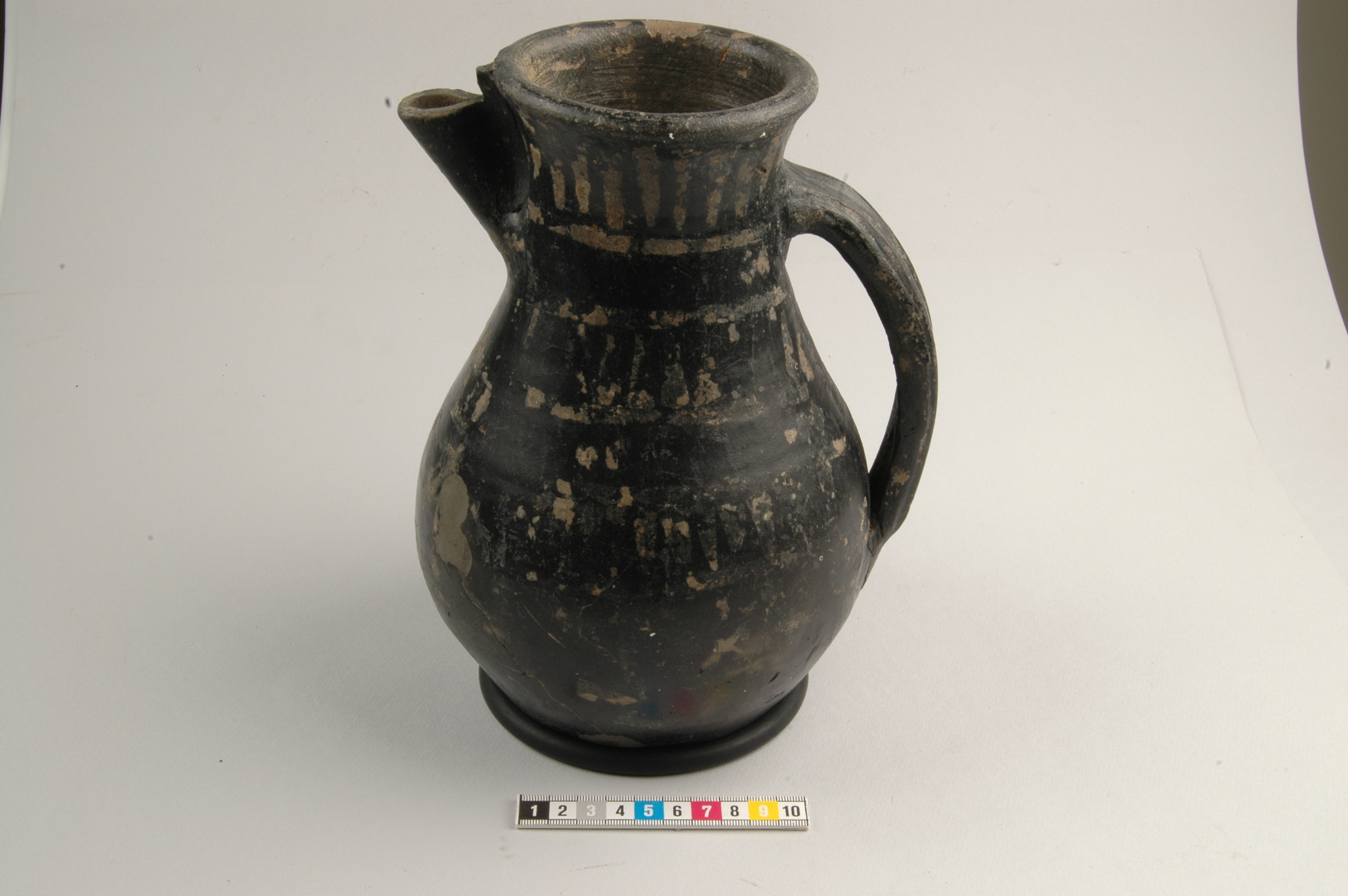 Frisisk kanna. med dekor av pålagd tennfolie i rader med rektanglar, ränder och romber