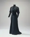 Kjol av svart kläde sydd i tre våder Två av sömmarna sydda med veck. I ett av dessa sprund 400 mm långt knäppt med 10 hakar och sydda tränsar. I midjan 55 mm brett spensband, knäppt med tre hakar och hyskor vid knäppningen soutach knapp i form av blomma med två åt sidorna utdragna blad. Allt av svart kräpp. Från nederkanten ett 860 mm brett fält av svart kräpp ?