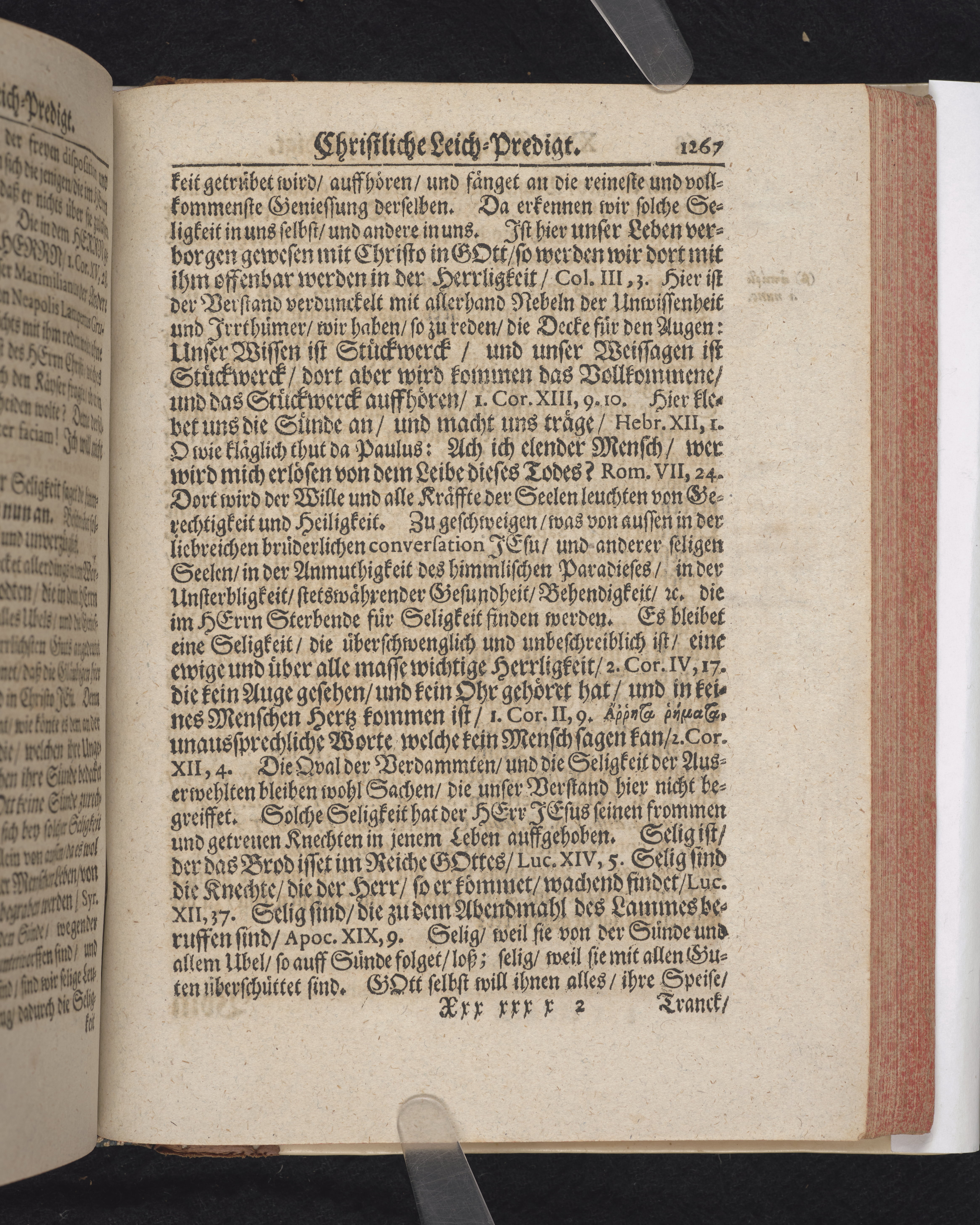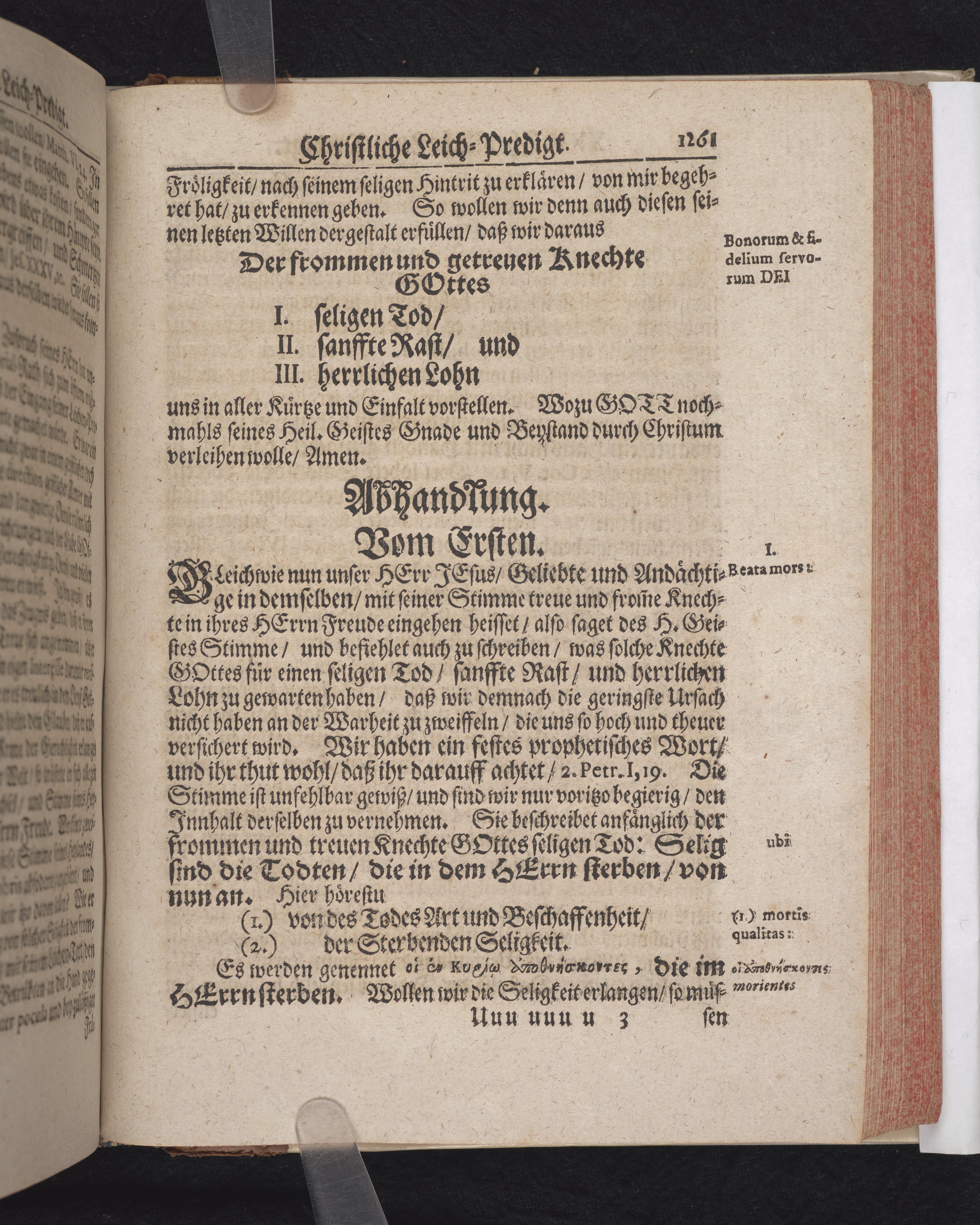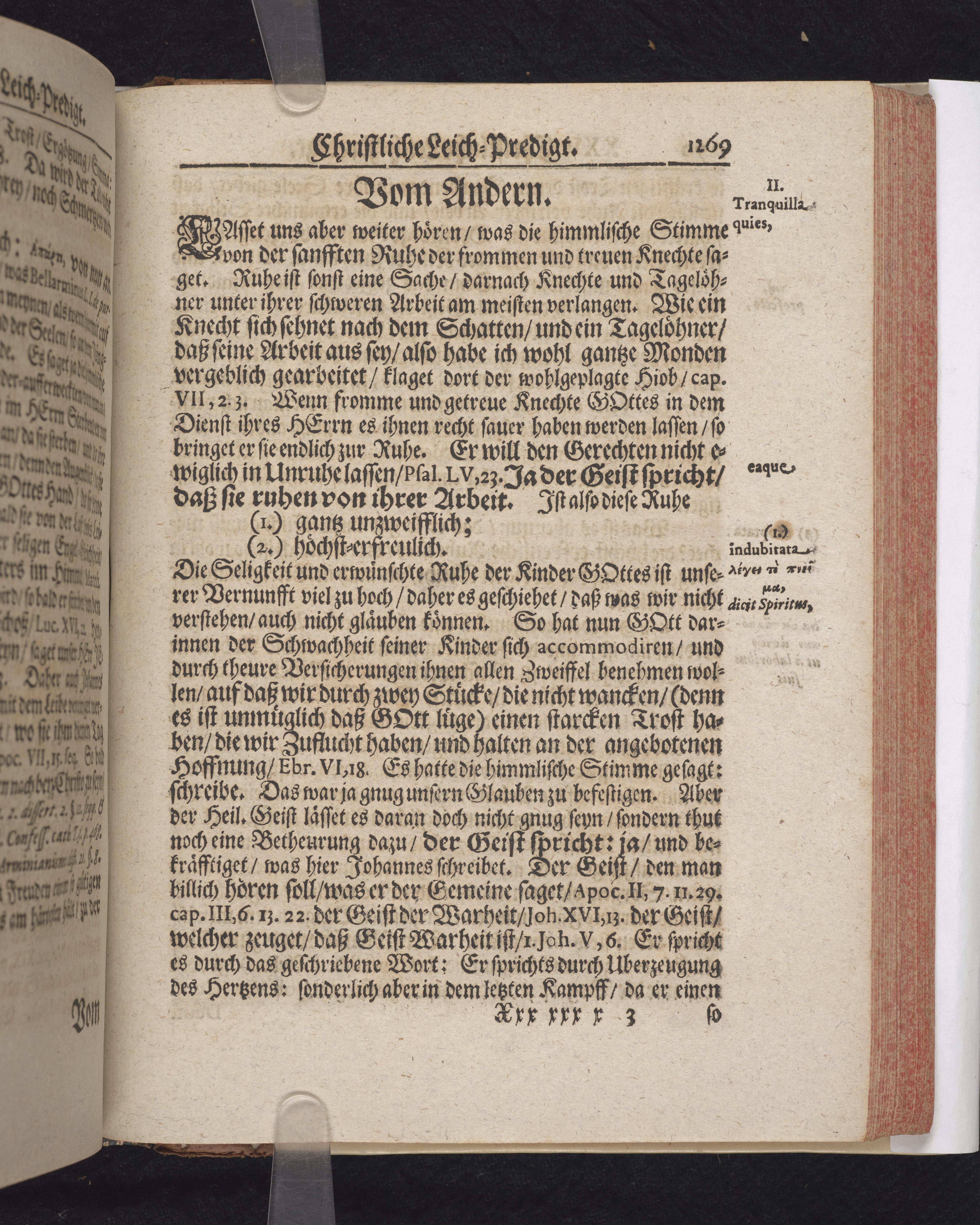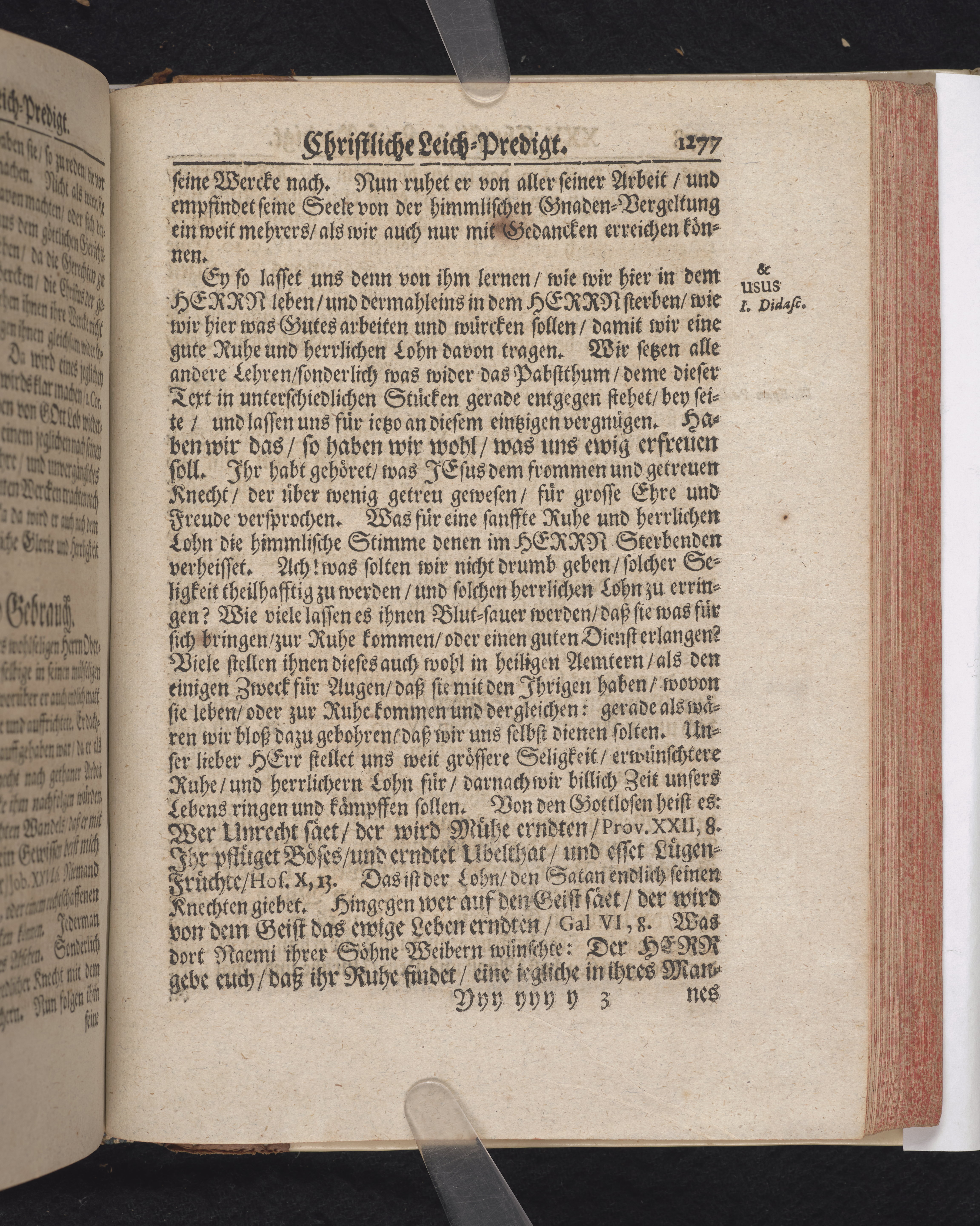 Ingår i en utgiven samling med 28 likpredikningar av Samuel Benedikt Carpzov: Grünende Gebeine, oder Leich-Predigten... Tryckt innehållsförteckning och register. Handskriven innehållsförteckning över de 28 likpredikningarna med bläck på främre försättsbladet (recto och verso).
