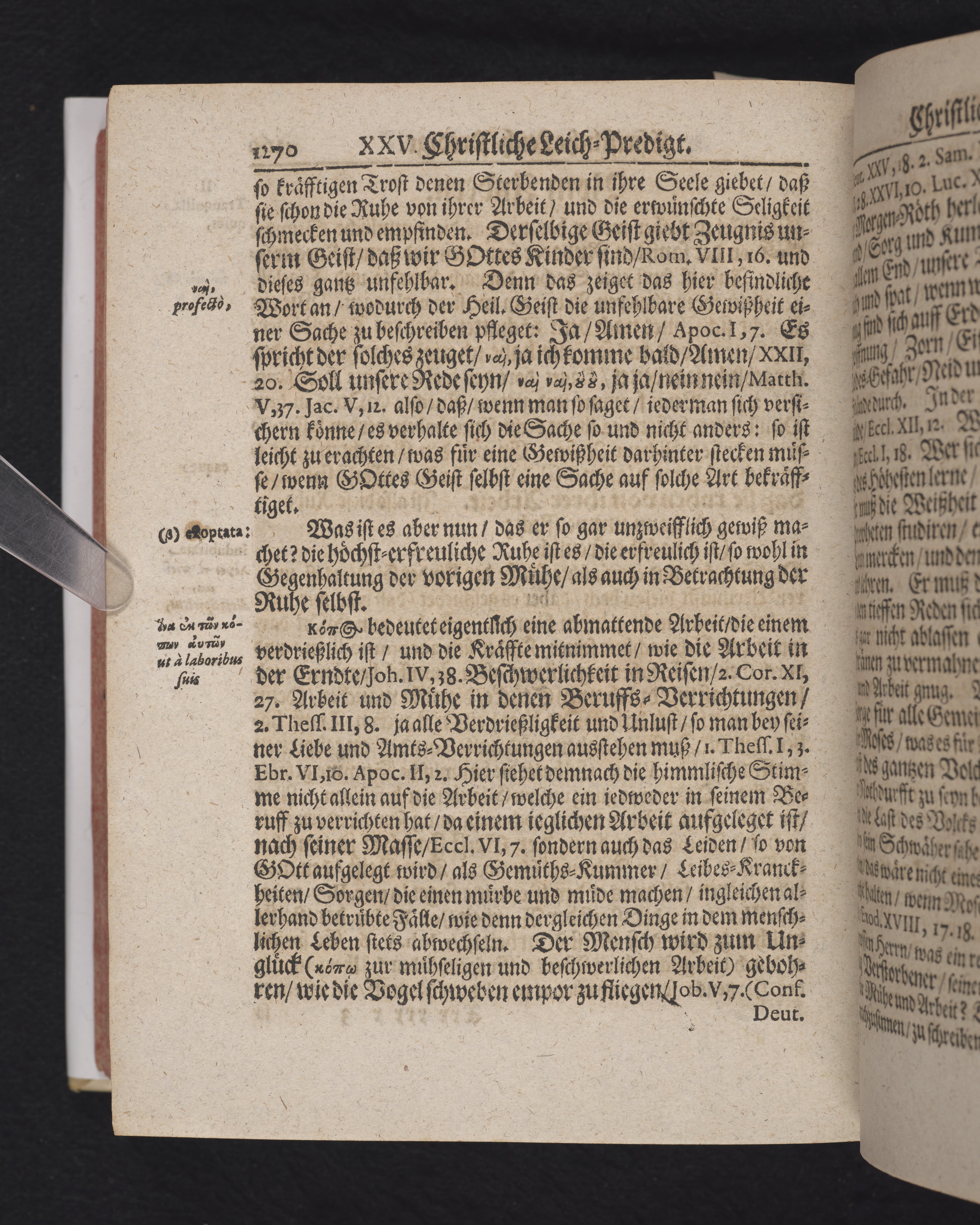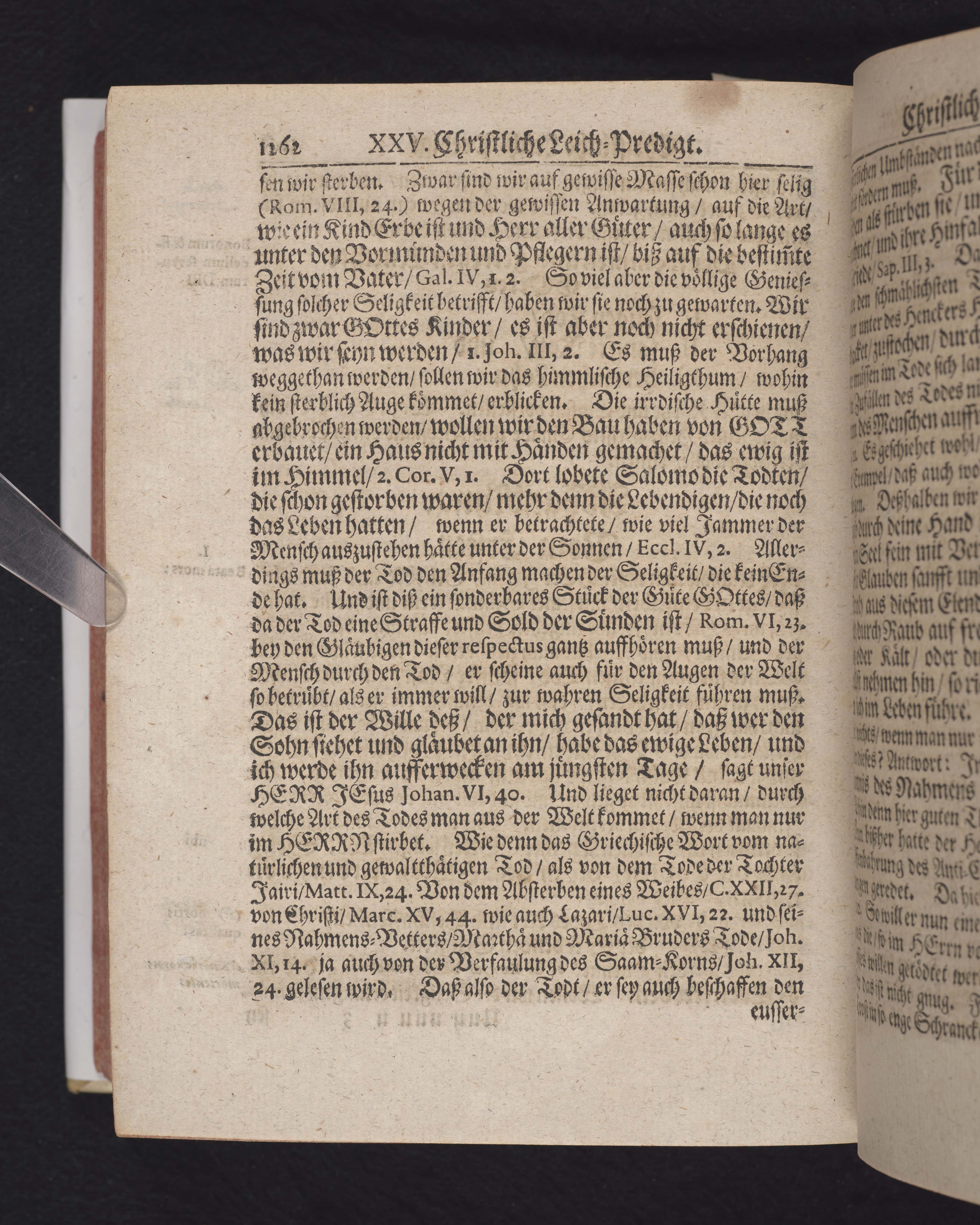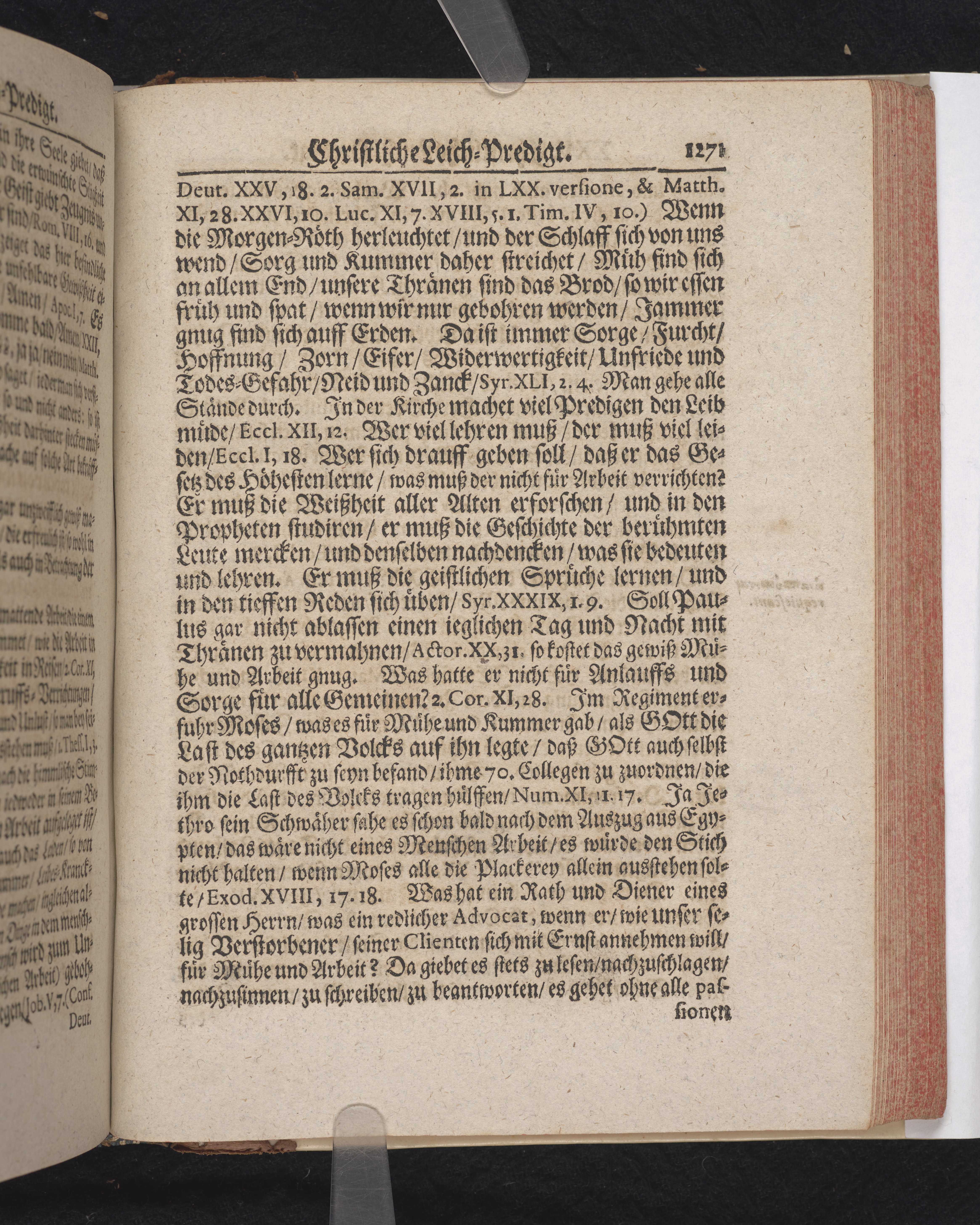 Ingår i en utgiven samling med 28 likpredikningar av Samuel Benedikt Carpzov: Grünende Gebeine, oder Leich-Predigten... Tryckt innehållsförteckning och register. Handskriven innehållsförteckning över de 28 likpredikningarna med bläck på främre försättsbladet (recto och verso).