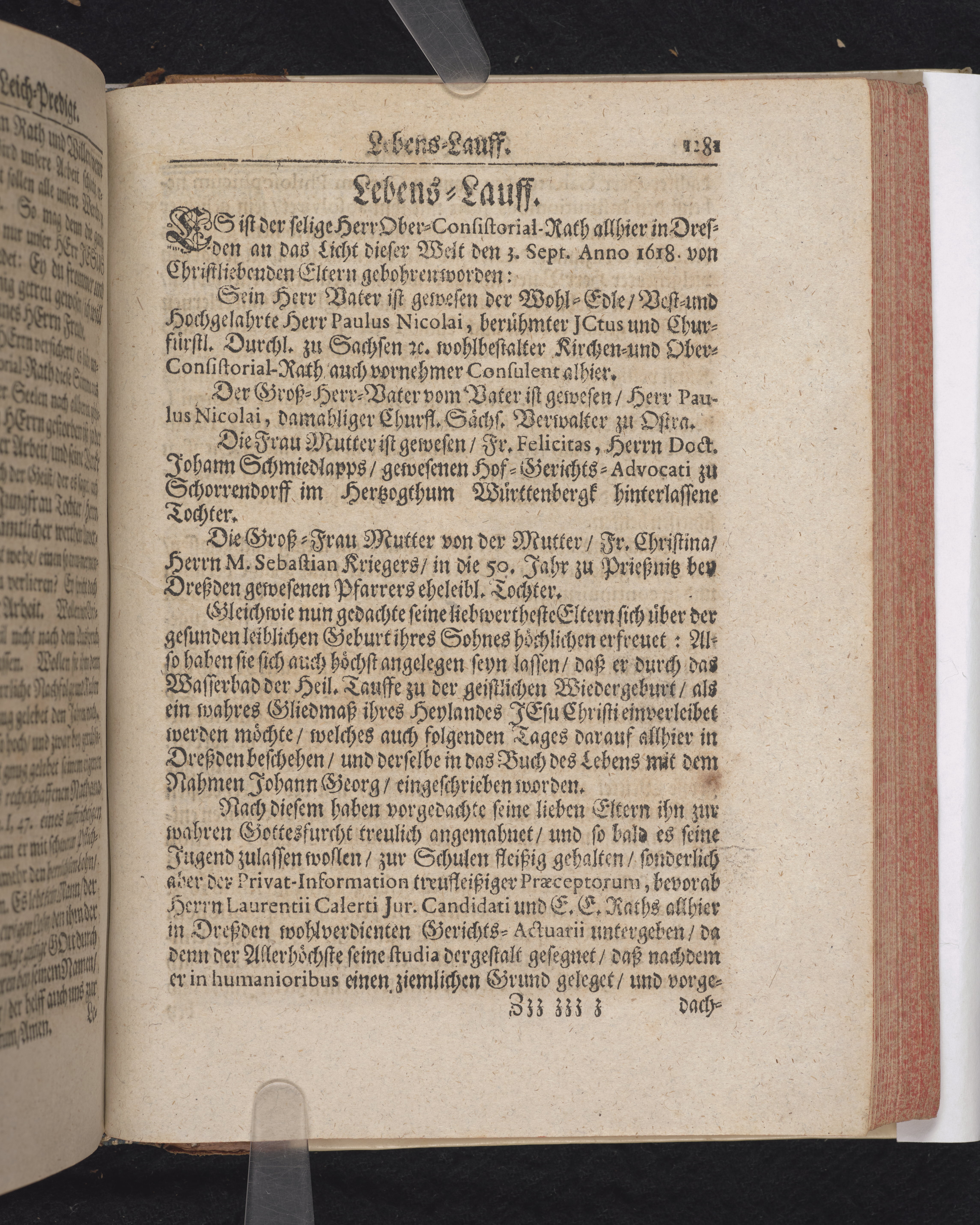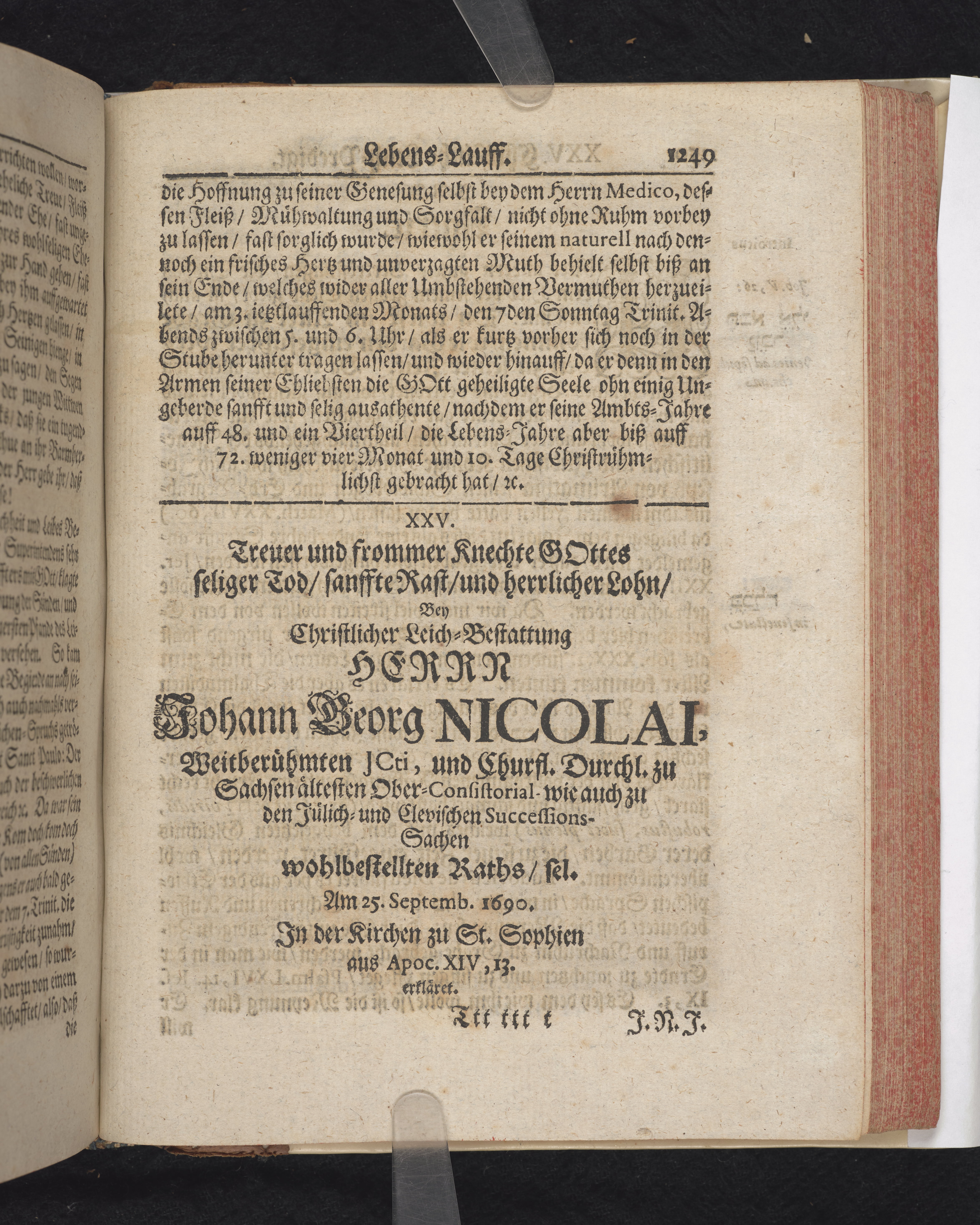 Frommer und getreuer Knechte Gottes seliger Todt/ sanffte Rast und herrlicher Lohn/ Bey Christlicher Leich-Bestatung Herr Johann Georg Nicolai, weitberühmten Jcti, und Churfl. durchl. zu Sachsen ältesten Ober-consistorial- wie auch zu den Jülich- und Clevischen Successions-Sachen wohlbestellten Raths/ sel. am 25. Septemb. 1690. In der Kirchen zu St. Sophien aus Apoc. XIV, 13. erkläret.