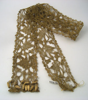 En långsmal, jämnbred genombruten guldspets. Spetsen är av guldtråd i ett mönster av slingrande vinbladsrankor och druvor. Kantad av ett löpande mönster av stiliserade blad. I ena ändan sitter sju små guldomspunna spolar med guldknoppar fästade på silkestråd, 30mm.