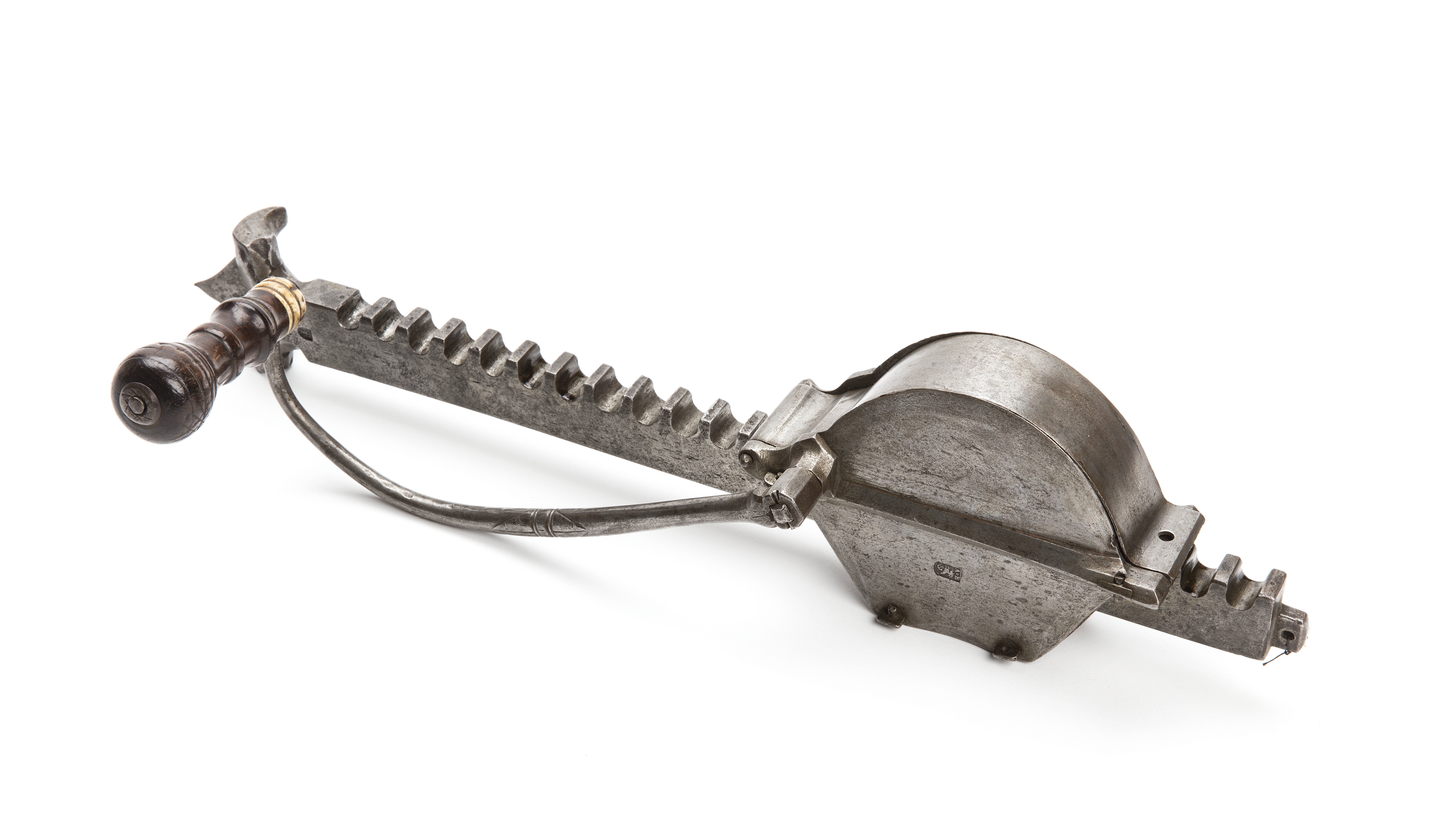 Vinda av stål med horisontalt placerat hjul. Heltäckande hjulhus, plant lock och plan underdel med fasade kanter, åsad mittlist på locket, stämpel till h. därom: sköld med A B, hjort och jakthorn (LRK vägl. 1921:131, jfr nr 132). Svängd vev med runt tvärsnitt, ring och triangulära blad på mitten, svarvat handtag av brunt trä, nertill en ring av ben med streckdekor. Odekorerad kuggstång med stränghållare, stämpel T H och man (LRK vägl. 1921:130). Mellan klorna en hjärtformig, rörlig bricka. Upptill klack för bältehake. Karl XV:s samling nr 380, katalognr III:A,28, testamentarisk gåva till LRK, 1872 förvarad i Stora Vapenrummet på Stockholms slott. Tidigare troligen i grosshandlare A L Soldins samling.
