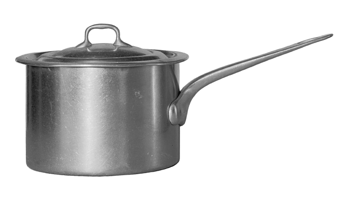 KASTRULL med lock Av nickel. Cylindrisk, med rundad bottenkant, plan botten och snett utstående skaft. Skaft av nickel, platt, med svagt flackrundade sidor, avsmalnande inåt och avtunnat utåt, ytteränden rundat avspetsad samt med ett ovalt hål; från inre änden utgående en liggande avlång platta, fäst med tre nitar. Höjd: 8,5 cm.; diameter: 12,3 cm. Skaft, längd: 12,8 cm. Lock: Lågt, kupigt och kring kanten en rakt uppstående fals med rakt utstående kantfläns med ytterkanten på undersidan avslutad i en stav; på mitten ett avlångt flackstavigt handtag med nedböjda ändar och rakt utstående, ovalt utvidgade ytterändar, fästa vardera med en nit. Höjd: 1,3 cm.; diameter: 13,5 cm. Österrikisk tillverkning, Berndorf i Nedre Österrike.