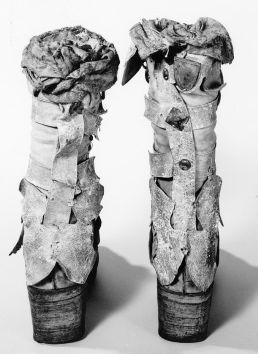 Med snörning och spetsig tå och hög rak klack. Kängan förmodligen buren vid Karl XI:s karusell 1672 i samband med kröningen.