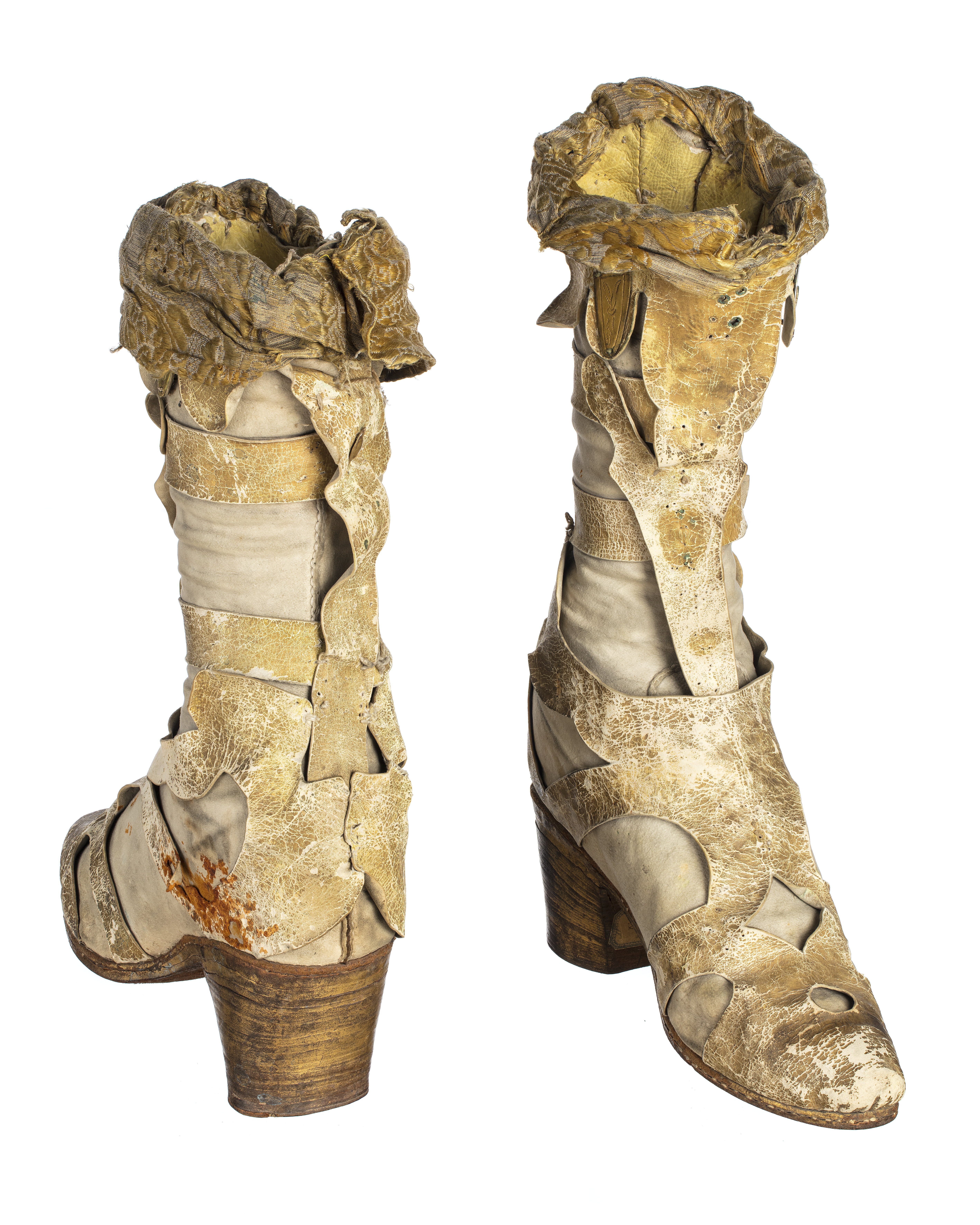 snörkänger af hvitt skinn med förgyllda sulor och klackar samt kragar af guldbrokad, öfverlädret genombrutet och förgyldt med påsydda messingsfjell,