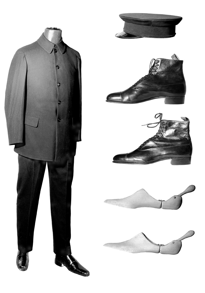 - Bestående af kostym (kavaj, väst och byxor), mössa samt kängor med läster. Kostym: Af svart cheviot, med knappar af svart massa. Kavaj: Enradig, med fem knappar samt rundkrage med hyska och hake. Ryggen med sido-uppskärningar, sidsömmar, ryggsöm och axelsömmar; ärmarna med ytter- och undersöm; å hvartdera framstycket nedtill en ficka med rakt ficklock. Knappar runda, tunna, fyrhåliga. Foder af svart kläde, ärmfoder af hvitt glansigt bomullstyg (eisengarn) med ränder i svart. Å kragens insida baktill ett svart band som hängare. Längd: 82 cm.; vidd (nedtill): 145 cm. Väst: Enradig, med sex knappar som de i kavajen men mindre; å båda framstyqkena ficka och bröstficka. Ryggstycke af svart tyg, satin, ett stycke från nedre kanten två spänntampar med svartlackeradt spänne med två taggar (tornar). Fodret i framstyckena som ärmfodret i kavajen; å vänstra sidan en ficka med kon-tureradt ficklock med knapp af hvit massa; fodret i ryggen af brungrått ylletyg. Å spännet pressadt (orig. 1/2): PRIMA Framstycken, längd: 59 cm.; bredd: 32 cm. Rygg, längd: 50 cm. Byxor (långbyxor): Upptill i hvardera yttersömmen en ficka, nedtill å hvartdera byxbenet en bred in-vikning. Midjebandet framtill med hake och knapp, baktill ett litet sprund, dessutom å bandet sex fyrhåliga hängselknappar; julpen med fem något mindre knappar samt knäppslejf (s. k. skomakare); baktill två spänntampar med svartlackeradt spänne med två taggar (tornar); midjebands-, bak- och julpfoder som ärmfodret i kavajen; vid sprundet en ögla af likadant tyg; fickor af grått bomullstyg. Å hängsel- och julpknappar firmastämpel (orig. 1/2): Å spännet pressadt som å västspännet. Längd: 118.5 cm.; vidd (vid midjebandet): 104 cm. Ben, längd: 76 cm, Förfärdigad efter beställning af Wilhelmina von Hallwyl, f. Kempe, hos Militär-Ekiperings-Aktiebolaget, Kungl. Hofleverantör, Hamngatan 3 A, Stockholm, se räkning 30 Maj 1927. Betald 4 Juli 1927, se Hallwylska Museiföreningens räkenskaper och räkning. Beloppet ersatt af Wilhelmina von Hallwyl, f. Kempe, 7 September 1927, se Hufvudbok (hushållskonto). Pris: Kr. 305, se räkning. Mössa: Af svart kläde, med läderskärm. Rundkullig, med flat kulle och bredt hufvudband; kring kullen en stafliknande kant, inuti en insydd stålfjäder; å hufvudbandet nedtill en i tyget uppsydd stafliknande kant. Skärm af svart tjockt läder med lackerad öfversida och finrefflad undersida, halfrund samt kantad med vaxduk. Foder af svart sars, med två och två parallella stickningar, bildande stora rombiska rutor. Svettrem af svartlackerad skinnimitation; mellan hufvudbandet och svettremmen en insydd kant (stråle) af vaxduk. Vidd: 55 cm. Kulle, diameter: 25 cm. Förfärdigad efter beställning af Wilhelmina von Hallwyl, f. Kempe, hos Militär-Ekiperings-Aktiebolaget, Kungl. Hofleverantör, Hamngatan 3 A, Stockholm, se räkning 30 April 1927. Betald 18 Juni 1927, se Hufvudbok (hushållskonto) och räkning. Pris: Kr. 22, se Hufvudbok (hushållskonto) och räkning. Kängor, ett par: Af svart läder (chevreau). Randsydda, med osvärtad hel sula och mässingstiftad låg klack, stiftningen tätare baktill vid yttersidan. Ofvanlädret med hel s. k. besetz och tåhätta, baktill i besetzen en isättning, från hvilken utgår öfver skaftsömmen en smal tunga. Skaft kort, med sju spännhål och fyra hakar å hvardera sidan, hålen med skoningar, dessa jämte hakarna af mässing, å utsidan belagda med svart celluloidmassa; i hålen ett isnördt svart band med ändskoningar. Foder af ljusgult bomullstyg, innanför snörhål och hakar en skoning af svart skinn, mellan skoningarna en plös af dylikt skinn, fodrad med tyg som i kängan; upptill kring skaftets insida ett randigt brunt band med hvarannan rand slät, hvarannan i rips; baktill i skaftets öfverkant en stropp af dubbelväfdt ripsband med mörkbrun utsida och ljusgul insida. Under bottnen inslaget storleksnummer, kvalitetsbeteckning och firmamärke: Å skaftets kantband samt å stroppen i gult sydt varumärke och firmanamn: Å fodret i svart stämpladt storleks- och fabrikationsnummer: 43 82512 Inuti bottnen inslaget (orig. V2): Sula, längd: 29.3 cm.; bredd: 9.5 cm. Inköpta af Wilhelmina von Hallwyl, f. Kempe, 27 April 1927 i Skoaffären Atlas (innehafvare Paul Pettersson), Fleminggatan 19, Stockholm, se nota 27 April 1927. Betalda 27 April 1927, se Hushållsbok (här uppförda på Maj 1927) och nota. Pris: Kr. 26, se nota. Läster: Af rödbok. Ihåliga och utan bottnar, hälen afskuren och ledad på ett å öfversidan sittande gångjärn af järn, fäst med fyra skrufvar med kullriga hufvuden. I hälens öfversida i ' en aflång ränna ett svarfvadt handtag med äggformigt utsvälld ytterända, den inre ändan knoppformig, plattad från två sidor; handtaget rörligt på en från lästens insida gående skruf; i hälens undersida ett rundt hål. Ofvanpå vid tån i blått varumärke med firmanamn m. m.: Inuti vid tån i blått storleksnummer: 43 Inköpta af Wilhelmina von Hallwyl, f. Kempe, 24 Oktober 1927 hos Militär-Ekiperings-Aktiebolaget, Kungl. Hofleverantör, Hamngatan 3 A, Stockholm, se nota 24 Oktober 1927. Betalda 24 Oktober 1927, se Hushållsbok och nota. Pris: Kr. 3:50, se nota.