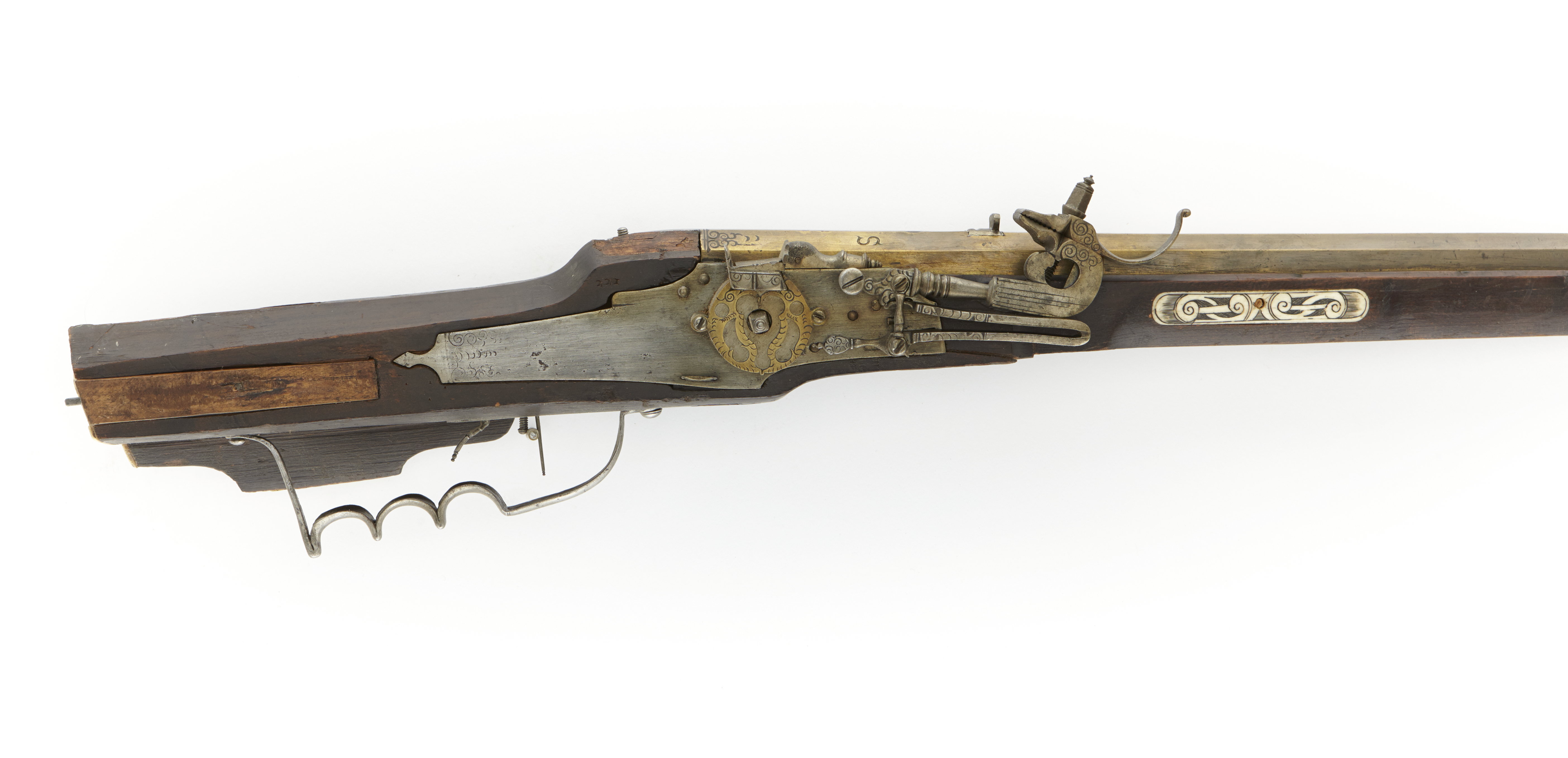 Åttkantig pipa av mässing, nio räfflor. Något utsvängd vid mynningen. På kammaren finns stämplat "CS" samt inslaget årtalet 1611 (Stöckel nr 2304, Tyskland). Ståndsikte, stolpkorn samt svansskruv med blad av stål. Två piphäften av stål. Hjullås. Låsbleck av tysk typ - bakåt avsmalnande genom två fall. Plan hjulkapsel täckt av en genombruten mässingsplatta, fastskruvad kl. 9 och kl. 3. Låg, vertikal krutskärm. Hane med lös överkäke. Ringformigt genombruten hanhals och uppsvängt fingergrepp. Hel stock av svärtat trä, tysk kolvtyp. Bakplåt av ben. Låsskruvar och pipstift med stora, graverade voluter. Näsband och rörka av ben. Varbygel med tre fingerlägen. Avtryckare med snälltryck. Tillbehör: Laddstock med doppsko av ben. Märkt: 221 ovanför låsblecket, stanstyp 5376. 124 (ändrat från 114) på kolvens undersida, stanstyp 5373. Enligt 1651 års tyska rustkammarförteckning: "124/ Ein Stuz mit 8 groben Zügen, messing Lauff Worauff 1611 schwarzem Schafft mit knochen aussgemachet blauen Schloss undt messing uberlegtes Rad."