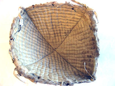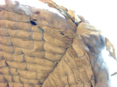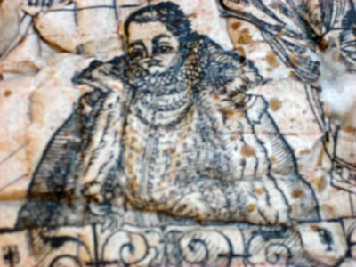 Fodret är sydd i fyra kilar och kilen längst ner är 65 mm bred och 115 mm lång. Fodret är av fårull och invändigt är fodret i vitt silke och utvändigt är det en makulatur med tryck i tysk text samt en bild. Bilden föreställer en man klädd i dräkt från 1560-talet. Han är kortklippt och dräkten har en pipkrage och en åtsittande tröja med en fyllig mage en s.k. gåsbuk. Över axlarna bär han en kappa kantad med päls och runt halsen bär han dubbla kedjor