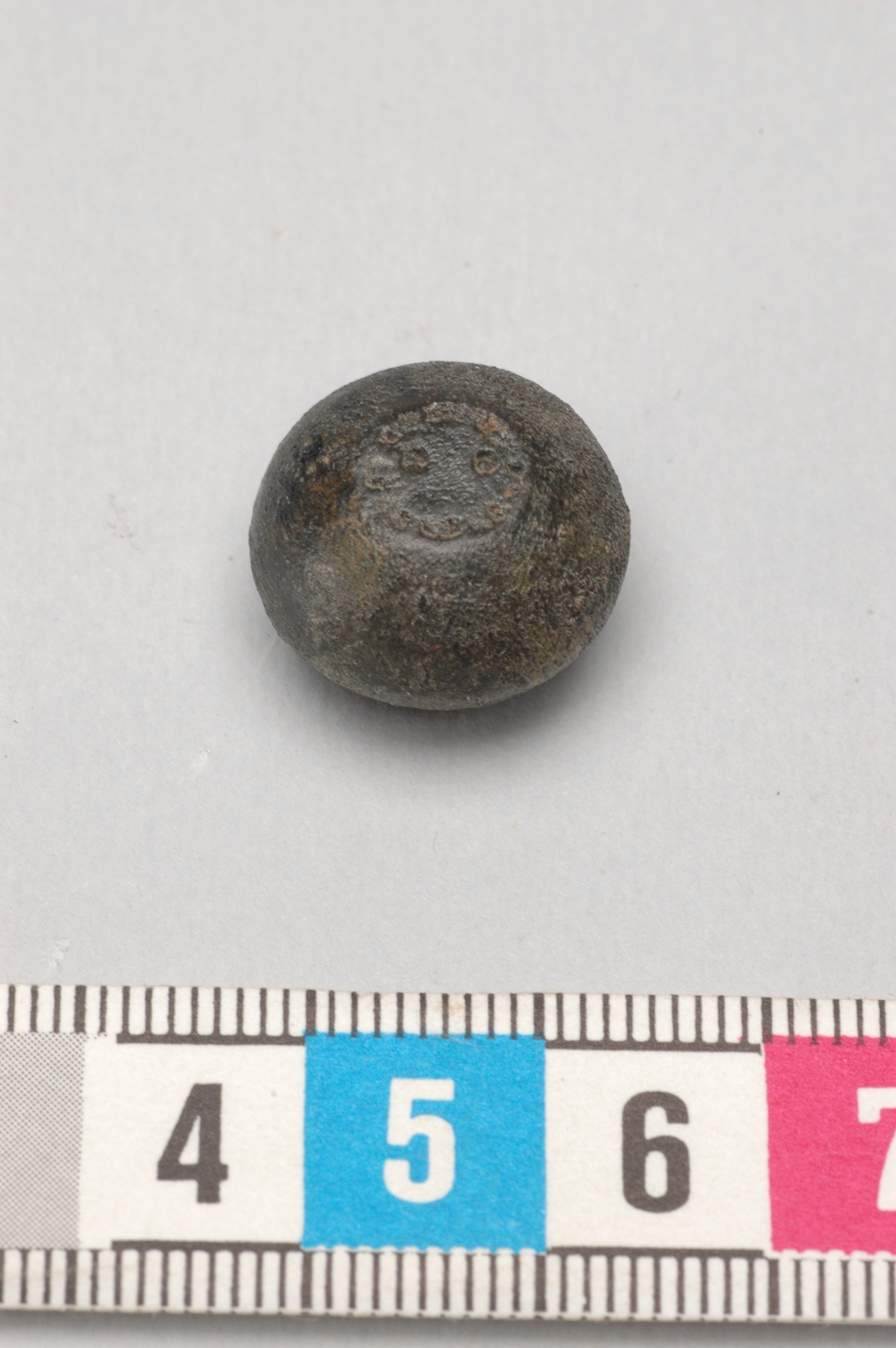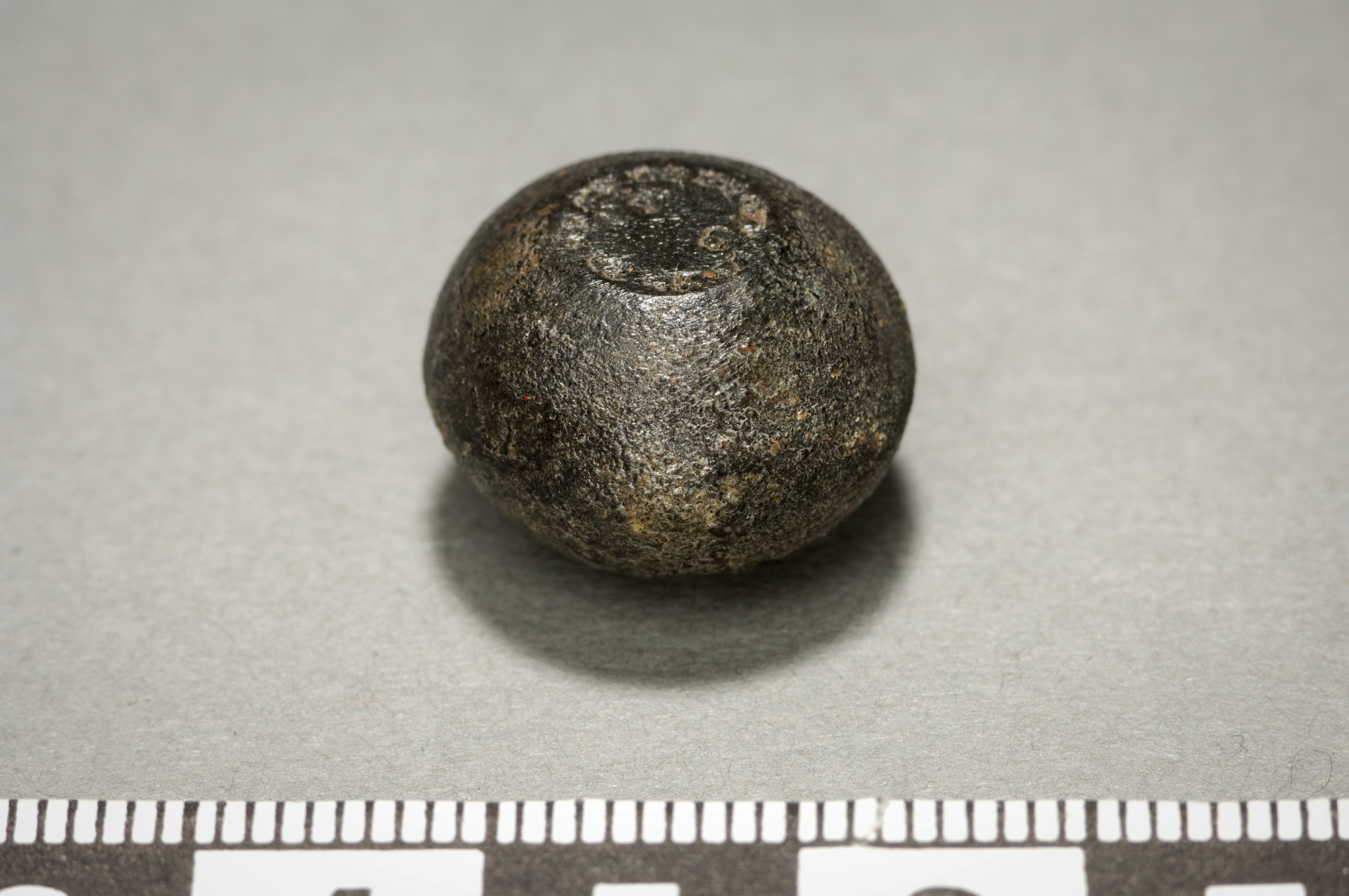 Vikt av järn och kopparlegering. Tillplattad kulform. Har två plana ytor, en av dem med instämplade siffror.