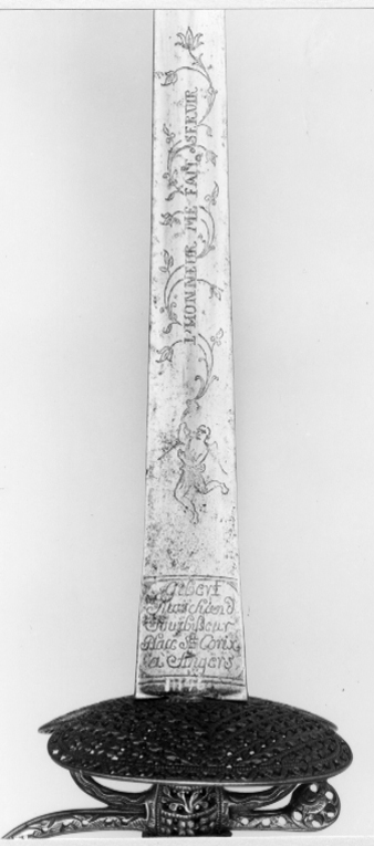 Fäste av stål, i sin helhet lågt reliefsnidat och med genombruten ornering. Knapp nötformig med tämligen hög slät nitknapp. Handbygel med ovalt tvärsnitt. Bakre parerstång kort med något utsvängd rundad ytterände. Fingerbyglar rundat böjda. Parerplåtar njurformigt symmetriska, något skålformiga. Orneringen genomgående bestående av blom- och bladmotiv samt vindlande band. Kavellindning ej ursprunglig av försilvrad kopparlan omväxlande med fyra tunna släta mässingstrådar, kantade med tvinnad tunn koppartråd. Klinga rak, treeggad s k stukatklinga. Baspartiet med etsad ornering. Närmast basen i ett av dubbla linjer avgränsat fält inskription i skrivstil. På de båda utsidorna (otydligt): " De la Manufacture à L' Extra=fin à Solingen ". På insidan: " Gibert Marchand Fourbisseur Place Ste Corix à Angers "(Croix ?). Härovanför på utsidorna fristående tunna rankornament. På insidan en springande bevingad gestalt hållande i en uppåtriktad tunn bladranka, utmed vars mitt inskription i antikvaversaler: " L' HONNEUR ME FAIT SERVIR ".