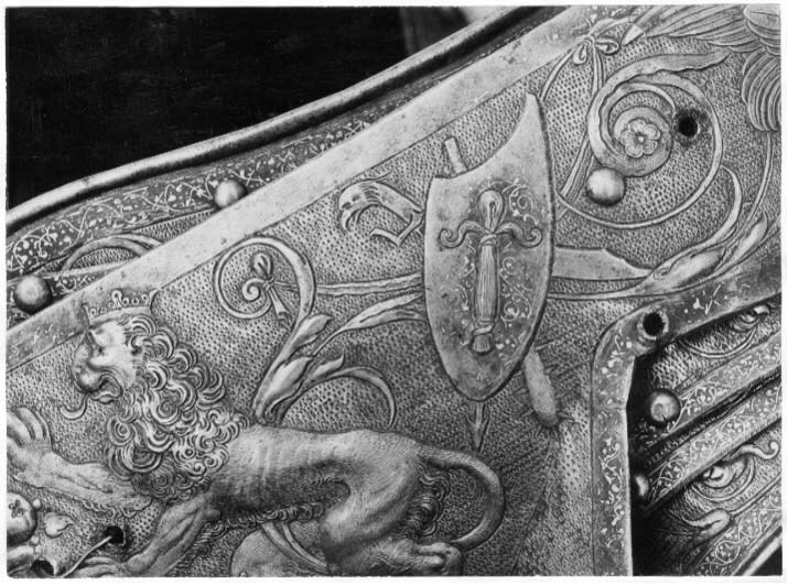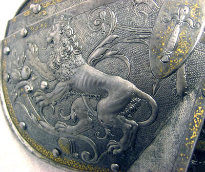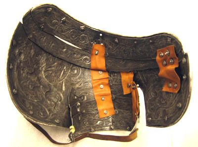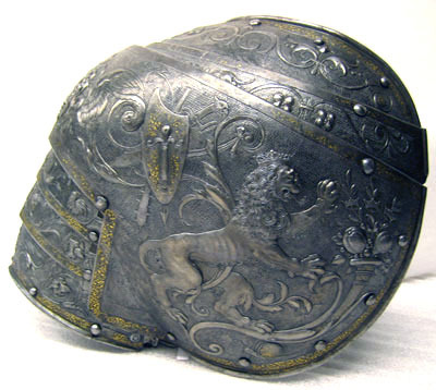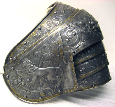 Driven stålplåt av sammanlagt sex delar. Övre del av tre större välvda skenor utdragna över bröst och skuldra. Nedersta skenan betydligt större än de andra med utdragna rundade ändar. I mitten rektangulär urtagning för armen med övre kanten rak och sidorna vinklade upp mot armen. Nedre del av tre mindre och välvda skenor över armen. Fästade i översta skenan och i varandra med nitar och läderband. I nedre bakre kant en sölja, i främre en 300 mm lång läderrem. Driven mittås över alla delar. Nitarna rörliga i sina hål. Yttre kanterna omvikta och rundsmidda.