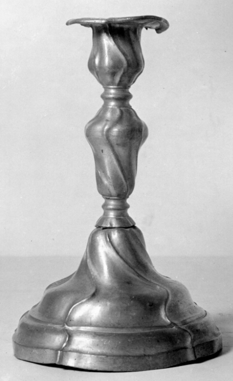 Rokokoljusstake av tenn dekorerad med vridet knäckmönster. Fot med rund grundform, högt kupad. Skaftets baluster är ovan och nedtill avgränsad av liten vulst och hålkälar. Pipa med 17 mm bred manschett. På kanten av fotens undersida fyrstämpling samt med årsbeteckning och kontrollstämpel. 1)2) Kontursköld med antikva versalerna "C G" över "M B", dvs stockholmsmästaren Carl Gustaf Malmborgs märke (Bruzelli nr A 18) 2)3) Stockholms stadsmärke, sköld med öppen krona 5) q (fraktur gemen) betecknande året 1774 6) Proberstämpel, sköld med tre kronor.