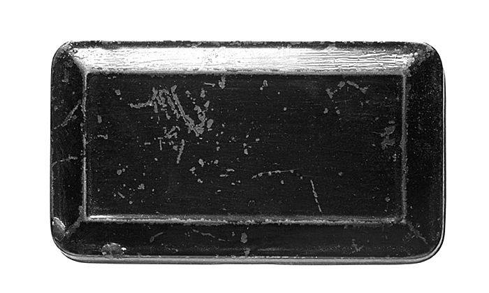 Rektangulär, stoppad samt indränkt med gredelin stämpelfärg. Ask: Av bleckplåt, rektangulär, med platt fällock och plan botten samt lackerad i rödgredelint; kring asken en utstående stav, bildande falskant för locket; ovanpå locket kring kanten en utåtfallande falskant. Tillhört inventarierna på Walther von Hallwyls privata kontor, inrymt i Hamngatan 4, Stockholm, 1909 - 1921; därefter på Wilhelmina von Hallwyls, f. Kempe, kontor där från sistnämnda år t. o. m. 1930.