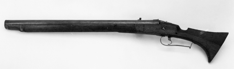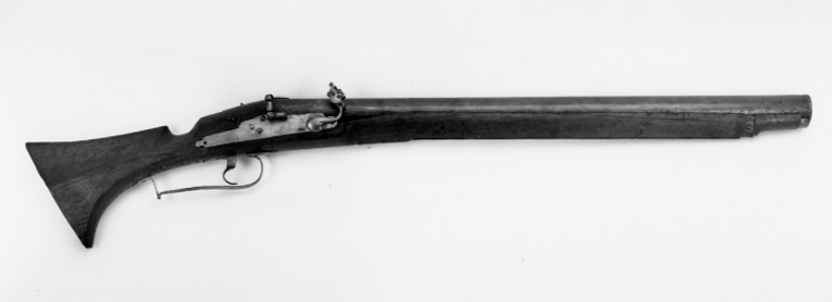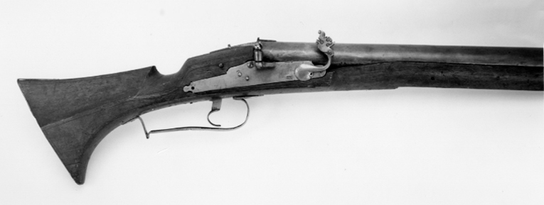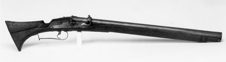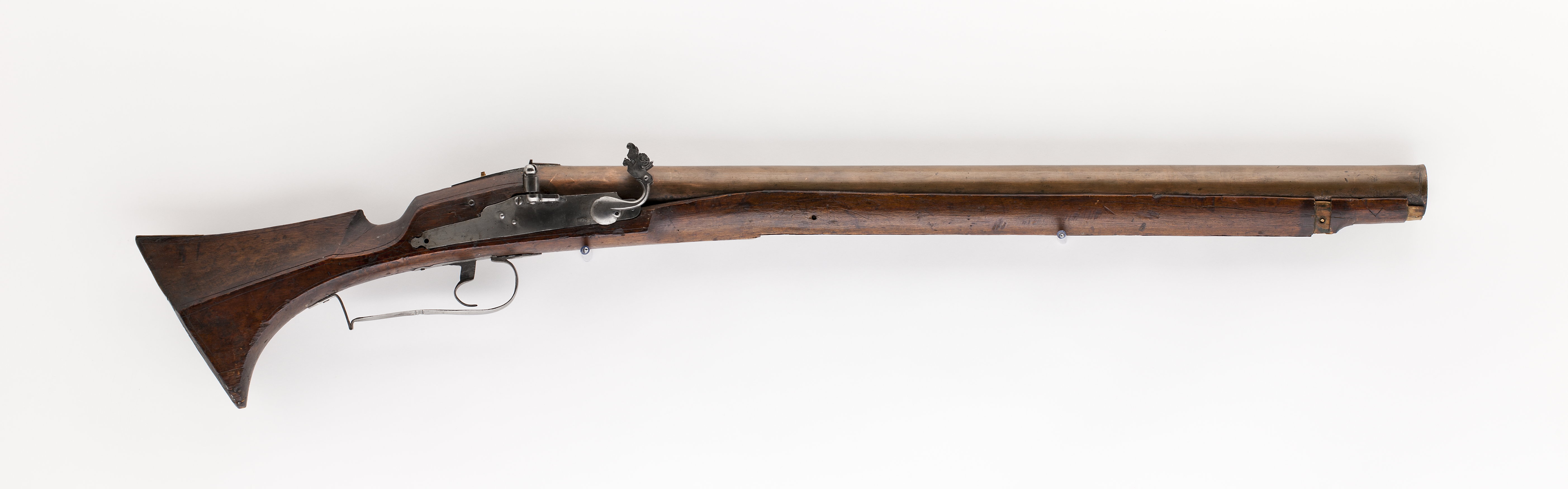 Rund, slätborrad pipa av koppar. Svansskruv och svansskruvblad av stål. Ståndsikte av koppar. RUnt mynninten två ränder. Två häften. Pipan urspr. fäst med krysskruv underifrån (ersatt med trästift) samt ett pipstift av trä och en skruv. Luntlås med hävstångsmekanism, plant låsbleck vid vilken fängpannan är fäst. Krutskärm fäst med stor skruv i fängpannans ena hörn, fängpannelock saknas. Böjd hane med rund kropp, konturerad, platt luntklämma i form av drakhuvud, punsad dekor, klämskruvens huvud avbrutet. En låsskruv. C-formig avtryckare. Litet märke på låsblecket. Brun, grov helstock, muskötkolv med nedskuret tumläge. Kopparbeslag över hälen. Graverade kantlinjer. Laddstocksränna, rörkan saknas. Näsband av koppar. Avtryckarbleck. Rak, trågformig, s.k. holsteinsk varbygel av stål. Mellan näsband och pipband inskuret: "V".