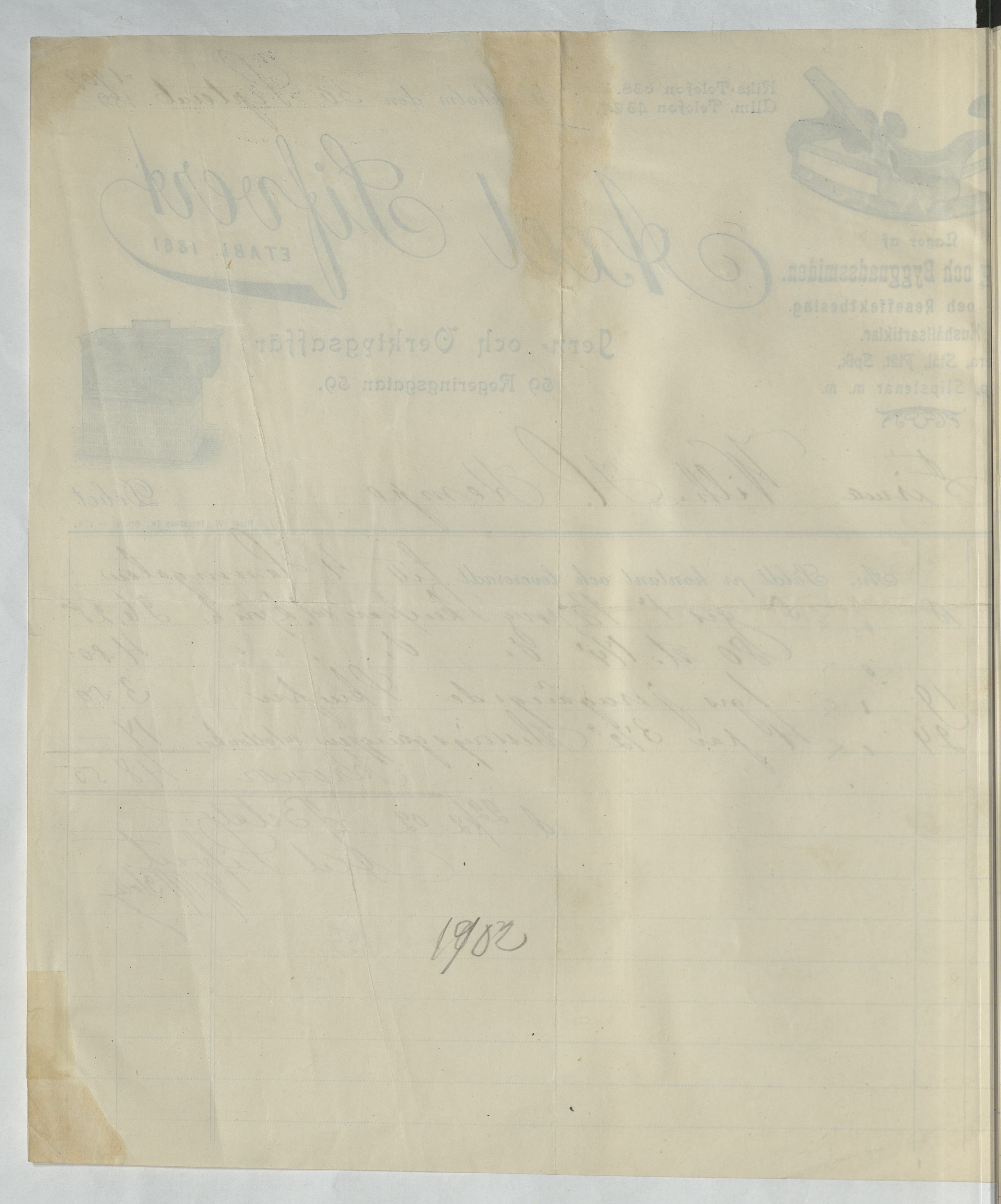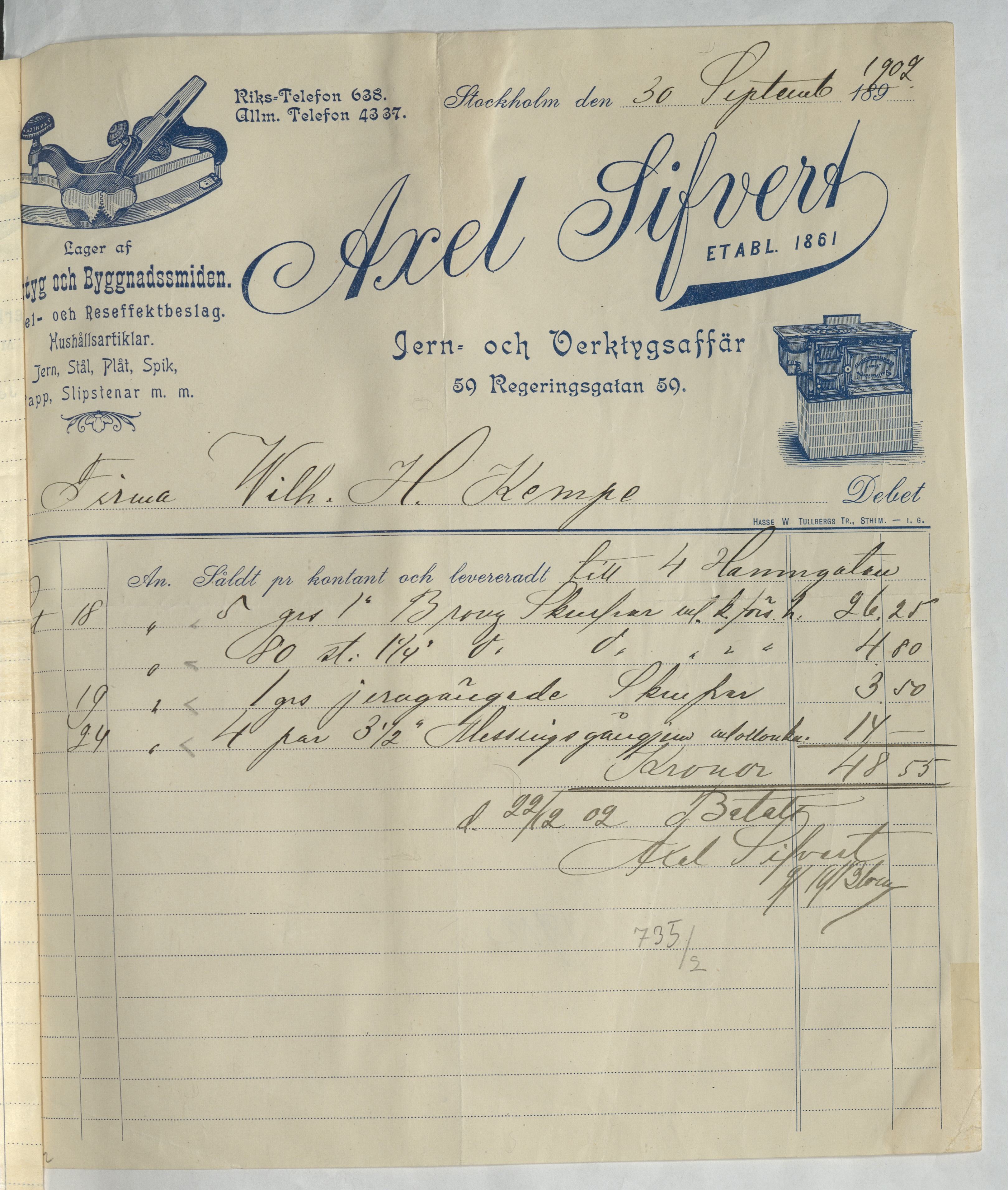 Kvitto från Axel Sifvert, Jern- och Verktygsaffär. Stockholm, 1902.