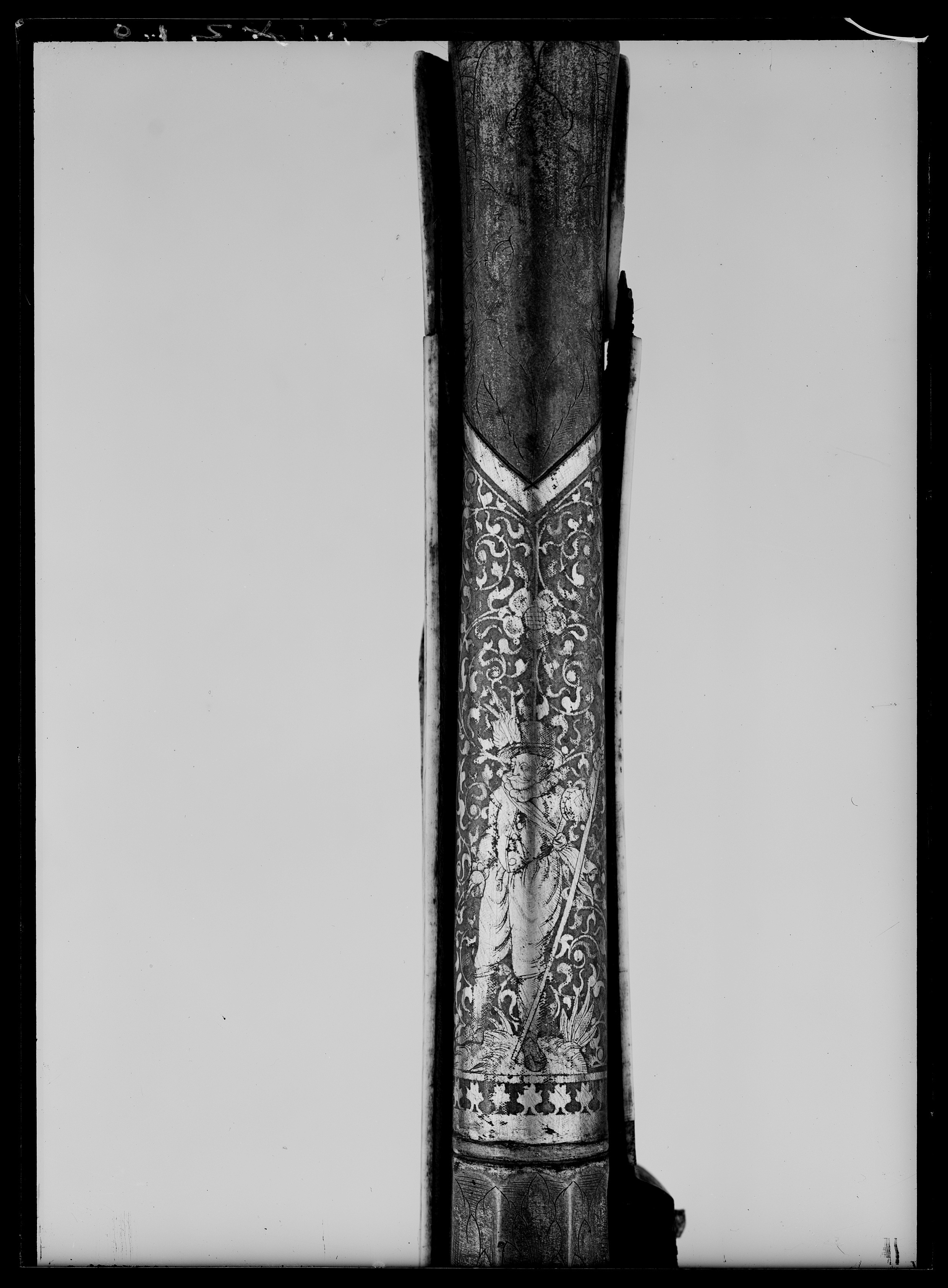 Rund, på kammaren åttsidig pipa med trumf, rektangulärt, böjt svansskruvblad. Vid övergången rund-kantig del samt på tre ställen på kammaren inskurna ringar. På pipans ovansida påslagen guld-och silverdekor, på svansskruvbladet rankverk (moresker) av silver med guldblad. Framtill och baktill på kammaren förgyllda fält med stora blad, däremellan rankverk samt en landsknekt (hakeskytt) av guld och silver med musköten på axeln. Baktill på den runda delen en man (officer) i liknande dräkt med stav i handen. Framtill på pipan ett förgyllt fält med bladdekor. Fästning: Två häften. Pipan fäst med krysskruv underifrån (varbygelns skruv) samt två pipstift av stål (ej ursprungliga), det främre dolt av rörkan. Hjullås av tysk typ, plant låsbleck med påslagen dekor, kantlinjer samt rankverk av silver med inflikade guldblad. På låsbleckets bakre del en förgylld studel och blad från en virvelsäkring. Hjul fäst med en förgylld ring och en välvd kapsel med dekor som på låsblecket, infogade sexbladiga blommor, två med guldblad och silvermitt, två med omkastade färger. Förgylld fängpanna med streckdekor, fängpannelock med rörlig arm, ovalt, kulformigt, förgyllt grepp, på låsbleckets kant därunder påslagen silverdekor, kantlinjer och sexuddiga stjärnor. Tryckknapp med förgyllt skruvhuvud. Förgylld hane med åsad, framtill något svängd kropp, kantig hals med svängd framkant. Rektangulära, från sidan rombiska käkar, underkäken lös, käkskruv med fyrsidigt huvud. Smal, något timglasformig, förgylld studel. Förgylld, framtill rundad hanfjäder med bladdekor baktill, droppformigt, förgyllt löv med liten ändknopp. På invändiga låsdelar streckdekor. Fästning: Två låsskruvar från h. sida. Rak, svarvad, förgylld avtryckare. Avtryckarbleck av ben. Helstock av trä (apel eller päronträ) med i vinkel mot pipan svagt böjd, bakåt avsmalnande kolv med stor, rund kolvkula, d: ca 76 mm, h: 64 mm, centrumplattan saknas. Yttäckande, starkt skadade inläggningar av ben i form av rankverk och punkter med däri infogade rullverkskartuscher och figurer, kantlister med flätmönster. Bakom låsskruvarna ett barn med lyft bägare, sittande på ryggen av en krypande människa, båda nakna. Vid kolvkulan en drake, på stockens undersida vid kolvkulan ett sittande lejon. Framför varbygeln stående man i östeuropeisk (sarmatisk) dräkt med lång rock, kroksabel och gevär på axeln. På framstocken plattor med rullverkskartuscher. Laddstocksrännans täckplatta saknas. Näsband med enkel bladdekor. På kolvryggen, runt kolvänden samt i fyra band över kolvkulan förgyllda mässingsband med reliefdekor i form av fruktknippen och maskaroner. Runt framstocken mellan banden maskaroner och rankverk med punkter av ben. Enkel, smal varbygel av förgyllt stål, framstolpen fäst med krysskruven, bakstolpen inskruvad i kolven. Sidbleck med stjärndekor av guld och silver, förgylld, smal bältehake, l: 102 mm.