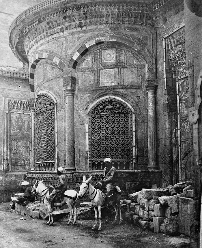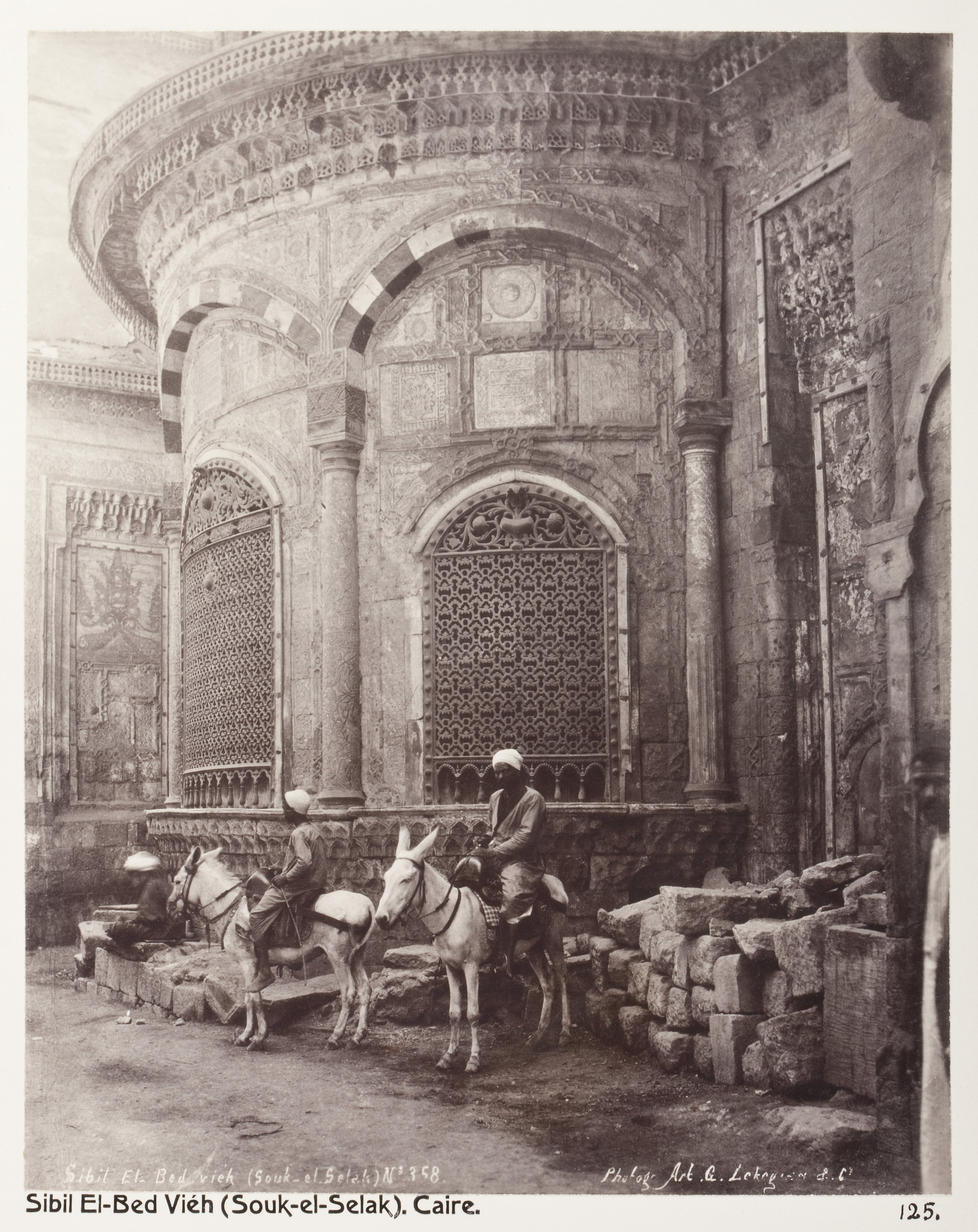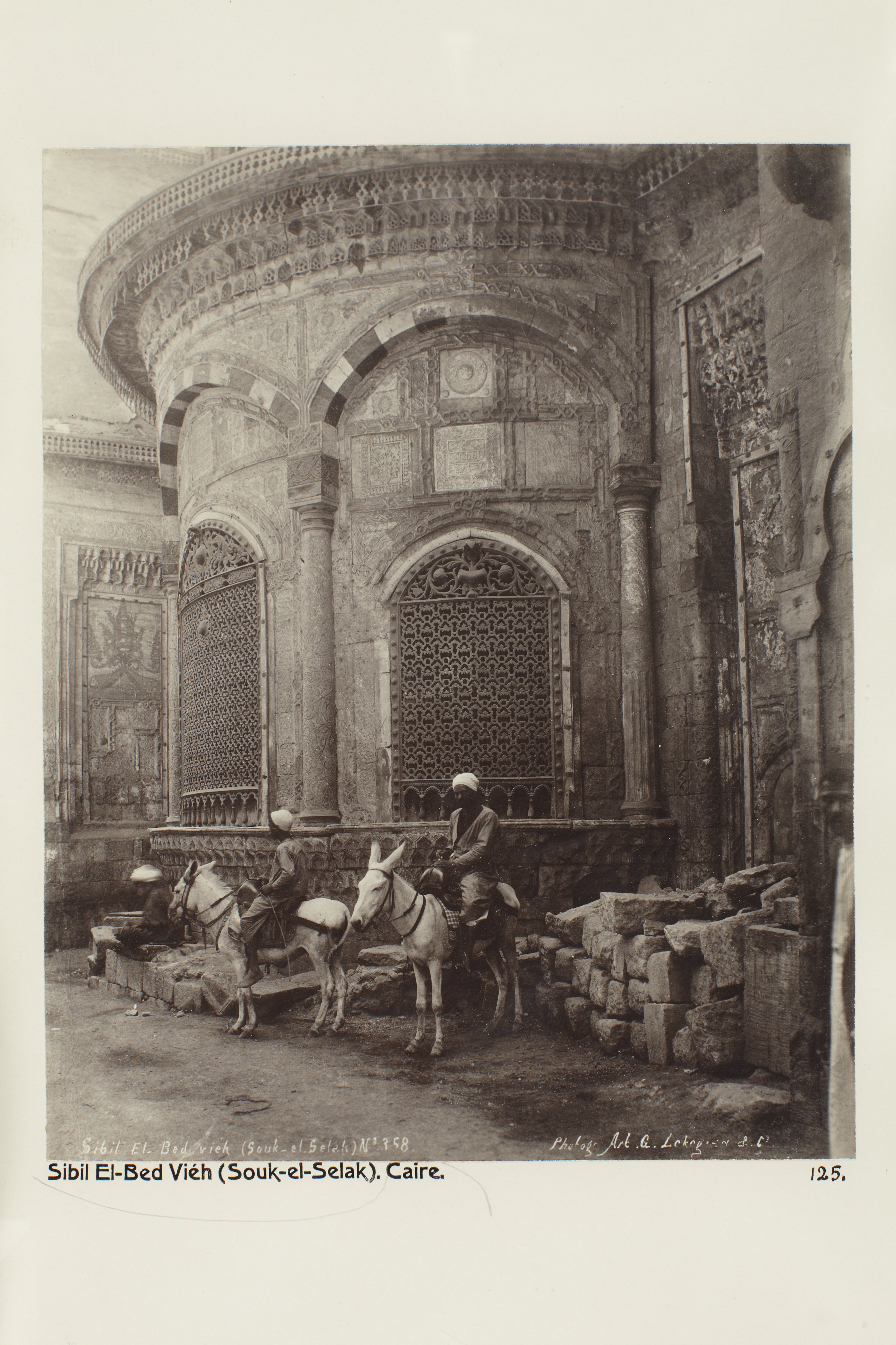 Den gamla vapenmarknaden, Souk-el-selak. Kairo, Egypten. Text på fotografiet: Caire. Sibil El-Bed Viéh (Souk-el-Selak). Fotografierna LXVI:M.01.- 201. kommer från resan till Egypten och Sudan som Wilhelmina och Walther von Hallwyl gjorde vintern 1900-1901. De lämnade Sverige den 5 november 1900 och fortsatte från Egypten till Palestina den 28 mars 1901. Med på resan var döttrarna Ellen med maken Henric de Maré och Irma med maken Wilhelm von Geijer. Wilhelminas sällskapsdam, fröken Ida Uhse reste också med. Under en del av resan anslöt sig ledamoten av Internationella domstolen i Kairo, assessorn Otto Conrad Waldemar Cedercrantz med makan Anna Elisabeth. Vid resan uppför Nilen hade Walther von Hallwyl hyrt ångfartyget Columbia med besättning. Båtresan startade i Kairo 27 december 1900, gick ända till Wadi Halfa varifrån man reste vidare med tåg till Khartum och tillbaka till Wadi Halfa. Båten vände åter i riktning mot Kairo, men det verkar som att sällskapet tog tåg sista biten, från Luxor. Henric och Ellen de Maré samt fru Cedercrantz lämnade båten redan då de passerade Luxor första gången. Resten av sällskapet återvände till Kairo den 1 mars. Fotografierna LXVI:M.01.-120. togs av resenärerna själva, de största av Ellen de Maré, de mellersta av Wilhelmina von Hallwyl och de minsta av Wilhelm von Geijer. Resten köptes av professionella fotografer i Kairo, de flesta från Studio Photogr. Artistique G. Lekegian & Cie. Alla uppgifter kommer från Ida Uhses reseanteckningar. Inköpt hos studio Photogr. Artistique G. Lekegian & Co’.