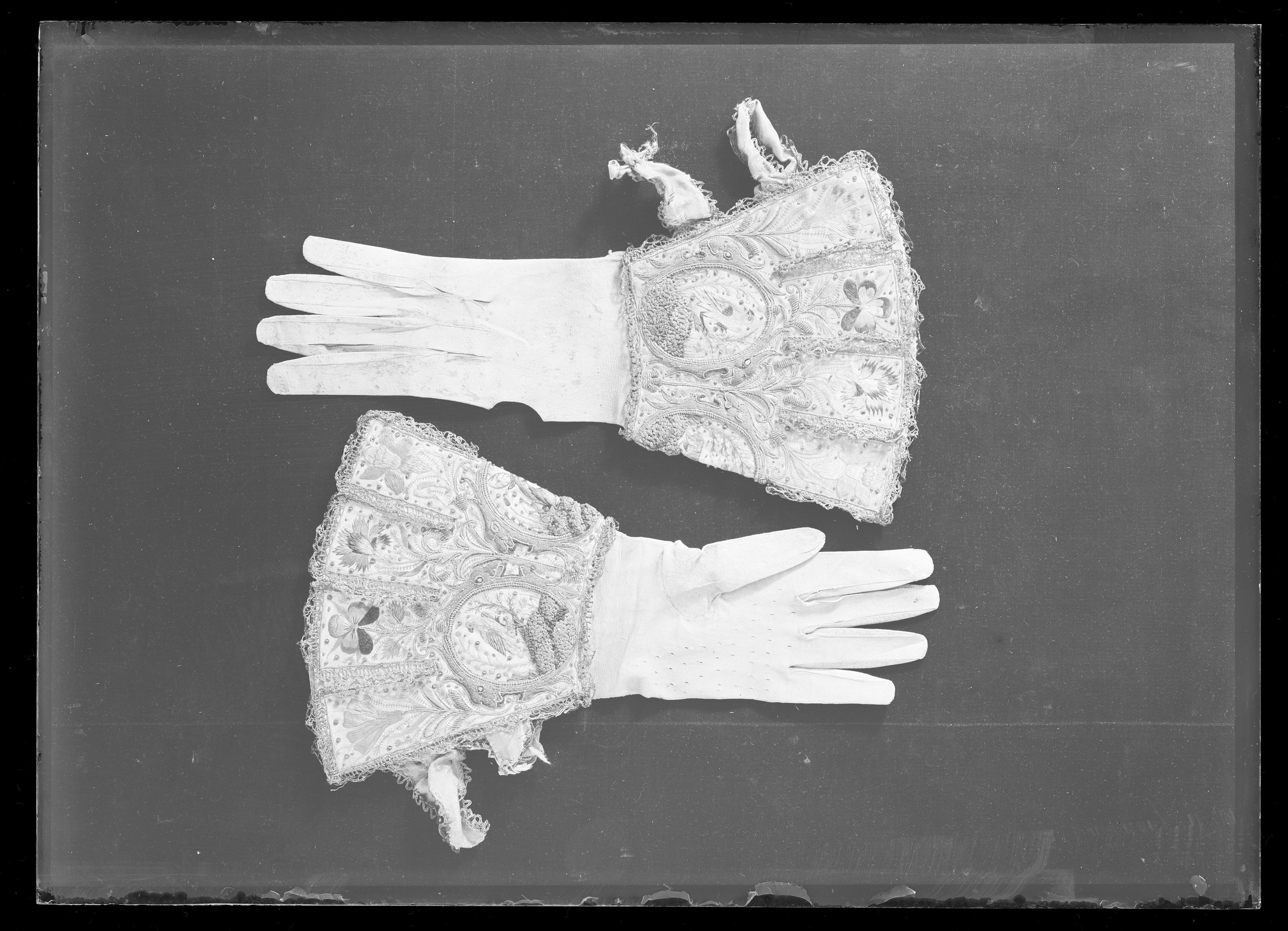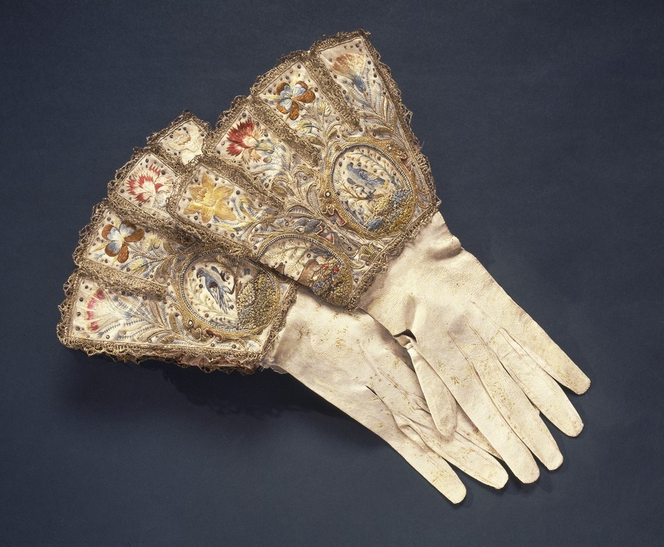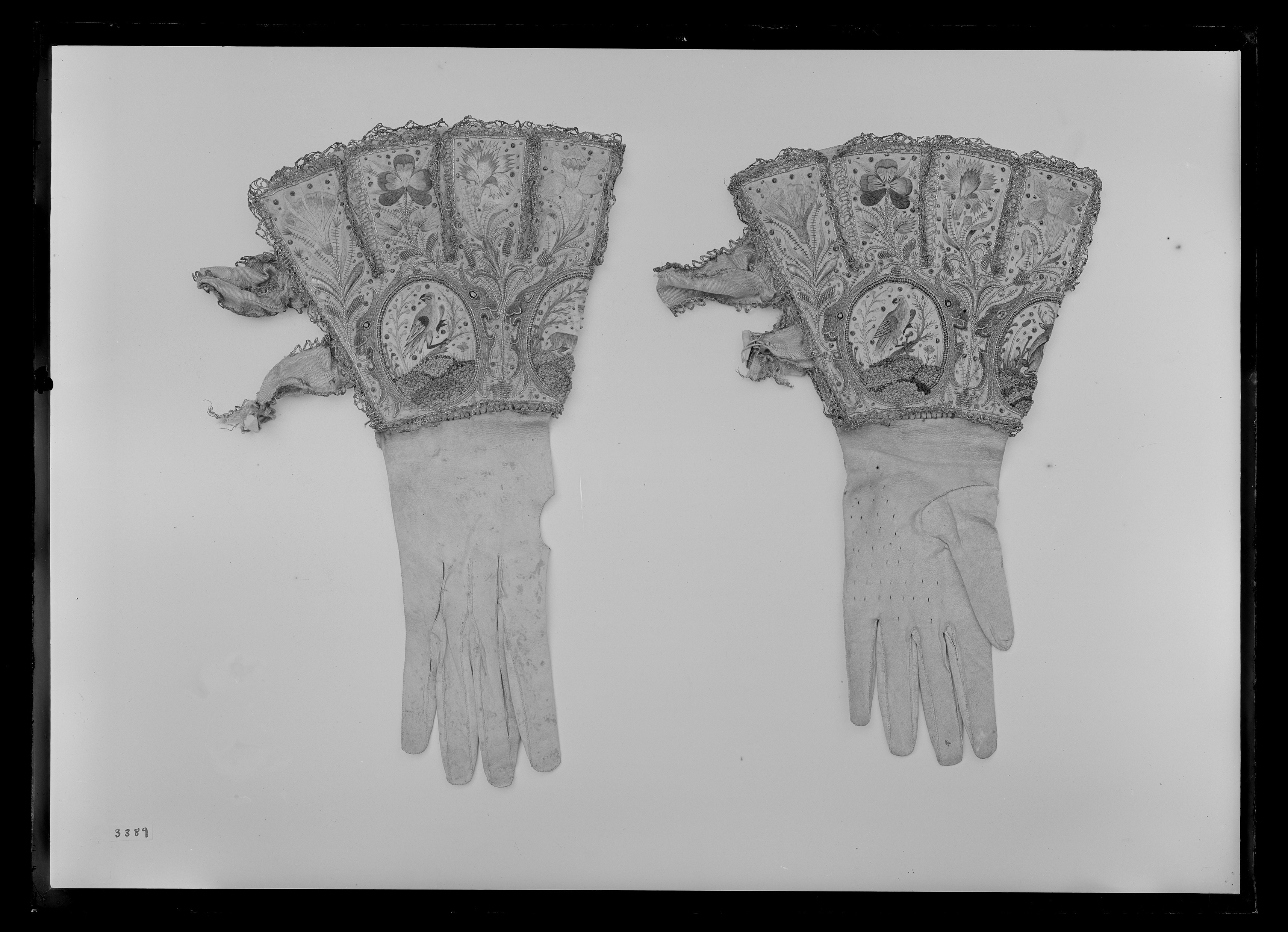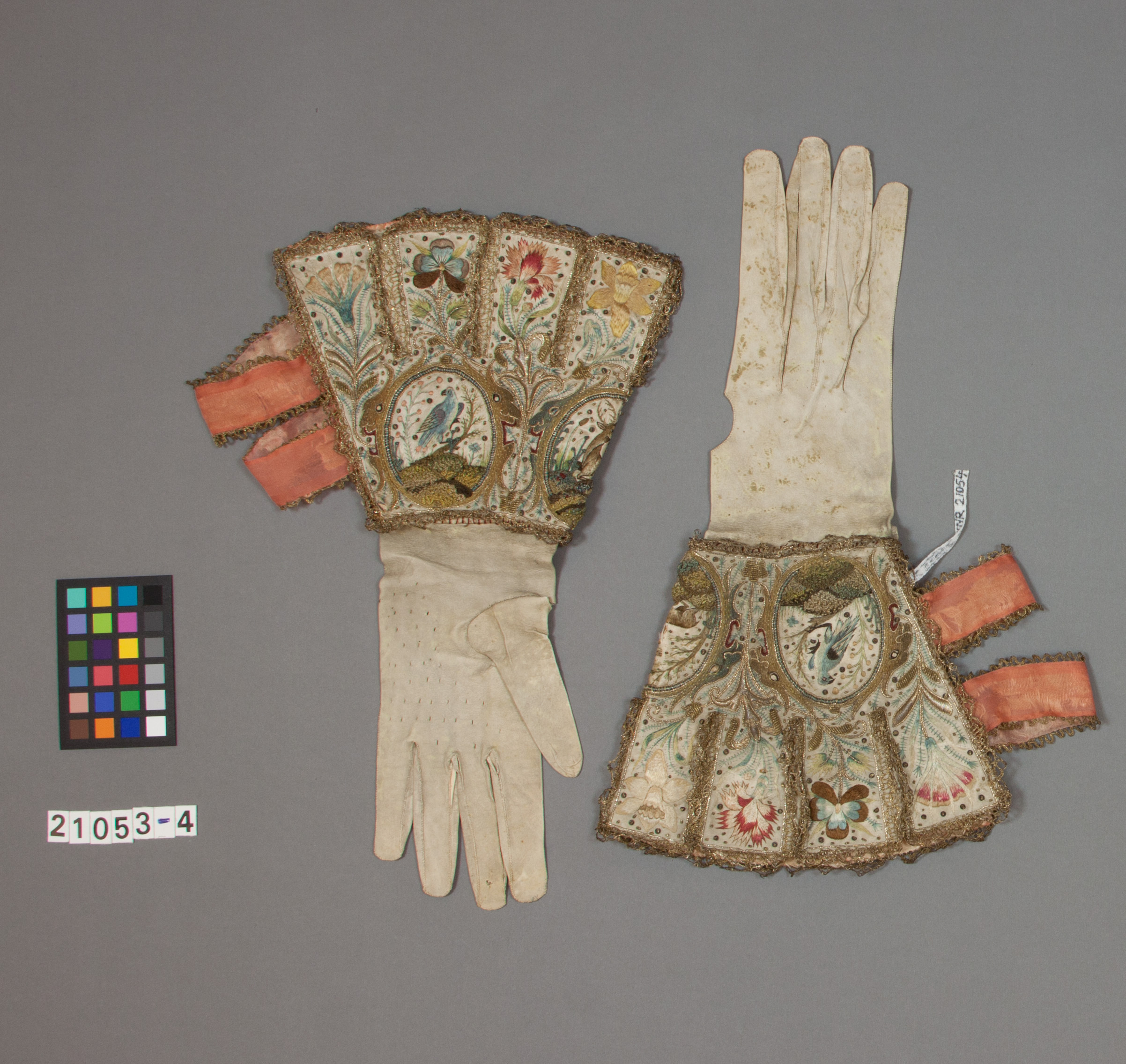 Handske av vitt glacéskinn med stor krage broderad med silke i många färger samt med guldtråd, kantiljer och paljetter. Kragens nedre del är utformad med medaljonger i vilka brodeats olika djur.Mellan medaljongerna växer stjälkar fram som avslutas med naturalistiskt utformade blommor närmast kragens överkant: malva, pensée, nejlika och påsklilja. Blommorna avskiljs genom guldspets som delar in kragen i kantiga flikar. Själva skinnet är dock inte uppklippt. I 1867 års Livrustkammarinventarium har handskarna sammanförts med Karl X Gustavs kröningsdräkt. Denna uppgift går endast tillbaka till 1855 års inventarium. De ursprungliga silverspetsdekorerade kröningshandskarna hade då förkommit. Den ovan beskrivna handsken samt inv. nr 21054 är av ett tidigare datum, ca 1610. Det har ingen säker proveniens och det kan inte heller konstateras när de införlivats med Klädkammaren.