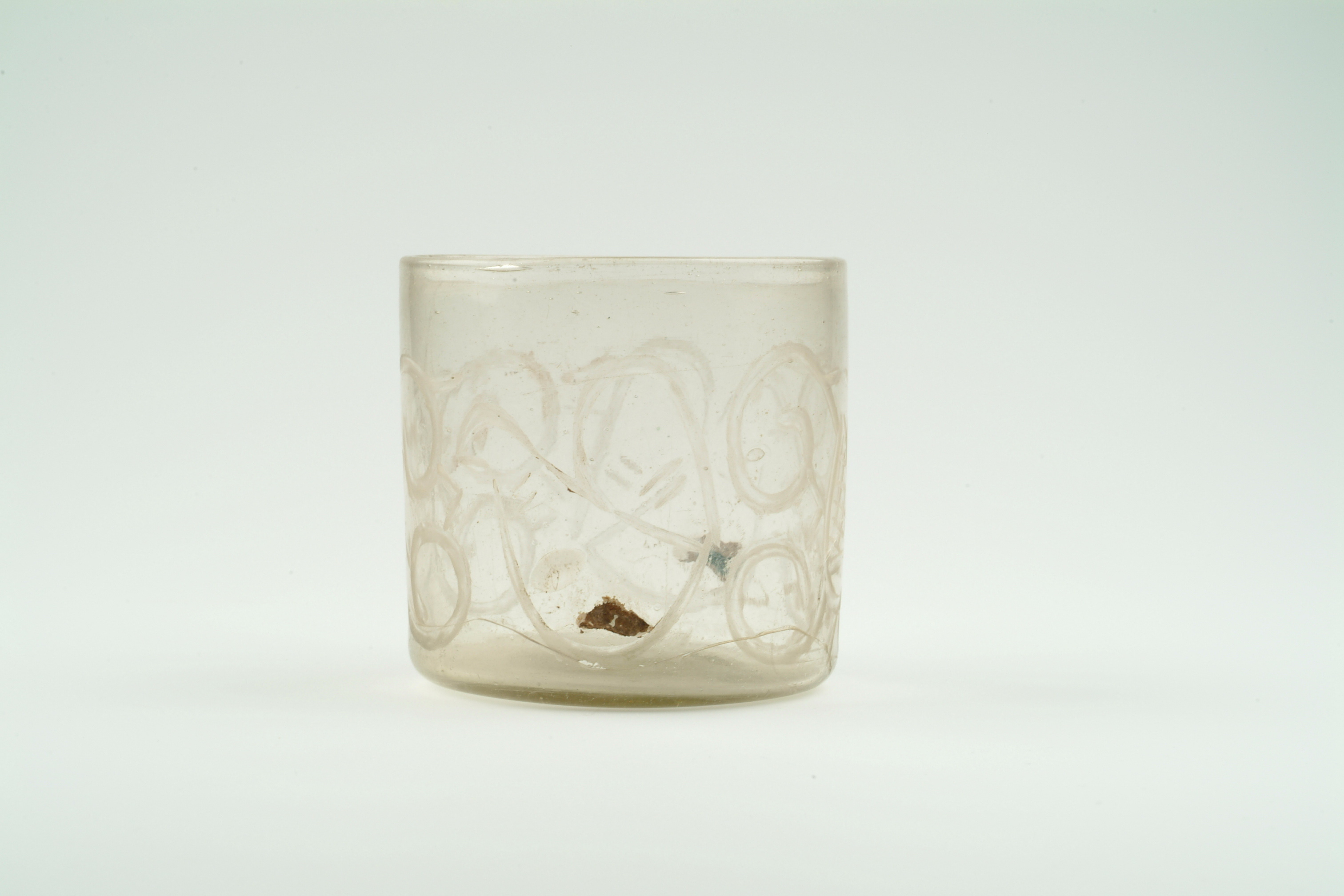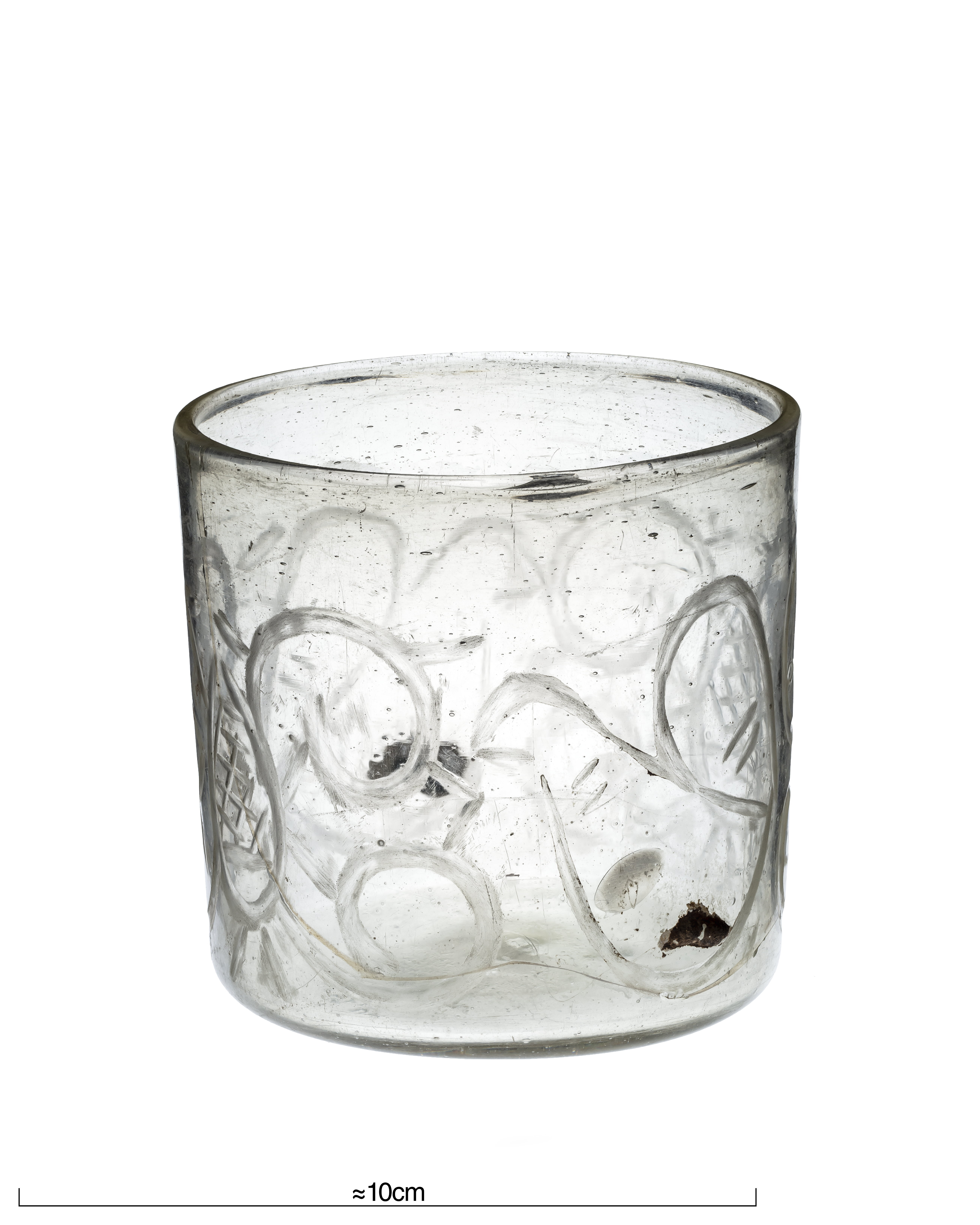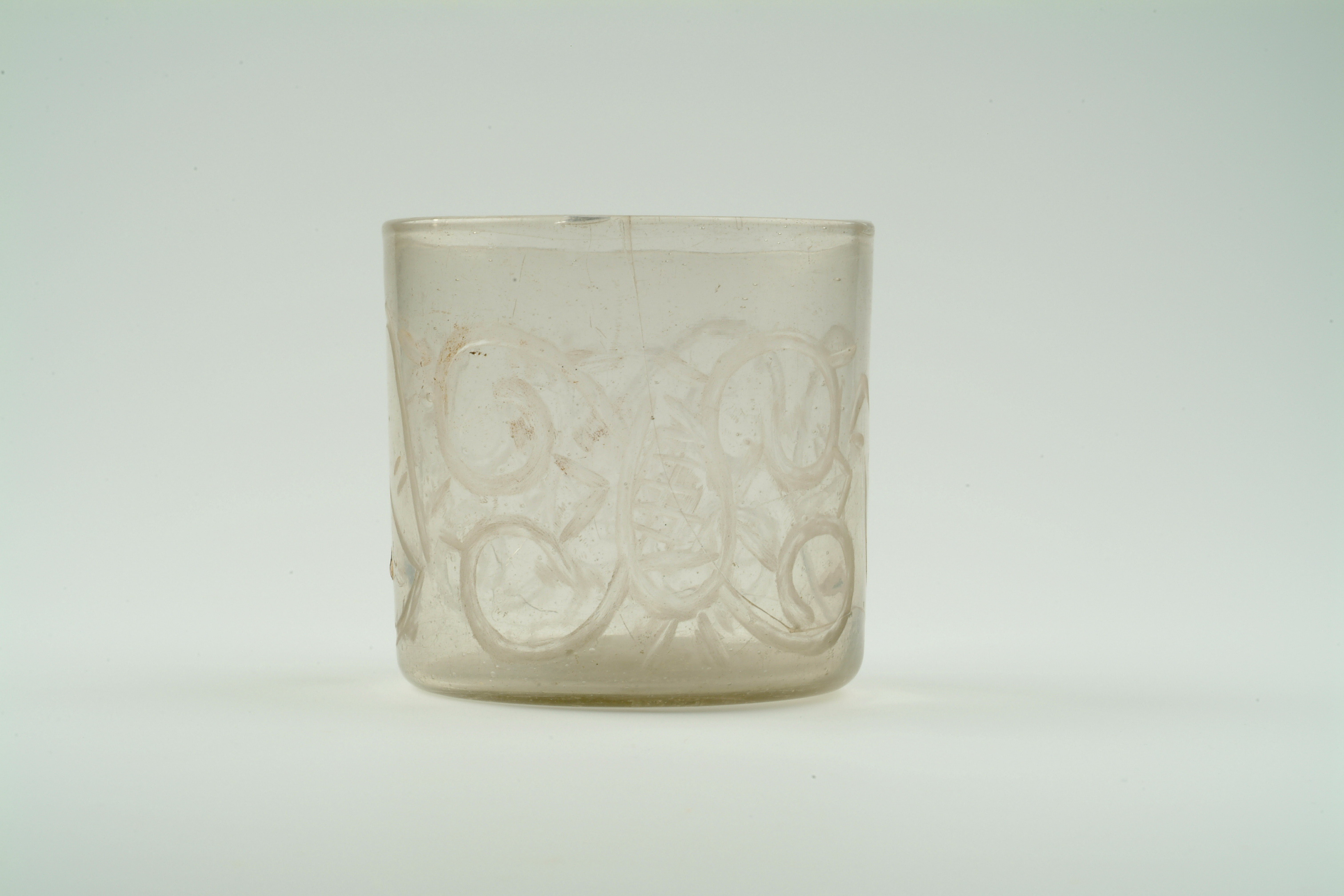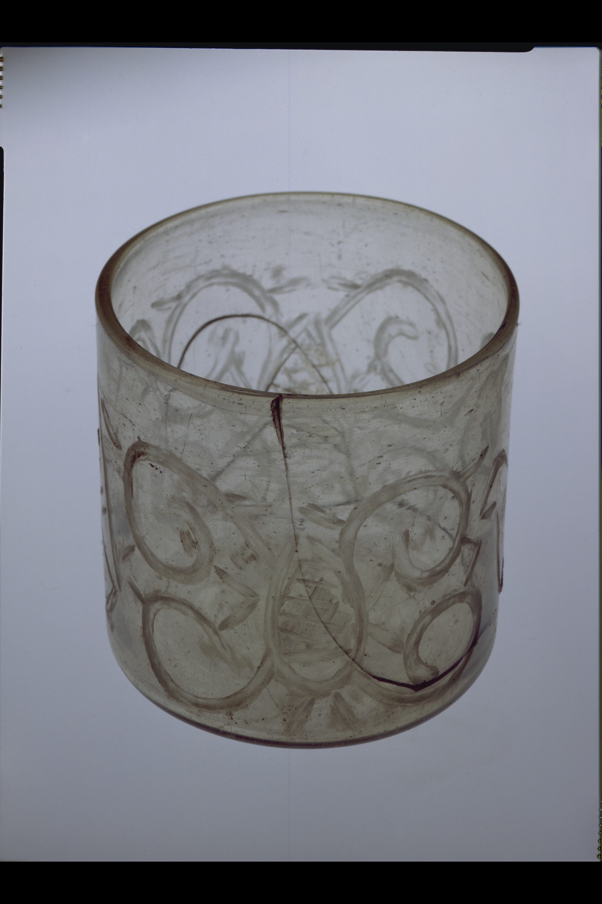 Bägare med slipad dekor bestående av två fåglar och ett livsträd. Kärlet härstammar från området kring Iran/Irak.