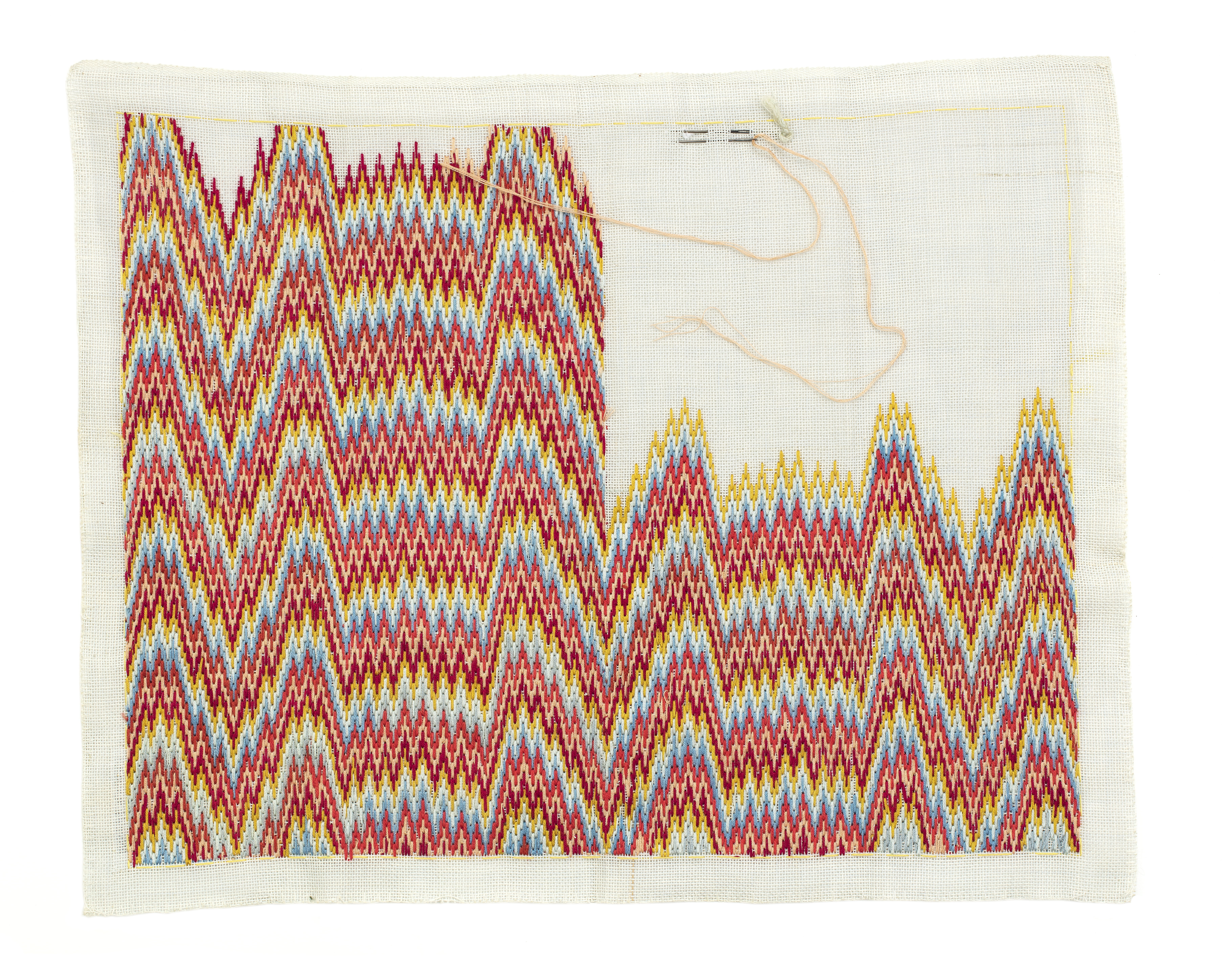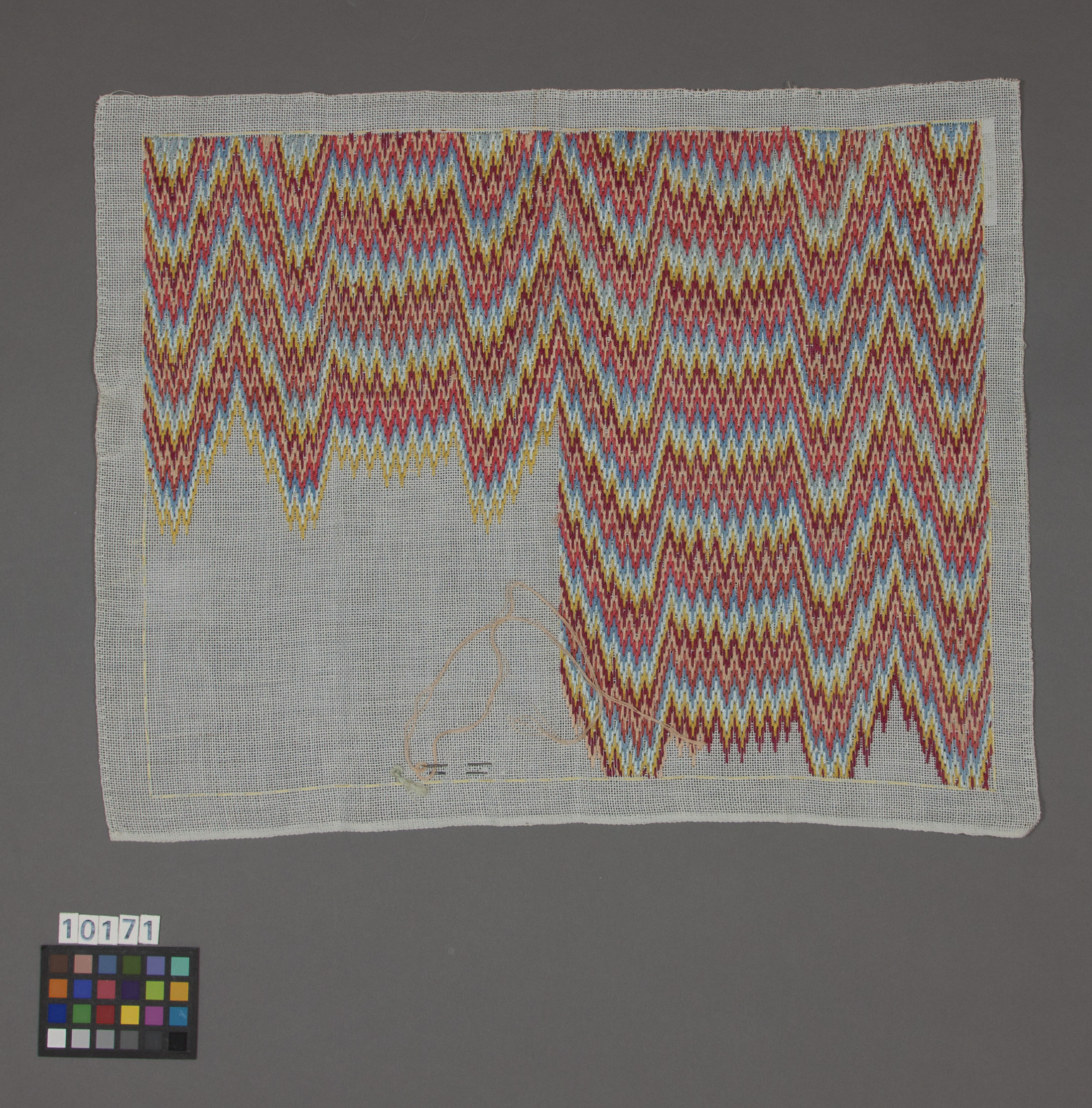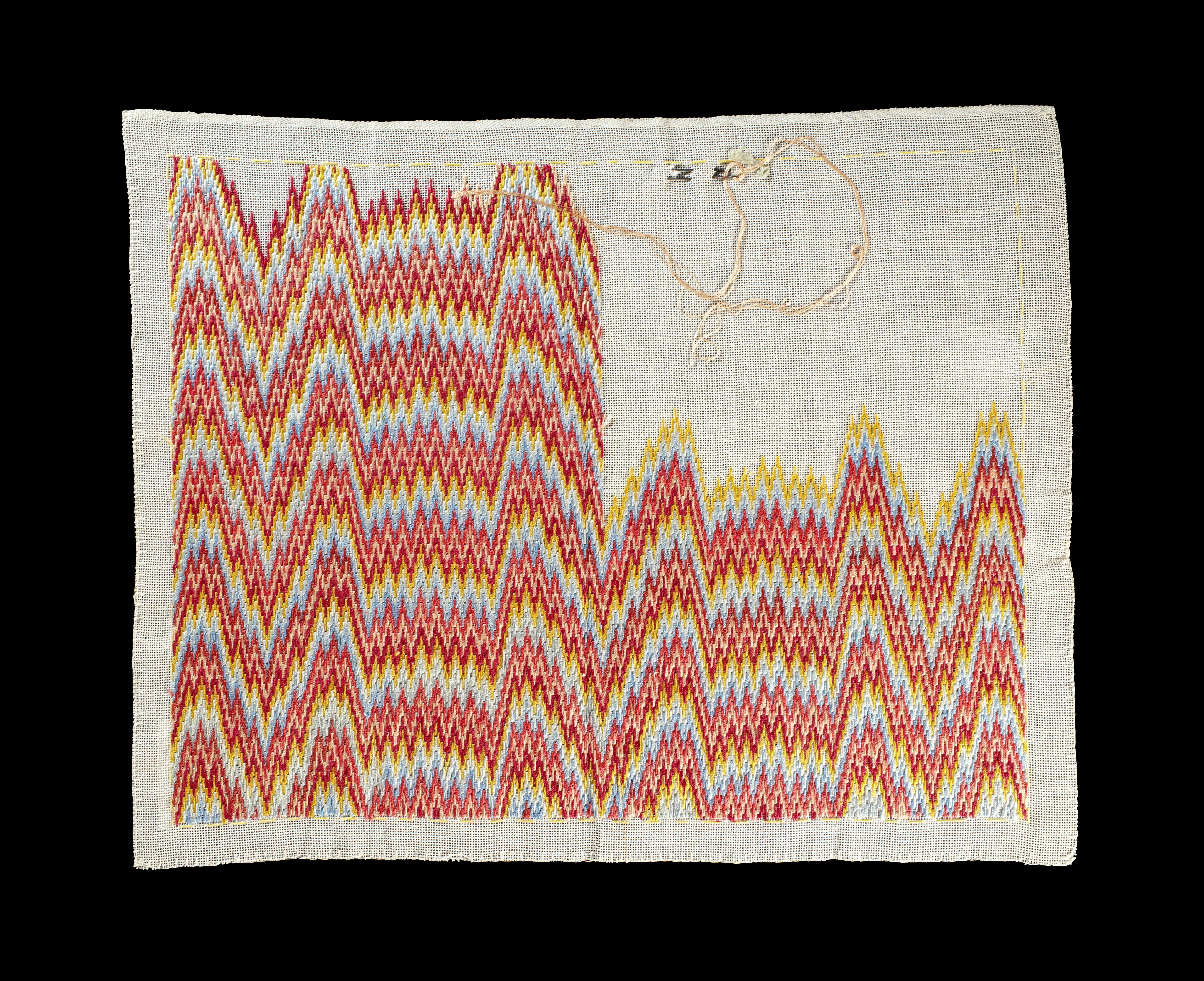 Broderiet är ett rektangulärt stramaljstycke kantat med langettsöm på tre sidor och med stadkant på den fjärde. 26 mm från kanten runtom finns en glest stickad kant av gult silke. Innanför denna yttäckande broderi av sick-sackrader av omväxlande gult, rött, rosa, orange och blåttsilke i viggsöm. Broderiet är inte avslutat, det sista stygnet är gjort med rosa garn och nål.