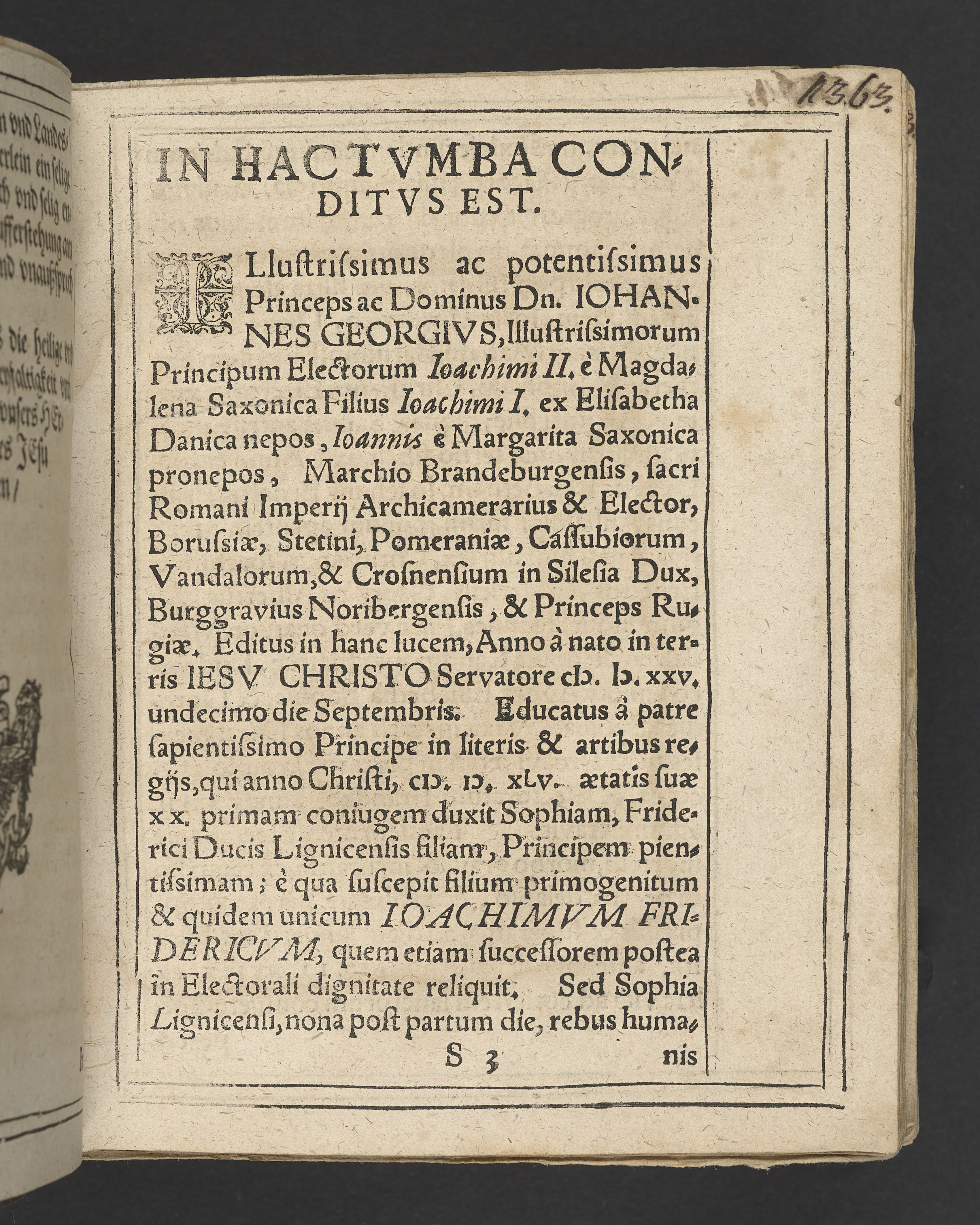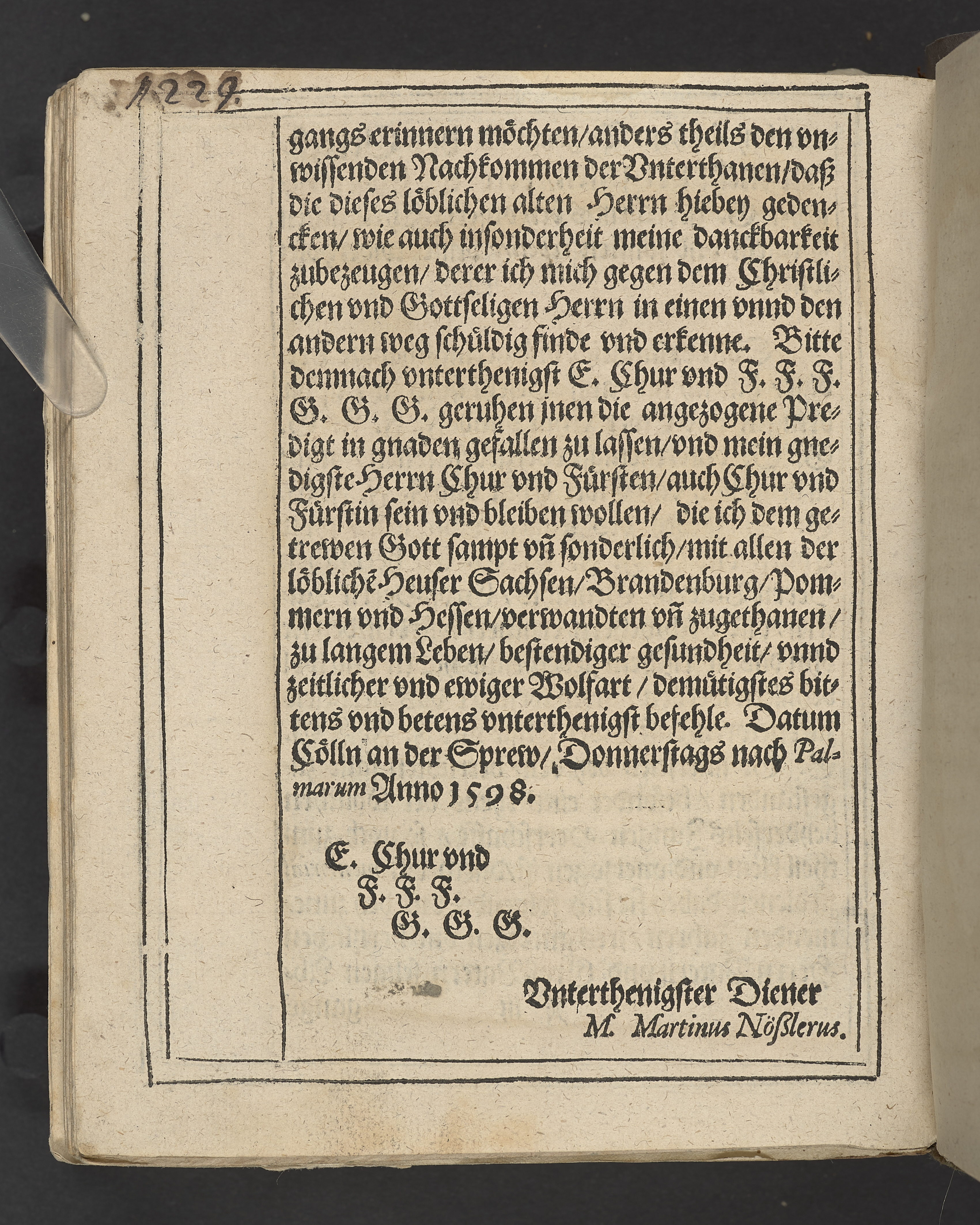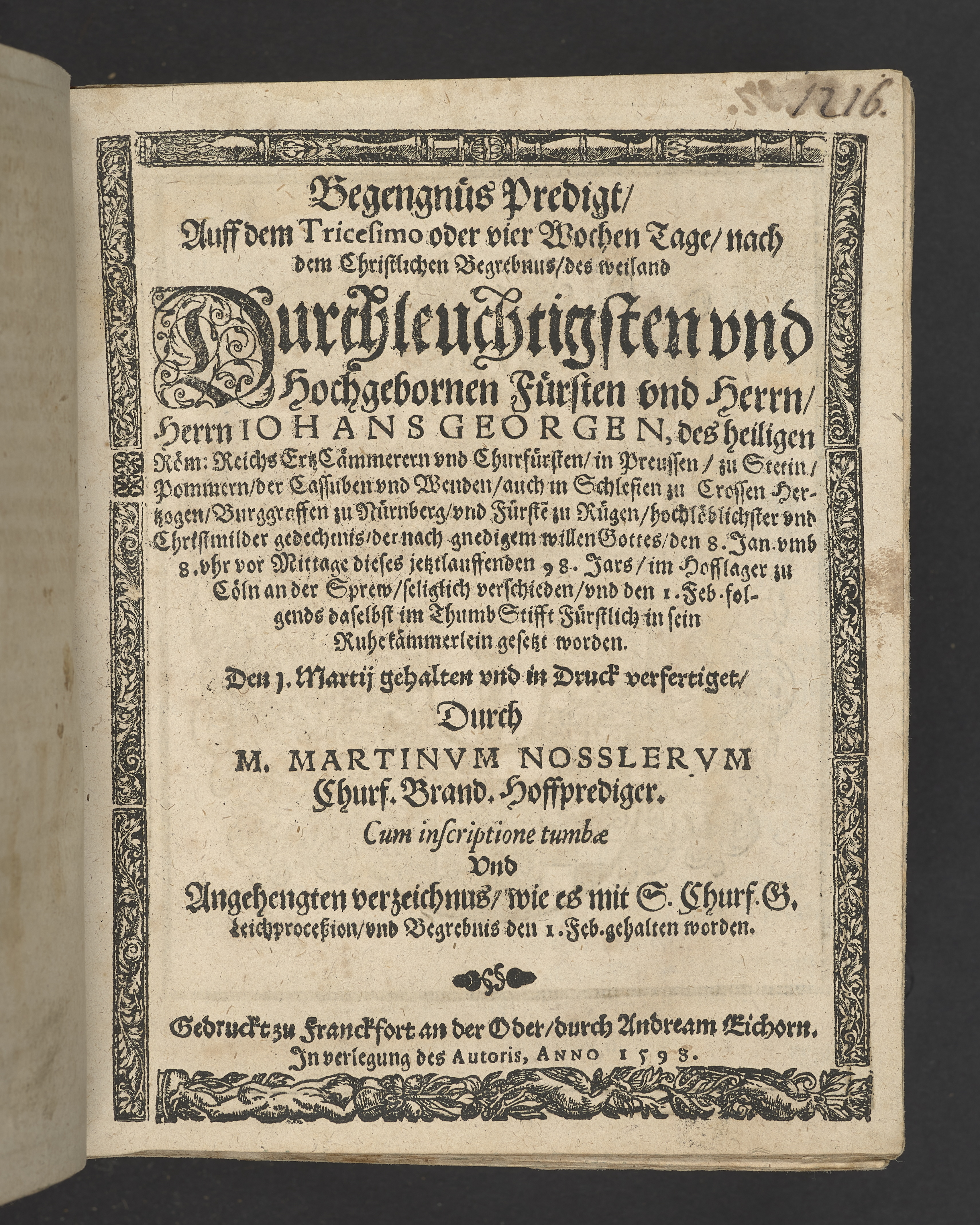 Begengnüs Predigt, auff dem Tricesimo ... nach dem Christlichen Begrebnus des ... Herrn Iohans Georgen, des heiligen Röm: Reichs Ertz Cämmeren vnd Churfürsten in Preussen, zu Stetin, Pommern ... dieses jetztlaufenden 98. Jars ... den 1 feb ... in Thumb Stifft ... in sein Ruhe-kämmerlein gesetzt worden. Den 1 Martij gehalten vnd in Druck verfertiget, durch M. Martinvm Nosslervm ... Cum inscriptione tumbæ ... Gedruckt zu Franckfurt an der Oder, durch Andreas Eichorn. In Verlegung des autoris, anno 1598.