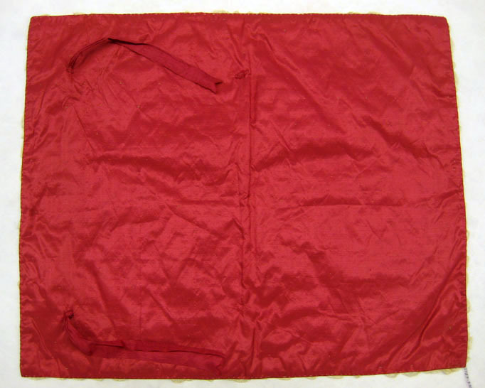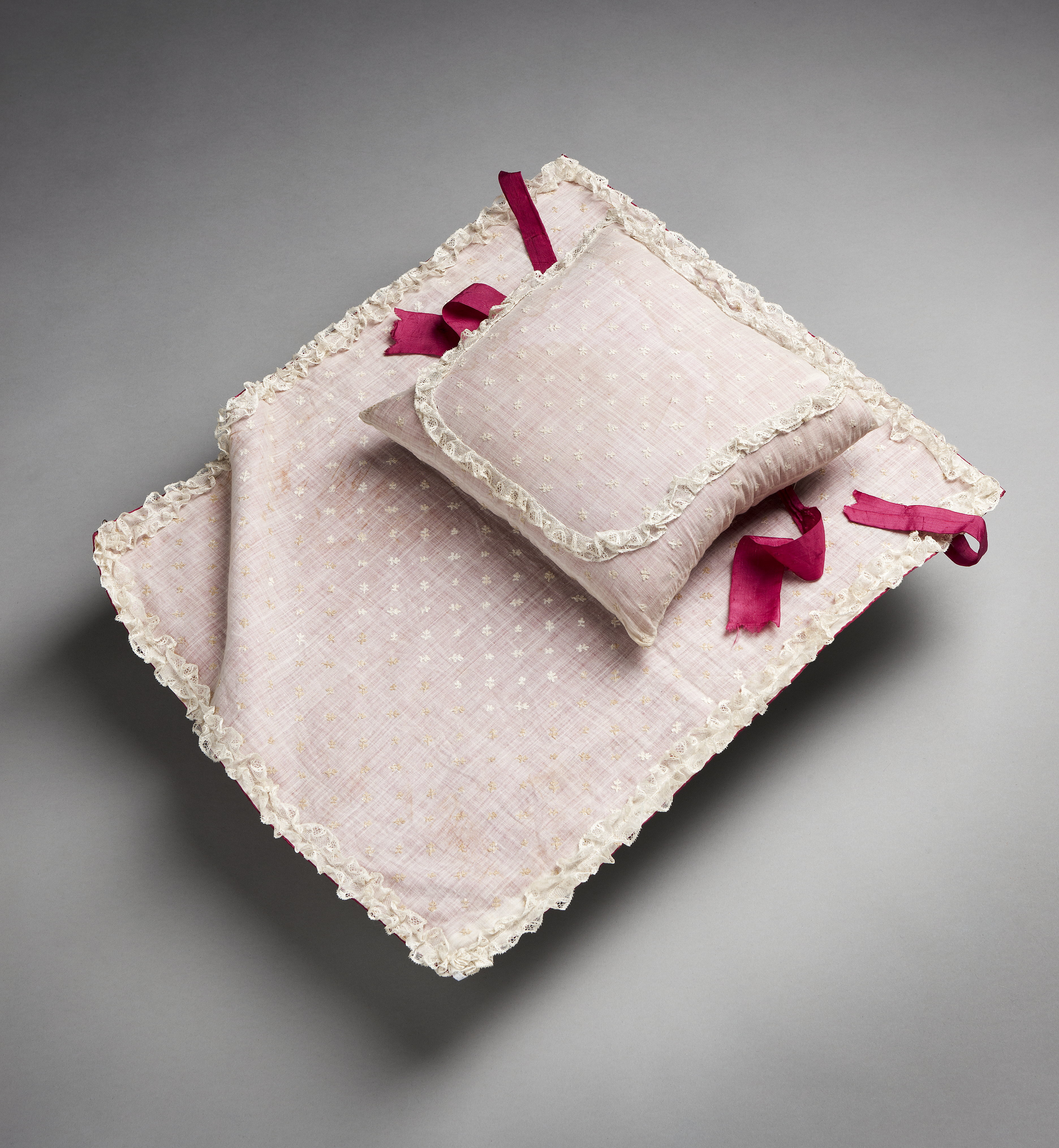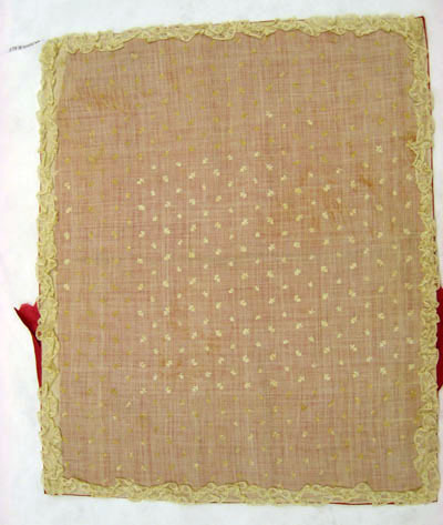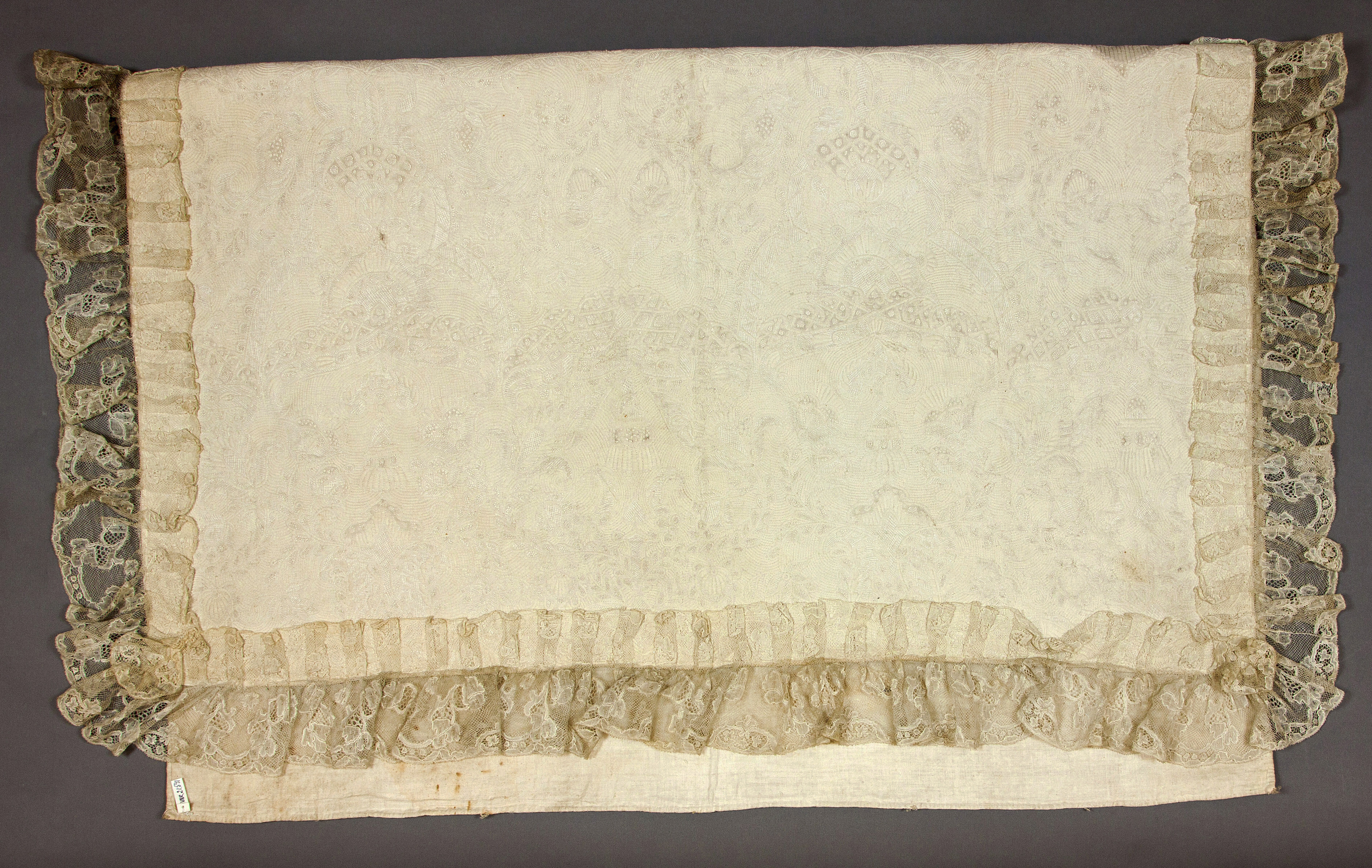 Plagget ingår i en babyutstyrsel som beställdes till det barn som Hedvig Elisabeth Charlotta felaktigt trodde sig vänta sommaren 1775. Plaggen har senare använts av de barn Hedvig Elisabeth Charlotta födde, samt av Gustav IV Adolfs och drottning Fredrikas barn. Vaggtäcke i rött sidentaft, där ovansidan är prydd med tunt vitt linnetyg (nättelduk) broderat med trebladigt blommverk. Det röda sidentyget syns igenom det vita linnetyget. På vaggtäckets baksida är två stycken 230 mm långa och 37 mm breda band fastsydda.