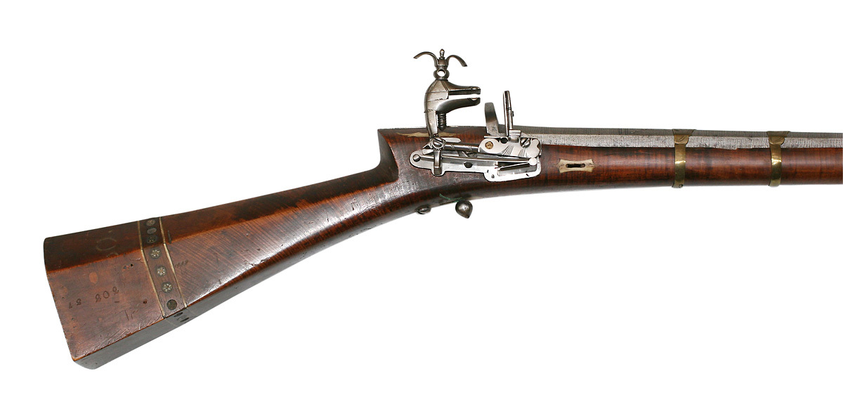 Åttsidig, räfflad pipa av stål, åtta räfflor. Mynningen vidgad. På kammarens ovansida och nära mynningen punsade ornament och två tvärstreck. Sikte i form av hål genom uppstående spetsig skiva bak på pipan. Knoppkorn av koppar. Rund stämpel med orientaliska skrivtecken intill siktet. Åtta pipband av mässing, på ovansidan vidgade och konturerade med graverad dekor i form av blad. Det främsta pipbandet utan dekor. Drall ½ varv. Snapplås av stål med plant låsbleck. Rak hane med kraftiga rundade käkar. Med graverad linjedekor. Lös överkäke. Käkskruv med rund genombruten hals och tvåflikig vingformig mutter. Batteri med räfflat eldstål med plan linjegraverad baksida, slagytan fäst med skruv. Mellan batteriets nederkant och hanen stålbleck med enkel filad och graverad dekor och inslagen rund stämpel av guld med orientaliska skrivtecken. Utvändig slagfjäder. Fästning: Två låsskruvar. Knoppformig avtryckare. Brun helstock av trä. Rak femsidig kolv med smal kolvhals, något vidgad bakåt. Skarp kolvnacke. Runt kolven inlagd bård, två linjer av ben mellan dem cirklar av mässing med stjärnmönster av ben och svart. På ena sidan instämplat "202" och "37". På var sida om svansskruvbladet vågigt konturerad platta av ben. Beninläggning runt avtryckare och krysskruv. Spetsovala låsskruvsbrickor av ben. Konturerade beninlägg runt två skåror i framstocken för bärrem. Näsband av horn. Tillbehör: Laddstock av trä 753 mm lång. Laddstockens doppsko saknas. Flera av inläggningarna på kolven borta.