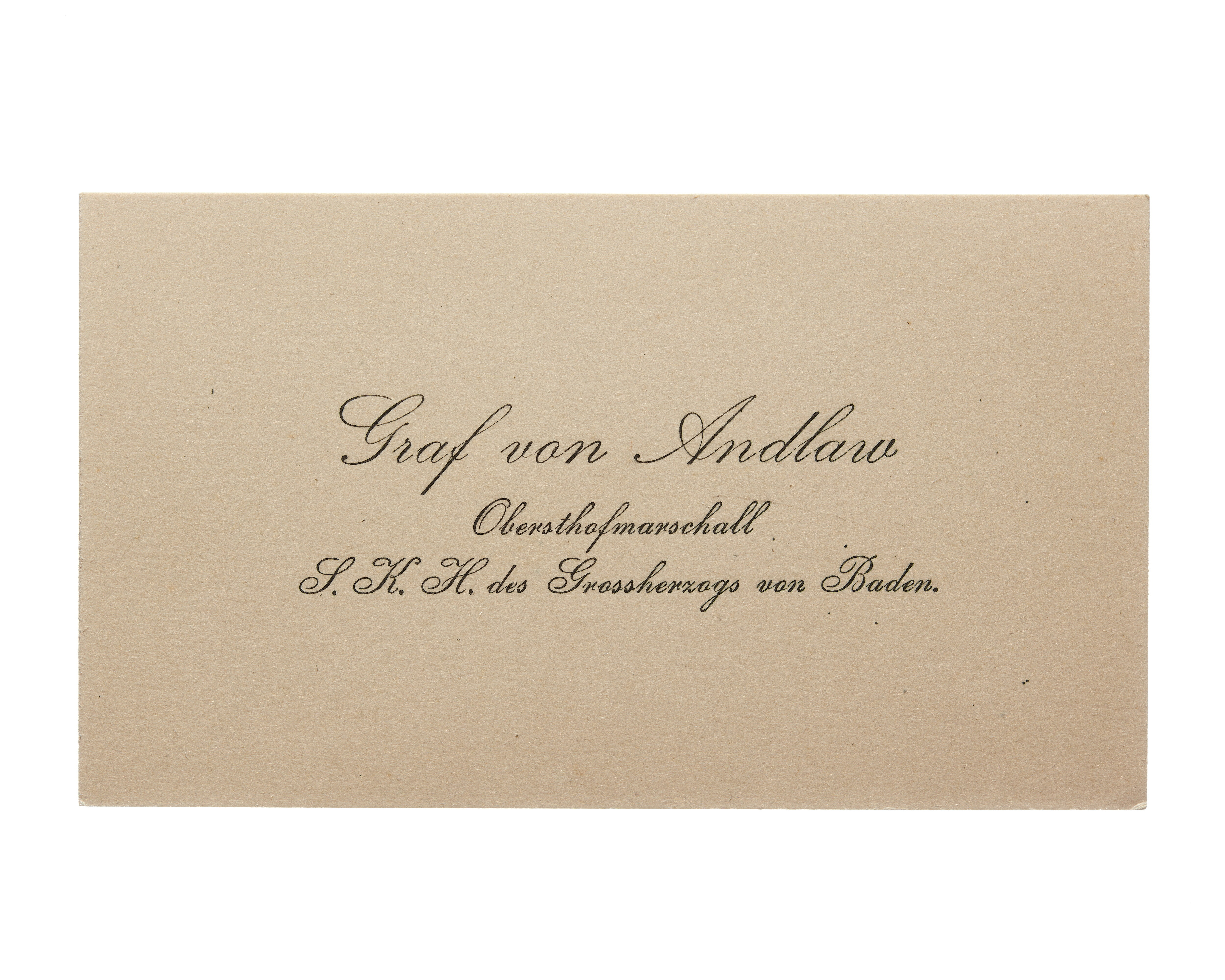 Ett visitkort från Kamill Graf von Andlaw, nedanför namnet står på tyska "Obersthofmarschall / S.K.H. des Grossherzogs von Baden".