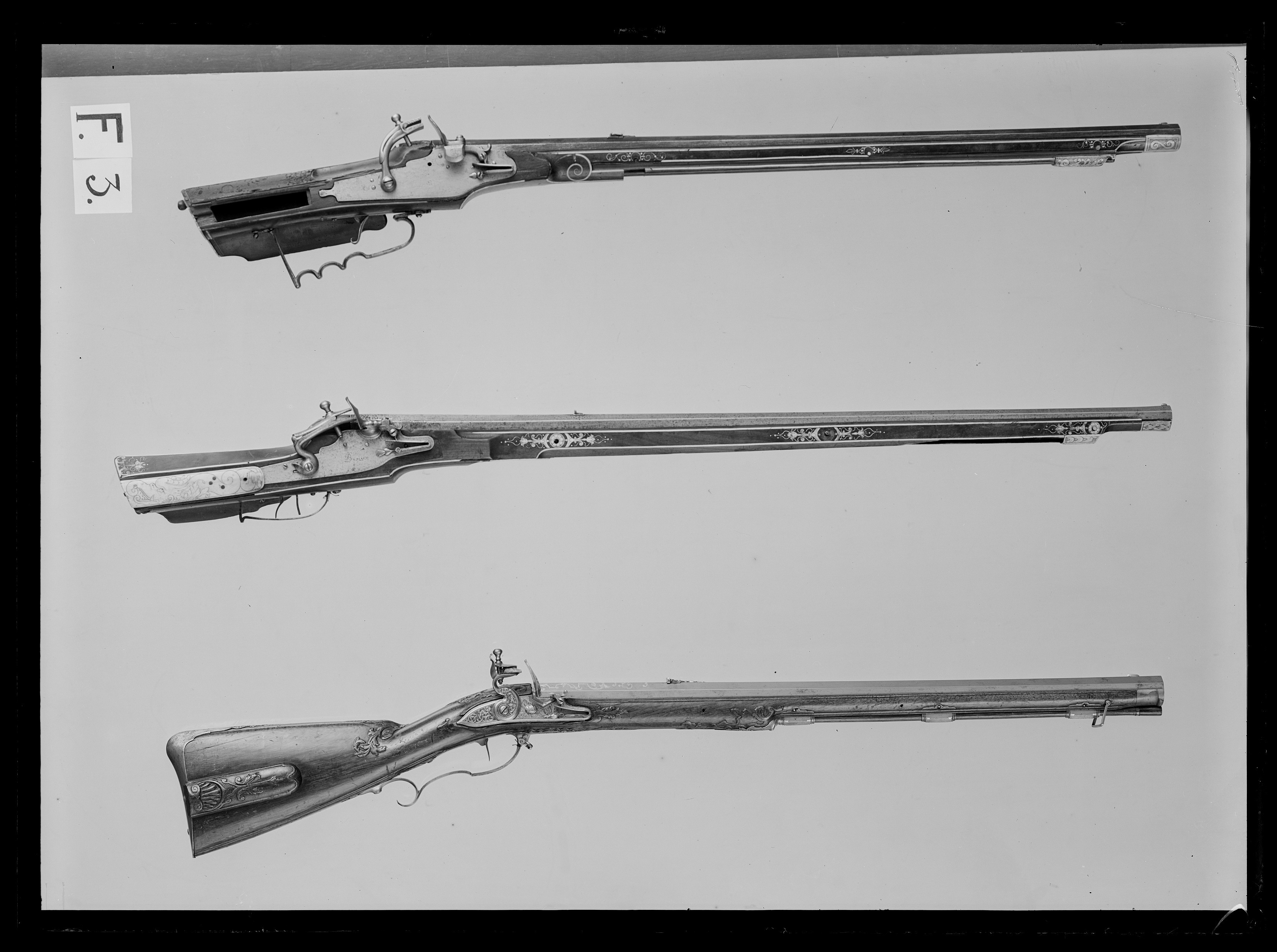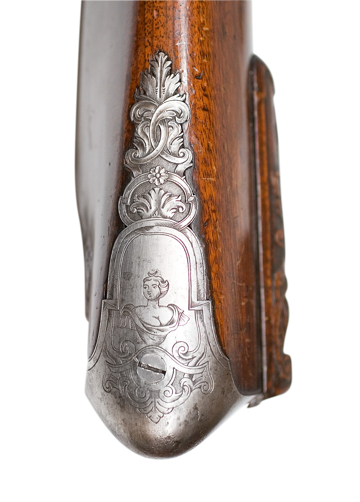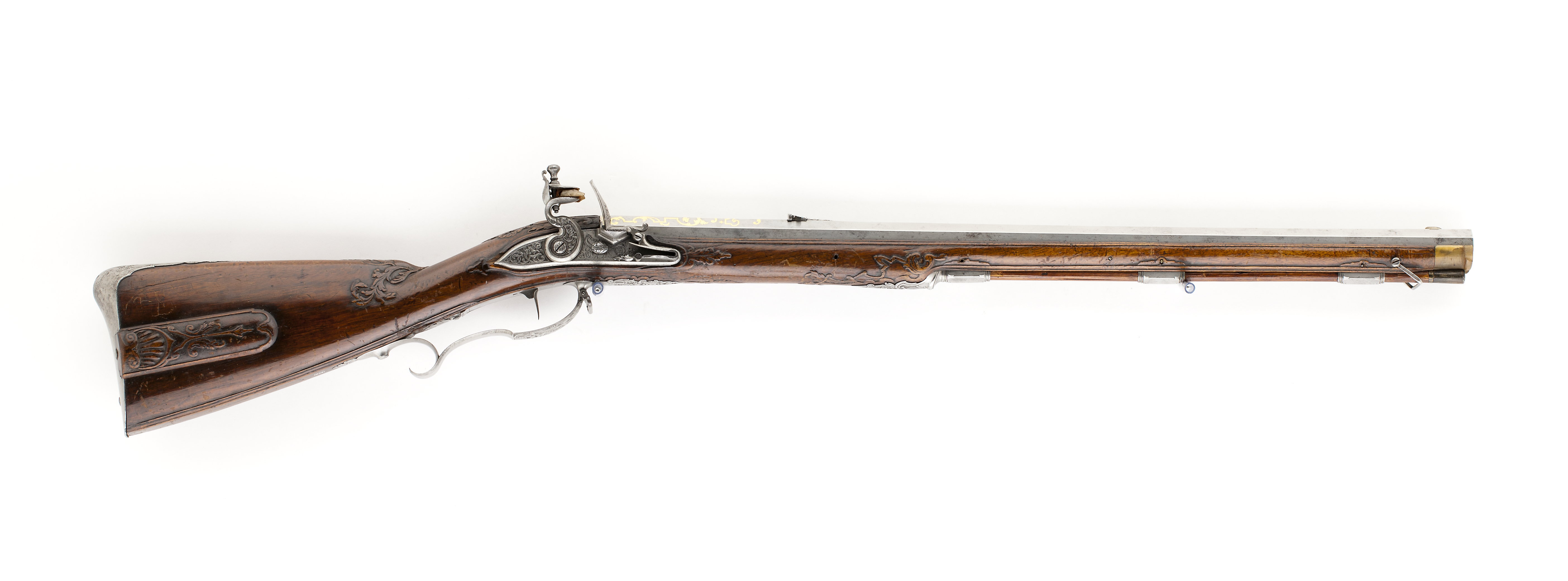 Åttsidig, räfflad pipa, rosenräffling, fem breda räfflor och däremellan två smalare. På kammaren stor guldstämpel, öppen krona: "A // IÖNKÖPING // L:B B", vid pipbasen på de tre övre sidorna inslaget med guld två linjer och däremellan punkter av två storlekar, därframför band- och rankdekor i guld i Berainstil. Bakåt breddat svansskruvblad, graverad, triangulär spets. Silverfodrat fänghål. Riktmedel: Inlaxat klaffsikte av stål, en uppfällbar klaff (ena vingen avbruten), framåtriktad spets med bladdekor i stålsnitt. Inlaxat, spolformigt korn av silver. Fästning: Tre häften, pipan fäst med kort krysskruv, ett (urspr. två) pipstift samt vid mynningen med främre rembygelns skruv. Flintlås med plant låsbleck, fasade, rundade kanter. Bakom hanen dekor i stålsnitt, band- och rankverk i låg relief, hundframkropp(?), pärlstavskantbård, framför hanen samma kantbård, graverad dekor i form av band och rankor, övergående i människofigur hållande textband: "L:BLEKBERG", delvis dolt av skjutsäkring med ovalt välvt huvud. Grotesk mask i stålsnitt. Nedanför fängpannan övergår rankan i cirkel med bakåtseende djur. S-formigt svängd hane, fasade, rundade kanter, pärlstavsbårder runt hanskruven och längs kanterna, dekor i stålsnitt, rankor i låg relief, trumpetblåsande amorin (?), på hanhalsen djurhuvud. Runda käkar, käkskruv med rundat, koniskt huvud. Nötskruv med välvt huvud, graverad damaskering? Fängpanna med fals, lock med brett fasade kanter, eldstål med bred mittås, dekor i stålsnitt, upptill band och rankor, nertill grotesk mask. Batterifjäder med graverad, delvis fasad kant s-formigt svängt, flikigt fjäderlöv. Nöt med yttre springkil. Fästning och avtryckare: Två låsskruvar. Rak avtryckare. Långt, rektangulärt avtryckarbleck, baktill avslutat med flikigt blad. Helstock av valnöt med kindstöd och kolvlåda. Snidad band- och rankdekor på kolvlådelocket, vid kindstödet, kolvhalsen, svansskruvbladet, varbygeln och spetsrörkan. Näsband av horn med vulst vid framänden. Beslag av stål, bakplåt med markerad häl, tunga med konturerad spets på kolvryggen, band-och rankdekor i stålsnitt, vid hälen graverad band- och rankdekor samt Dianabyst, fas v, två skruvar (en utbytt), kartusch med i relief mot punsad bakgrund en mansbyst, profil v, mantel, lagerkrans om håret. Tre kantiga rörkor, konturerad spets, rankdekor i relief mot punsad bakgrund. Varbygel med kort, konturerad främre arm med band- och rankdekor i stålsnitt mot punsad bakgrund, i främre stolpen en rembygel. Bred, platt, svagt välvd bygel med graverad dekor, band och rankor, kvinnoporträtt, bröstbild, profil h, djupt urringad klänning, pärlhalsband. Bakre delen med fasade kanter, omvänt c-formig bakre stolpe med upphöjt skruvfäste, avslutad med flikigt blad i stålsnitt, en skruv, ett stift vid främre stolpen. I kolvlådan rester av rött lacksigill. Tillbehör: Laddstock av trä, l: 570 mm, hornskoning, l: 29 mm, i framänden, baktill på skoningen mässingsring, b: 4 mm (laddstocken avkortad?).