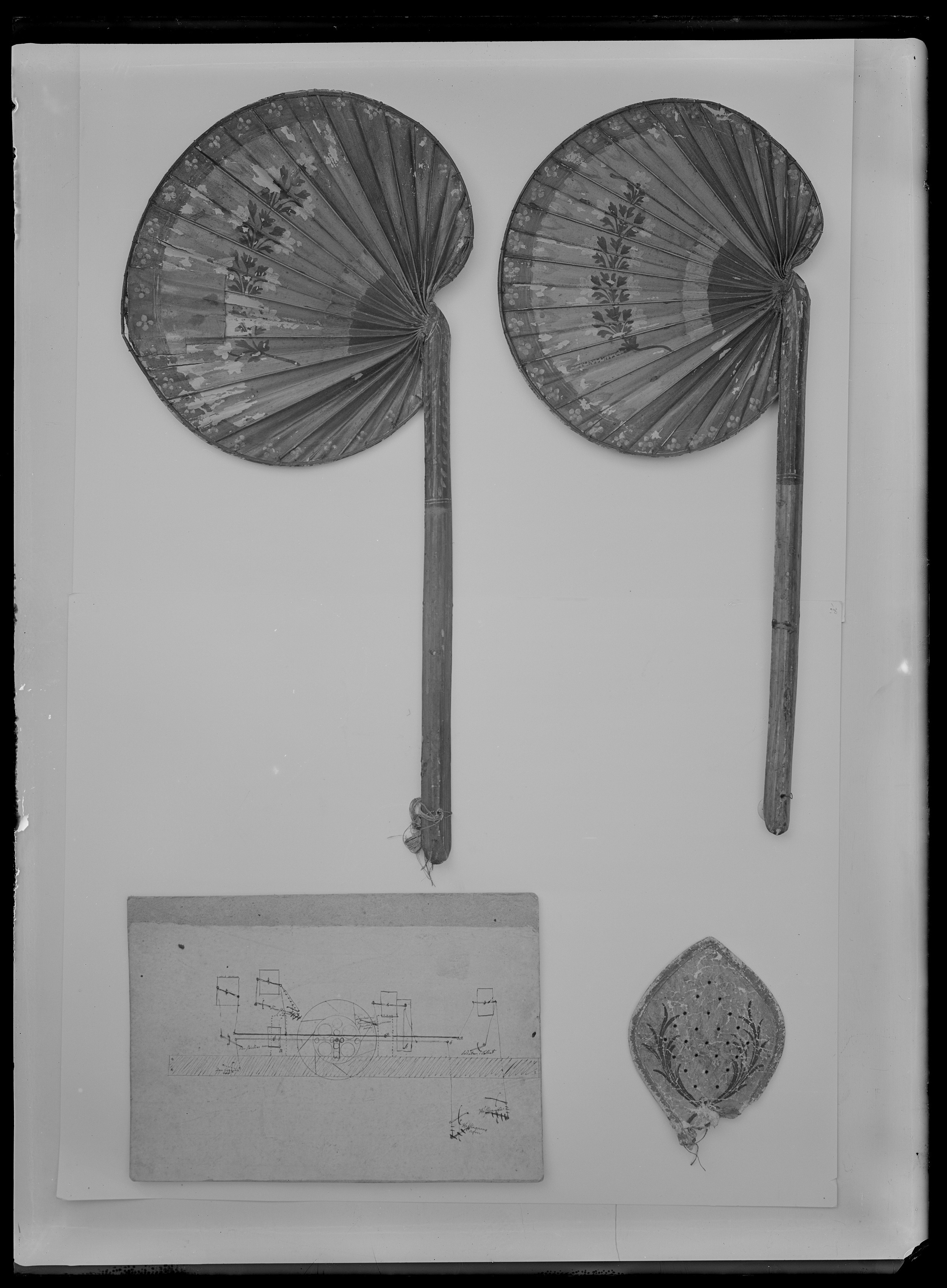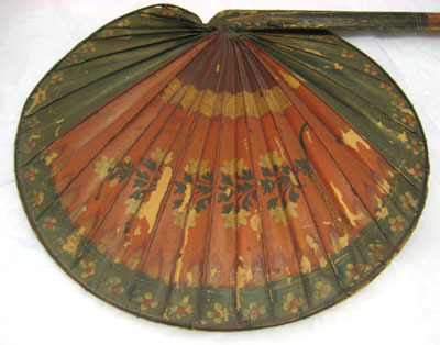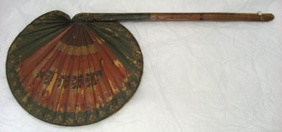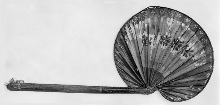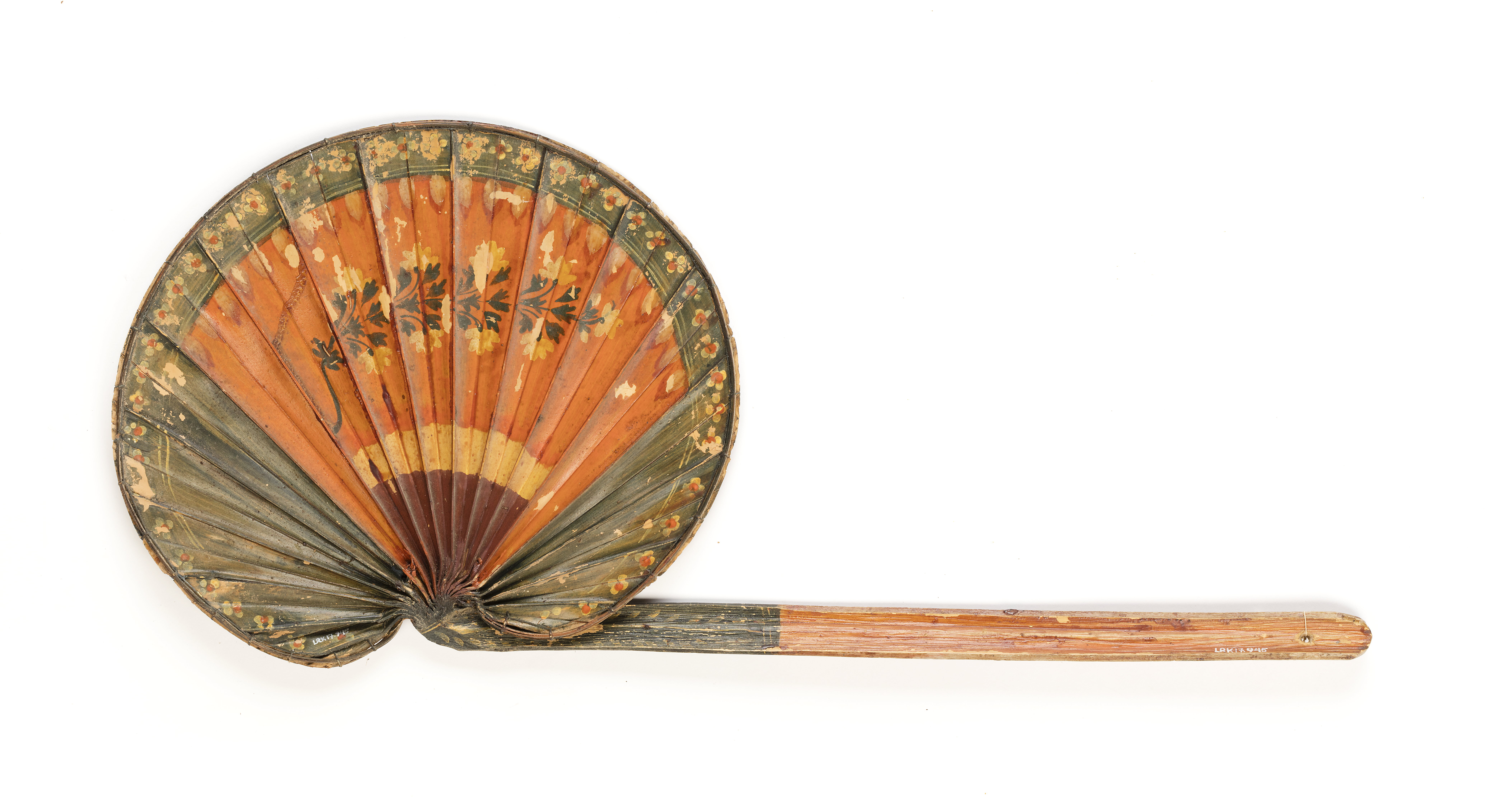 Tillverkad av en palmkvist. Njurformigt veckat blad, förstärkt i kanterna med ribba fäst med grönt snöre. Skaftftet kluvet, C-fomigt tvärsnitt, rakt med tillskuret svagt spetsigt avslut. Målad i rött med gröna kanter och bård, över detta blommor i gult och svart, över bården blommor i gult och rött. Skaftet svagt rödaktigt och upptill grönt med gula blad. Lika på bägge sidor.