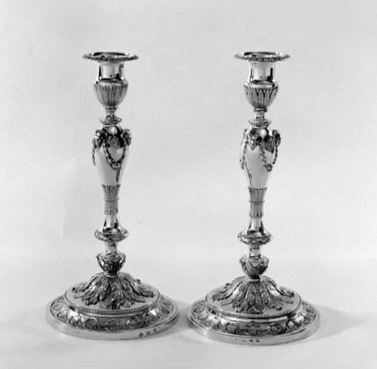 Ljusstake gjuten i silver och förgylld med dekor i relief. Rund fot i 2 avsatser. Dekor utifrånräknat: löpande hundfris med palmettspetsar, pärlstav, akantusblad. Balusterformat skaft med 3gumshuvuden och festoner på ansvällningen. nedanför denna 2bladfriser med pärlstav i mitten samt 2bladprydda noder. Ljusthållaren har bladfris kring nedre delen. Löstagbar manschett med bladstavrunt kanten och med 2 stämplar. På stakens fot 3 stämplar och hörnet av en fjärde. 1) Smith ochsharps fyrpassformade stämpel med DS RS, 2) Londons lejon, 3) Londons krönta leopardhuvud.