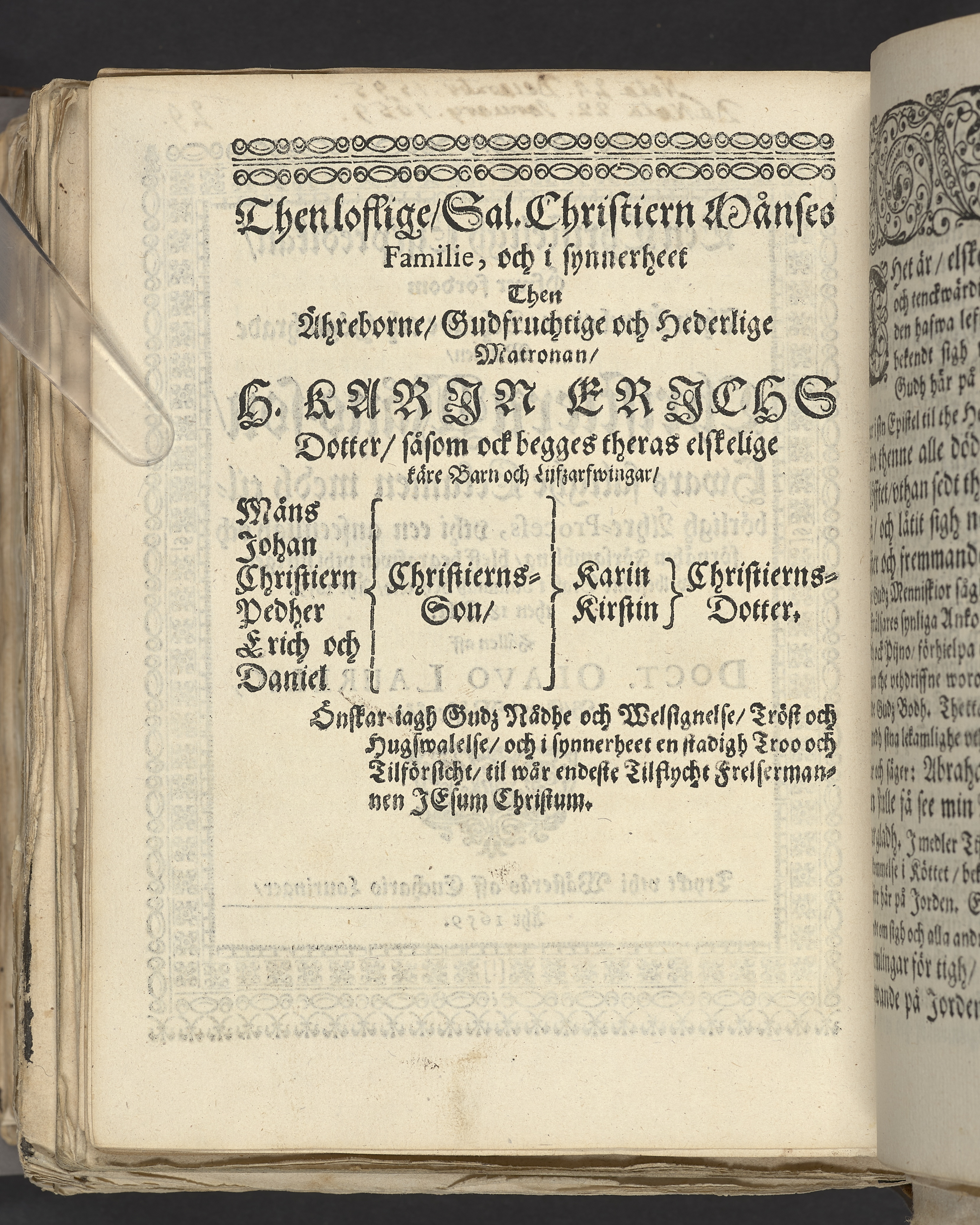 Een christeligh lijkpredikan, öfwer ... Christiern Måns-son, hwars salighe lekamen ... bleff begrafwen ... i Ramnäsz kyrckio, åhr 1659. then 18 febr. Hållen aff doct. Olavo Laurelio ... Tryckt vthi Wästerås aff Euchario Lauringer, åhr 1659.