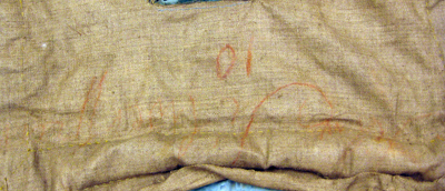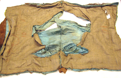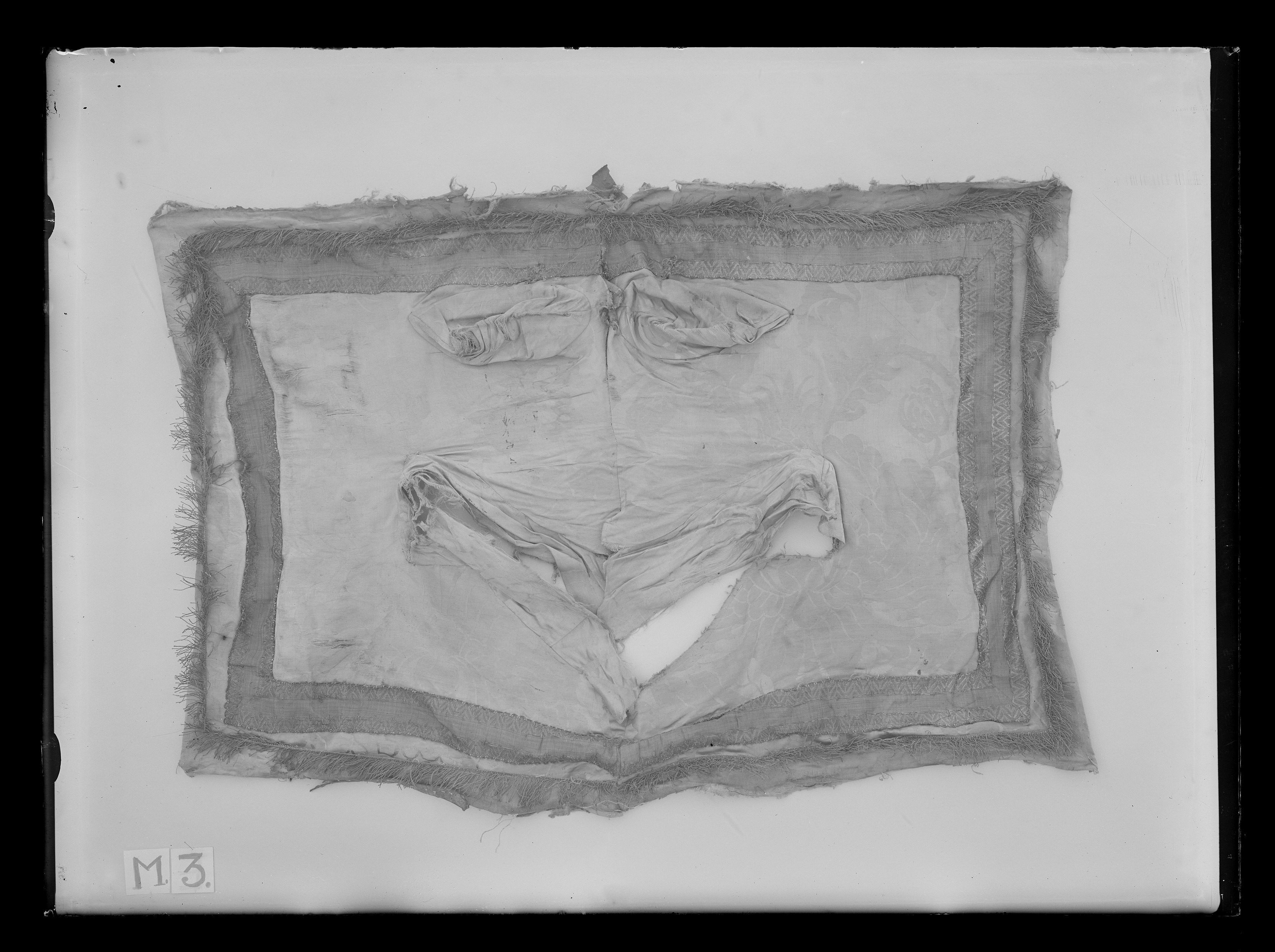 Rektangulärt sadelöverdrag av blå sidendamast fodrat med grov beige linnelärft. Överdraget är sytt med en ryggsöm och format att passa sadeln. Överdraget kantas nedtill av en 70 mm bred guldgalon. Galonen är av förgylld metalltråd- och lan, i mitten i ett ribbat mönster och på sidorna i geometriska mönster och med små rundade flikar i kanterna. Runtom överdraget, utanför galonen, är påsytt en 45 mm lång frans av tvinnad förgylld metalltråd.