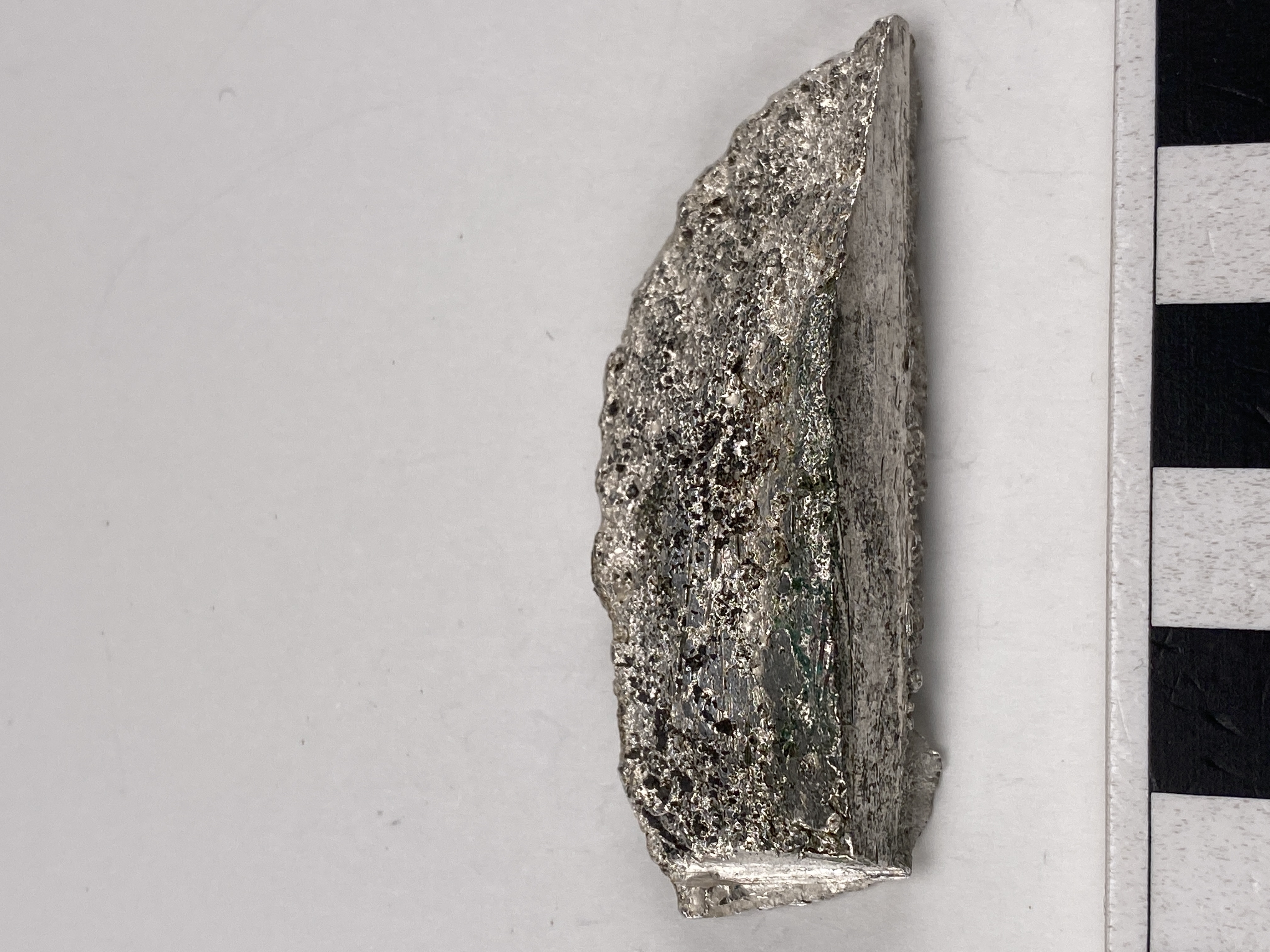 Silvergöt. Ursprungligen sannolikt rundad/oval, åtminstone två stycken har huggits ifrån den. Ett huggmärke även tvärs över undersidan.
