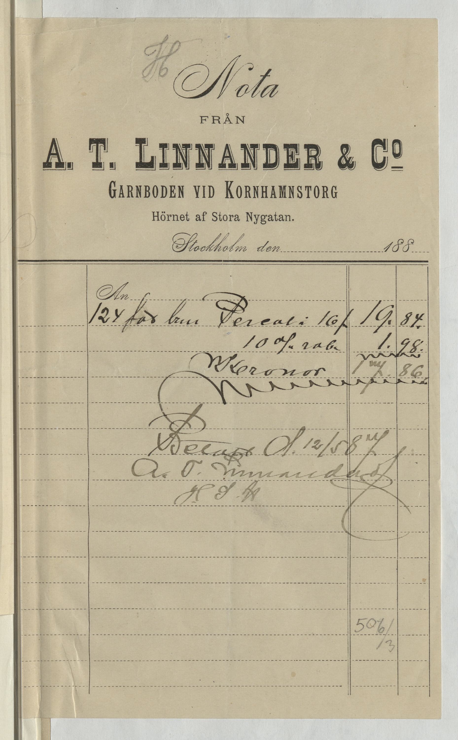 Kvitto från A. T. Linnander & Co. Garnboden vid Kornhamnstorg. Stockholm, 1887.