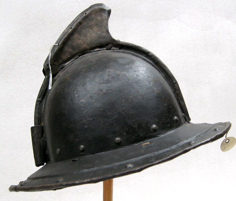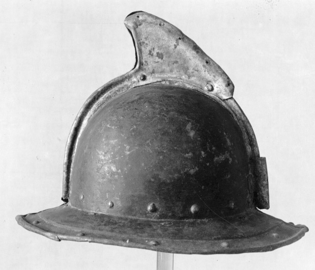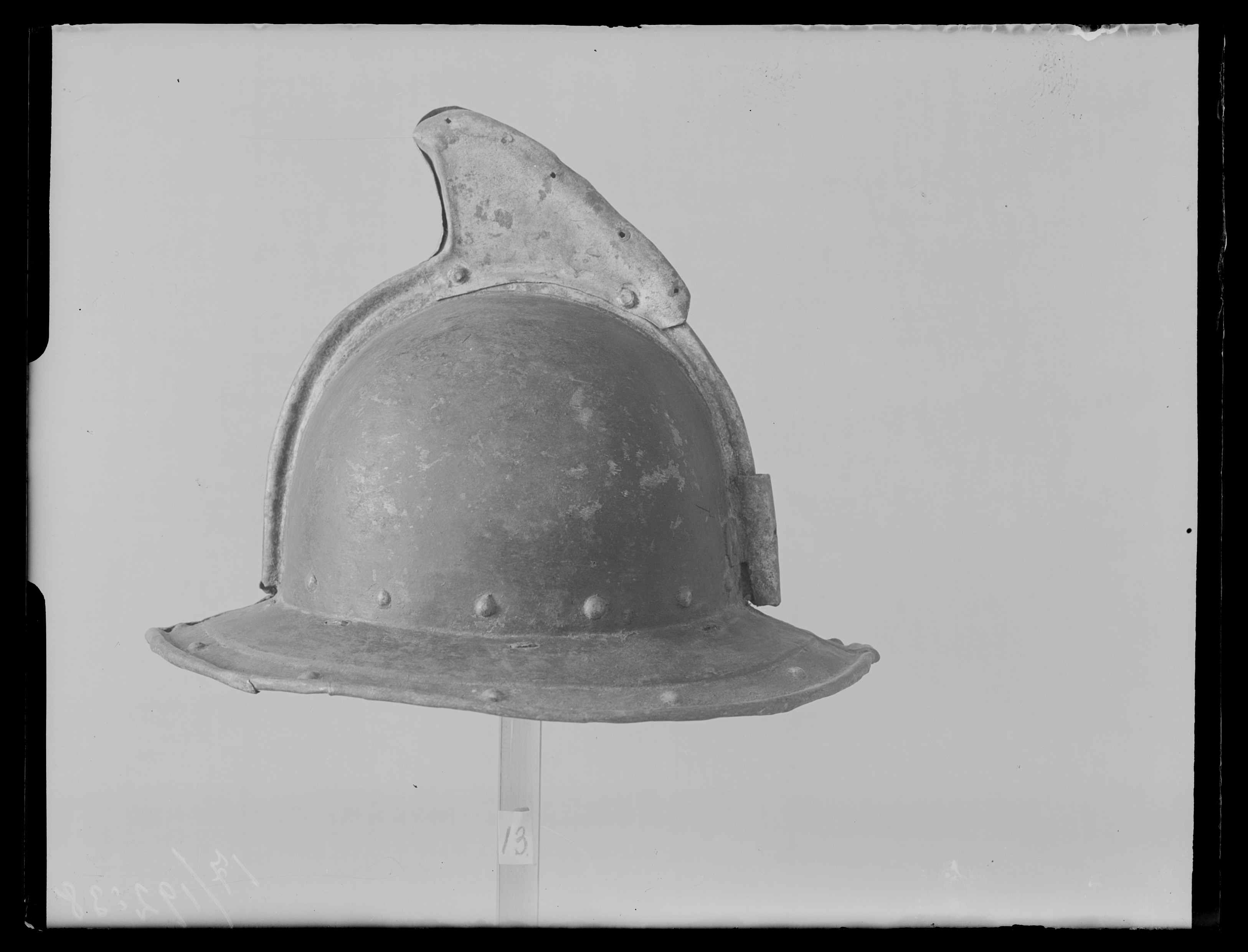 Av driven stålplåt. Utsidan målad svart med nederkant, kamkant och vinge ursprungligen guldgula, tydliga filspår. Insidan med slagmärken. Hjälm bestående av två halvor, sammanfogade i en längsmed klockan löpande kam, omvikt och förstärkt. Klockan rundad. Upptill på kammen är en senare (under 1700-talet) nitad dekoration i form av en trekantig något framåtsvängd vinge av bleckplåt, av två halvor fäst i kammen med två nitar. Nertill övergår klockan i ett brätte, något neddraget med invikt rundsmidd kant och försänkt bård med falska uppdrivna nitar. På klockan baktill en plymhållare, H 59 mm, nedåt avsmalnande med ett hål, fäst med två nitar. I klockan nertill på var sida nitar i rad. I kanten där brättet möter klockan är en rad av små slagna hålpar hela vägen runtom. I klockan mitt på är ett liknande hålpar, ett på var sida kammen. I brättet framtill ett hål, strax höger om detta punsad stämpel av symbol liknande ett V med ett uppåt utskjutande kors. Hjälmfoder av grov lärft, hopsytt av två halvor. Under detta en stoppning av linblånor. Fodret är fastsnört i brättetts hålpar med linnetråd.