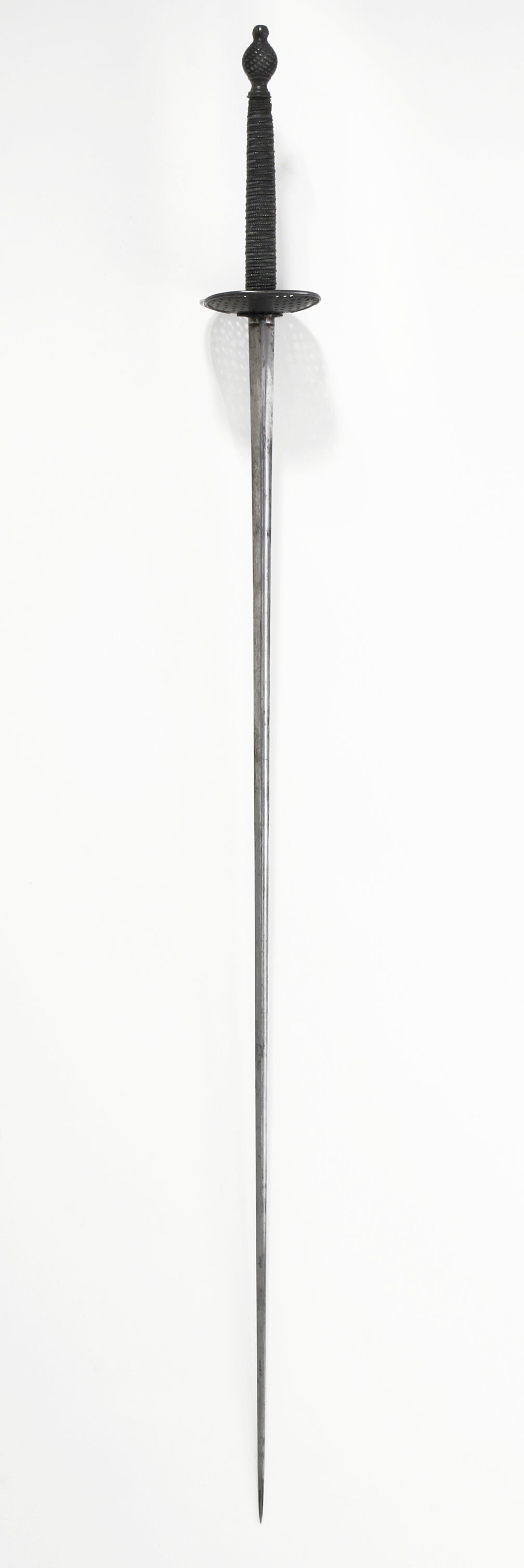 Fäste av mörkanlöpt stål. Knapp med oval kontur och runt tvärsnitt, ornerad med rombiskt rutmönster i relief. Nitknapp hög med insvängd hals. Parerplåtar symmetriskt njurformiga med ytmönster av genombrutna, runda hål. Kavel med mjukt rektangulärt tvärsnitt, klädd med gråsvart fiskskinn, glest lindad med mörkanlöpt. tunn, tvinnad ståltråd. Lindningen tätare upptill och nedtill. Klinga treeggad, s. k. stukatklinga. Vid klingbasen två otydliga stämplar varav den ena ett krönt B. Nedtill på klingans bredsida etsat i skrivstil: "Manuf.re de Klingenthal Coulaux ainé & Co".