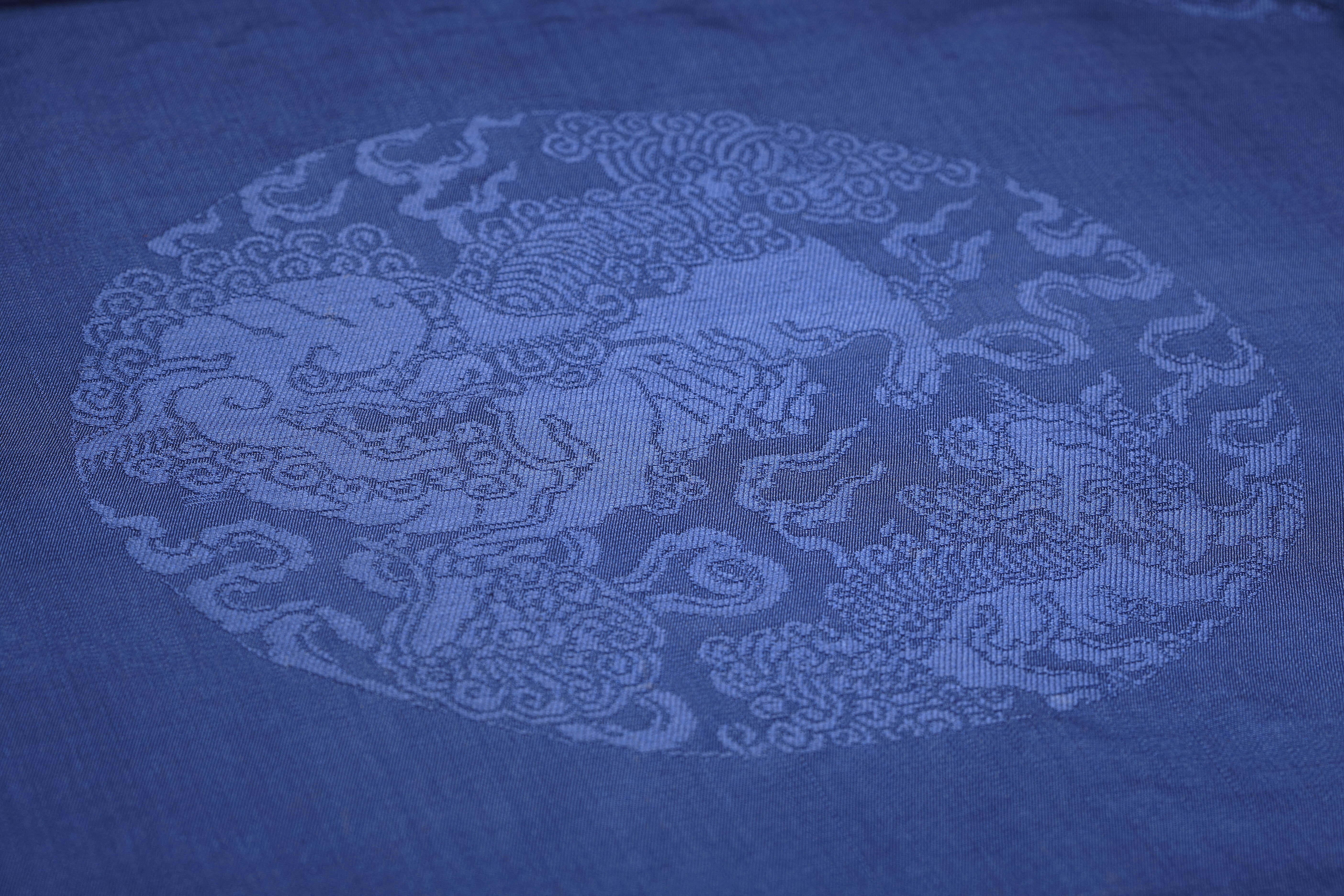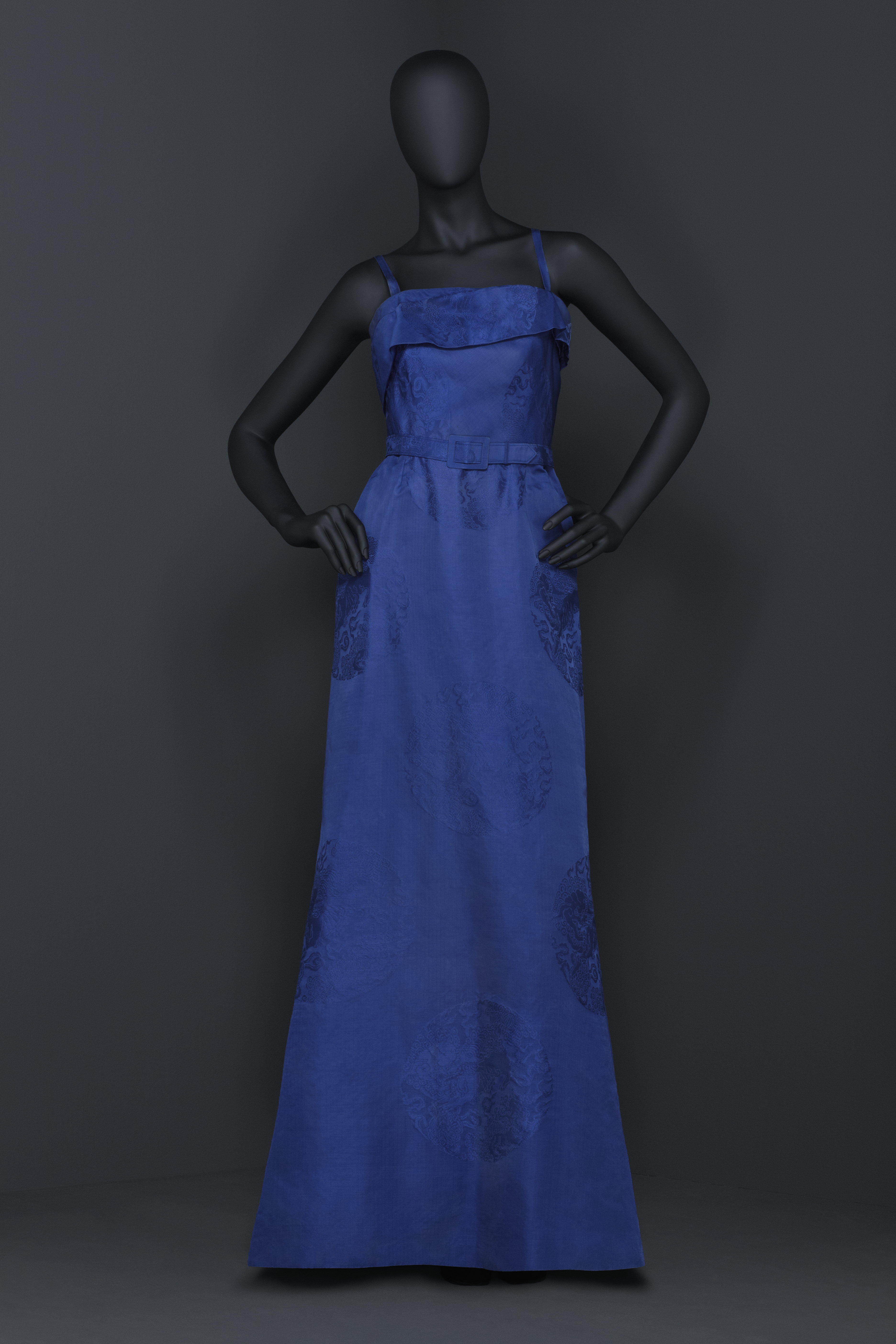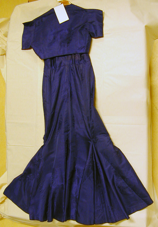 Hellång klänning av kornblått kinesiskt siden. Mönster i form av invävda 210 mm i diameterrunda medaljonger med lejon. Klänningen tillskuren med livsöm. Hel framvåd och delad rygg. Livet med rak ringning. Utmed ärmhålorna dubbla snedställda bystveck, utgående från livsömmen. Runt ringningen en 90 mm bred nedvikt, snett applicerad kant. 14 mm breda, tunna axelband. I vardera sidan samt bak två insydda fjädrar. Foder i livet av beige siden. I midjan invändigt ripsband 20 mm brett, knäppt mitt bak med hakar och handsydda hyskor. 305 mm lång dragkedja mitt bak. Kjol med en våd fram, 770 mm bred samt två våder bak, 365 mm breda. I sidsömmen nedtill 2 infällda kilar. Den ena 580 mm nedifrån, den andra 450 mm nedifrån. Fållen 30 mm bred. Handkastade sömmar. Tyget inköpt av kung Gustav VI Adolf. Firmaetikett: "AB Fr. Thunborg & Co // STOCKHOLM".