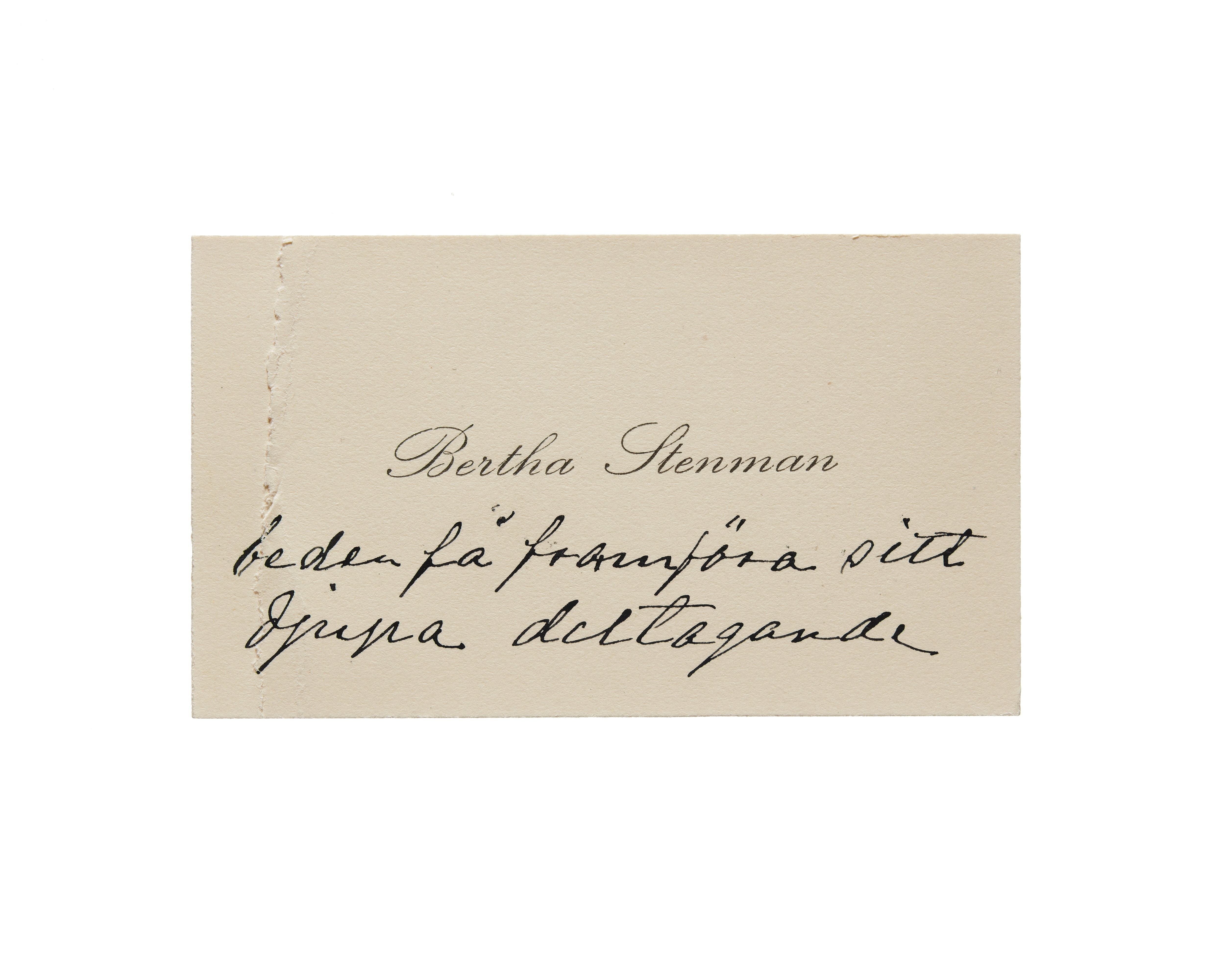 Ett visitkort från Bertha Stenman, f. Andersson, daterat 1924. Handskrift "beder få framföra sitt djupa deltagande". Vikt in vänstra sidan.