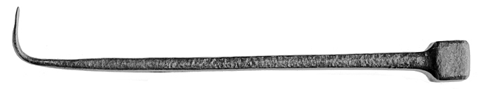HOVSKRAPA (skrap- och bultjärn) Platt skena med något rundade kanter, ena änden spetsigt utsmidd och omböjd i nästan rät vinkel till en hake. Motsatta änden stukad till en fyrsidig klump, med fasade hörn. Förfärdigad efter beställning av Walther von Hallwyl hos J. A. Johansson, hovslagare vid Kungl. Lifgardet till häst, Stockholm.