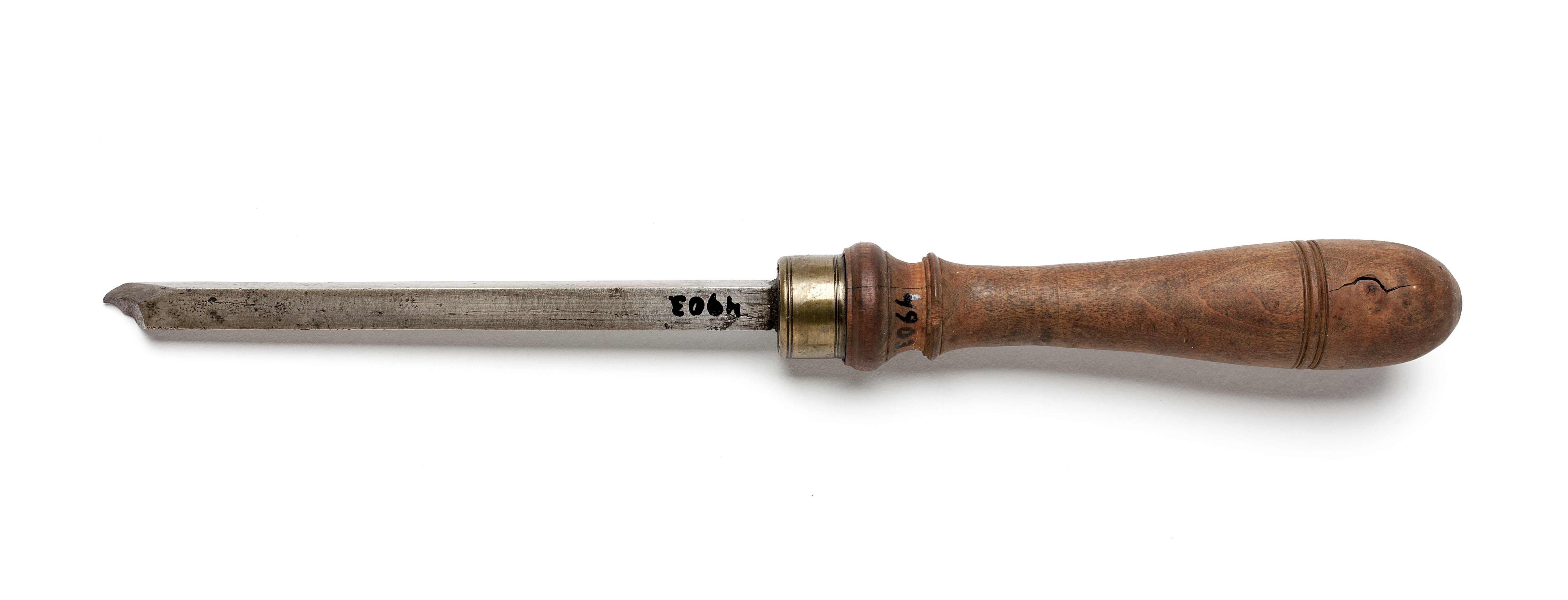 Klinga med rektangulär genomskärning. Spetsig egg med ena sidan svagt böjd, andra sidan vågformig. Svarvat skaft av päronträ med två vulster nedtill ("rydboholmstyp"). Mässingsring.